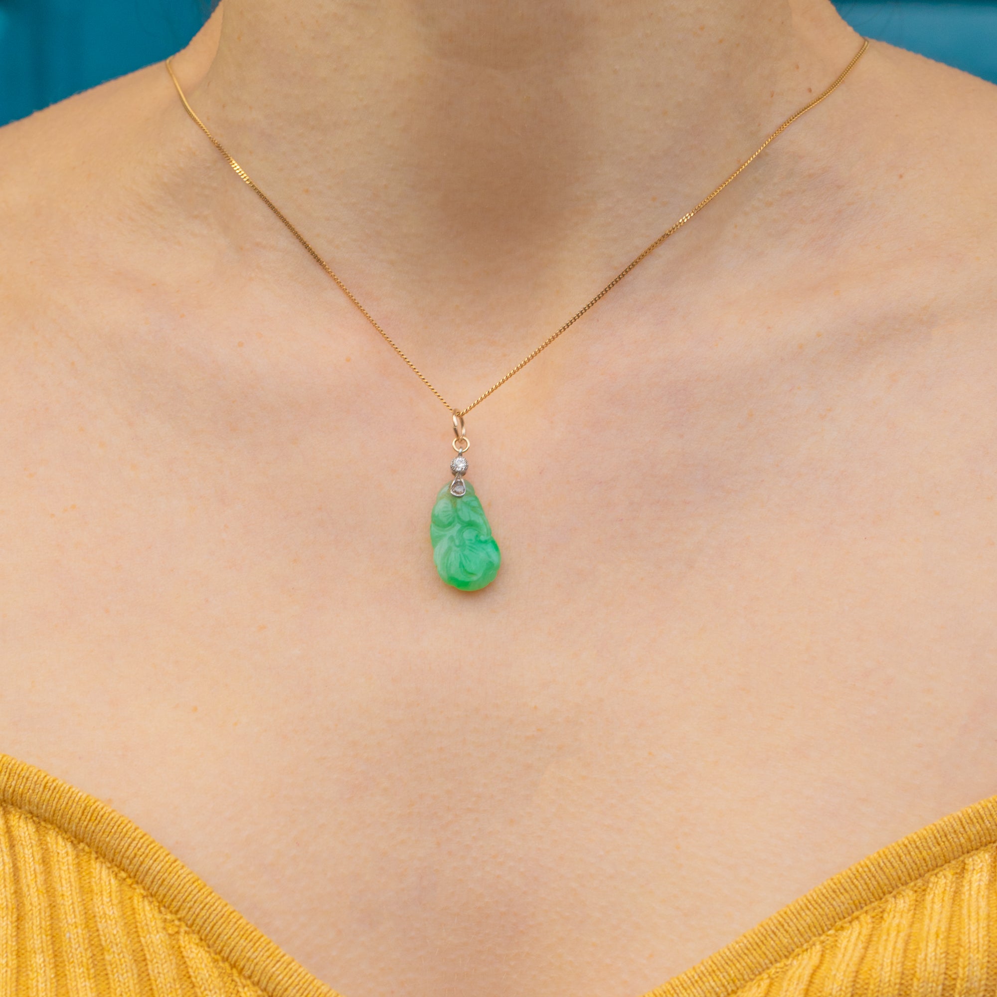 VERY GOOD This Art Deco Platinum Carved Jade Diamond Pendant is in very good condition, with only minor signs of wear consistent with its age. One of the Diamonds shows slight wear, including a small fleabite, but this does not detract from the overall beauty and impact of the piece. The Jade and Platinum remain in excellent condition, retaining their timeless allure.