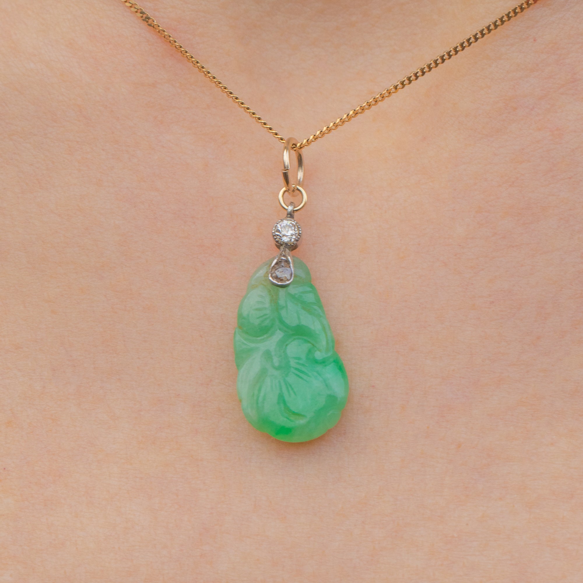 VERY GOOD This Art Deco Platinum Carved Jade Diamond Pendant is in very good condition, with only minor signs of wear consistent with its age. One of the Diamonds shows slight wear, including a small fleabite, but this does not detract from the overall beauty and impact of the piece. The Jade and Platinum remain in excellent condition, retaining their timeless allure.
