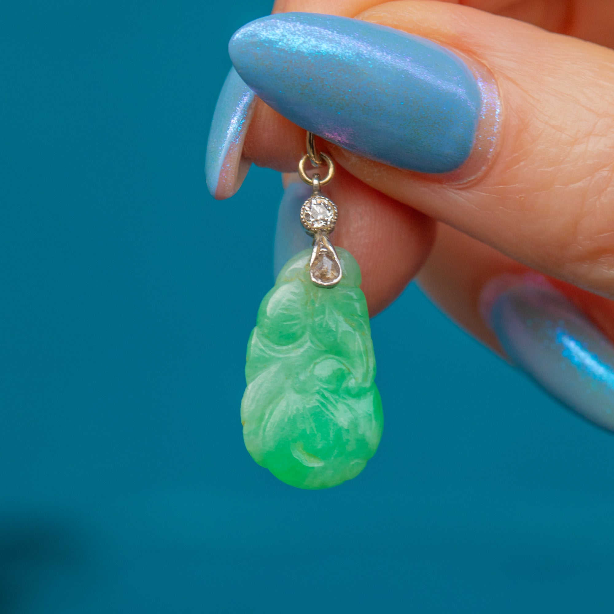 This exquisite piece is masterfully crafted, showcasing a captivating carved Jade centrepiece with intricate detailing and lush, verdant hues. The Jade is gracefully complemented by two shimmering Diamonds that shine delicately beneath the bale, set in a glowing Platinum, adding just the right touch of sparkle.