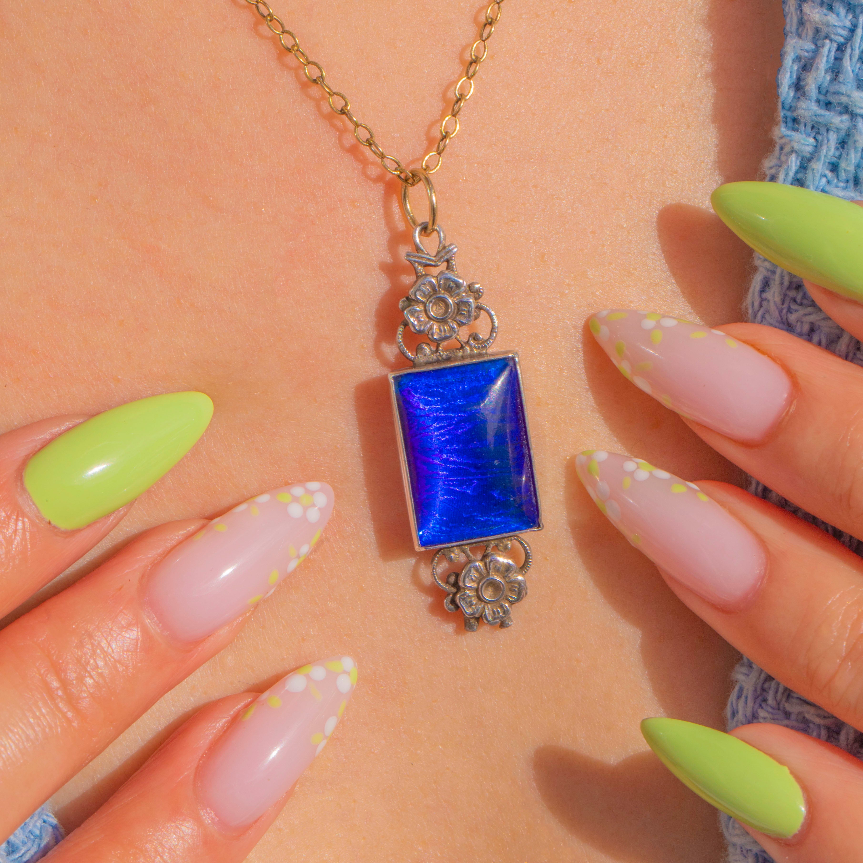 A striking Art Deco Silver butterfly wing pendant, alive with an intense cobalt-blue glow. The rectangular, slightly domed wing panel sits within a fine closed-back bezel, framed by delicate pierced floral and scroll terminals that add romance to the clean Deco geometry. Refined and elegant, it catches the light with mesmerising movement.