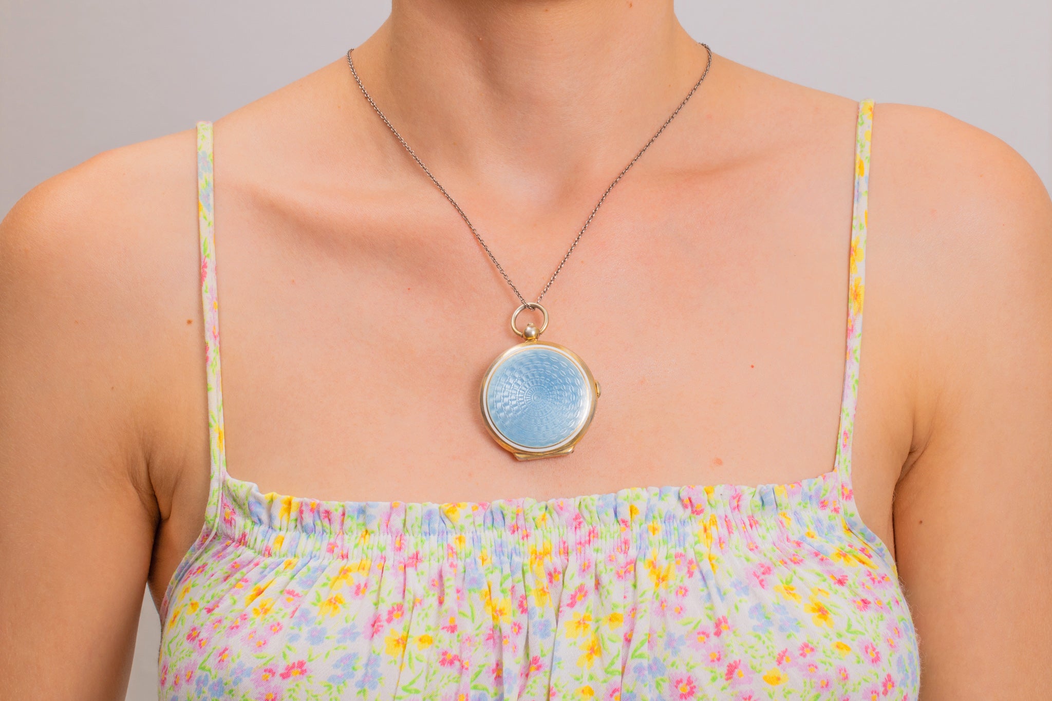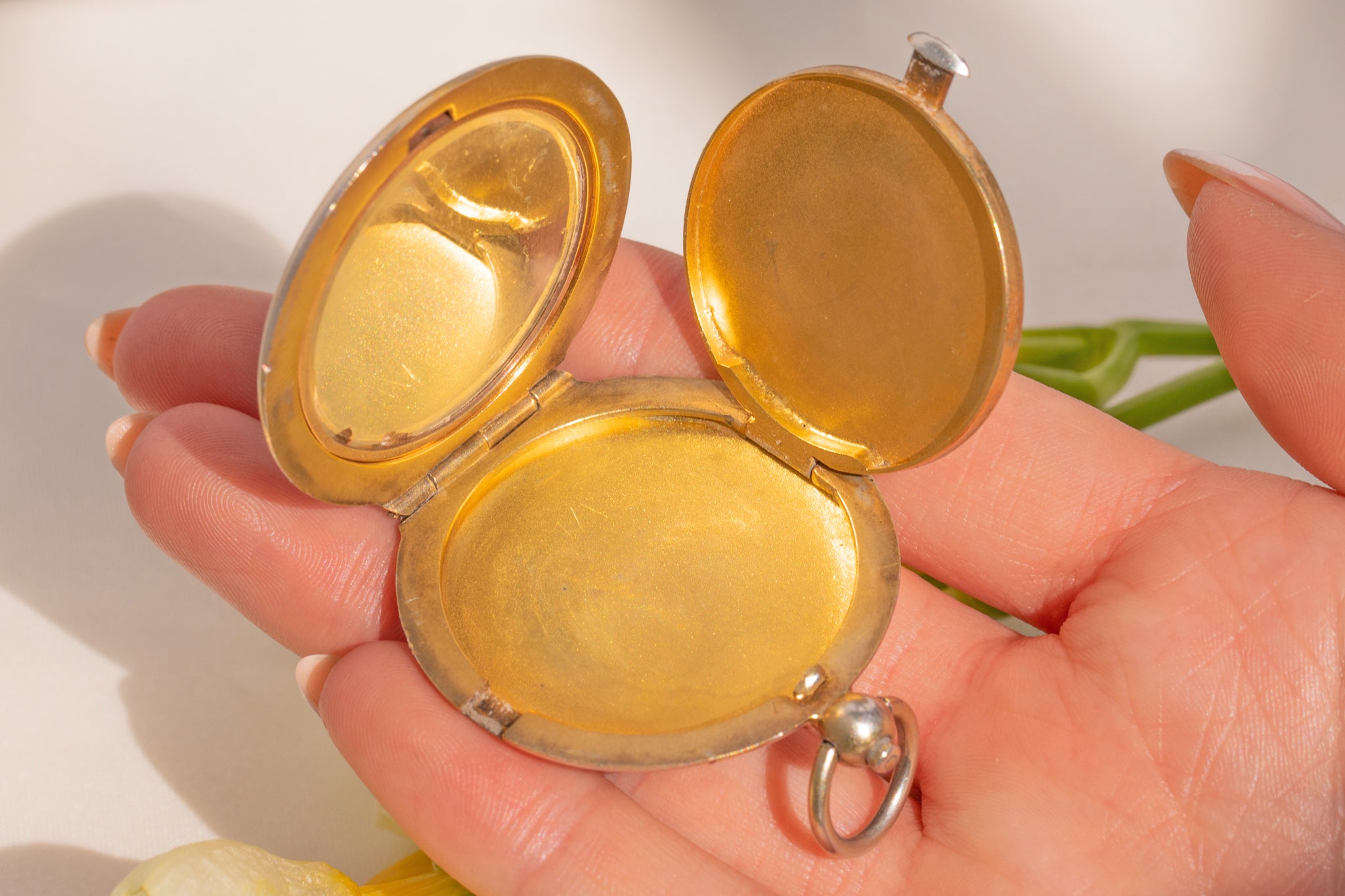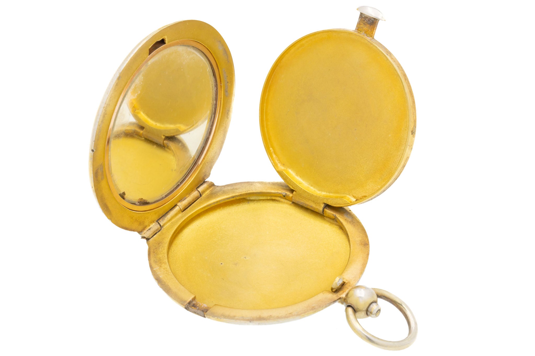 As you press her button at the top, she effortlessly springs open to reveal a mirror and a secret hideaway where you pop a precious photograph inside. Click her shut and place it inside your bag or affix her to a chain around your neck so she's in reach for all essential touch-ups!