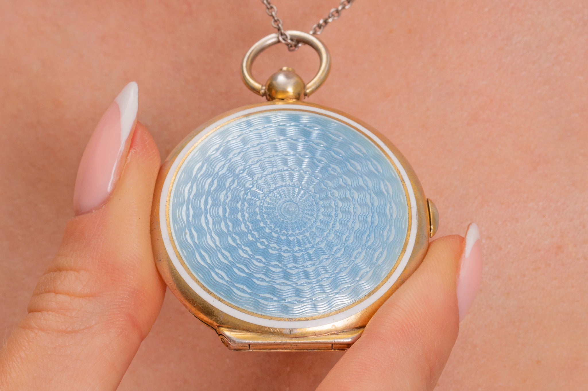 VERY GOOD: This Art Deco Silver blue Guilloché Enamel mirror compact is in very good condition throughout. Her opening and closing button mechanism is fully functioning, she springs open and shuts with an all-important "click". Although her Silver has surface wear including a few scratches and dings, her pale Blue Guilloche Enamel remains in immaculate condition. Inside, her layer of 18ct Gold has subtle surface wear, however, the mirror is secure and her door opens smoothly to reveal a little compartment! A truly beautiful Deco treasure that you can carry around every day. If you don't want to take her on your travels, she will be the star of the show poised on your dressing table.