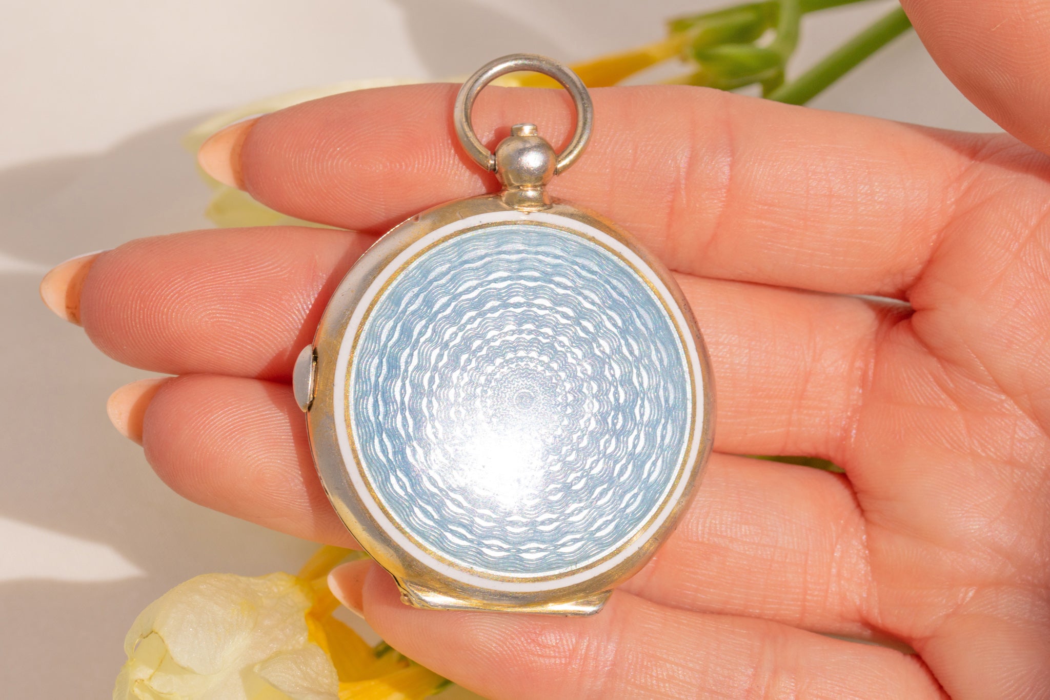 Art Deco Silver Blue Guilloché Enamel Mirror Compact Pendant