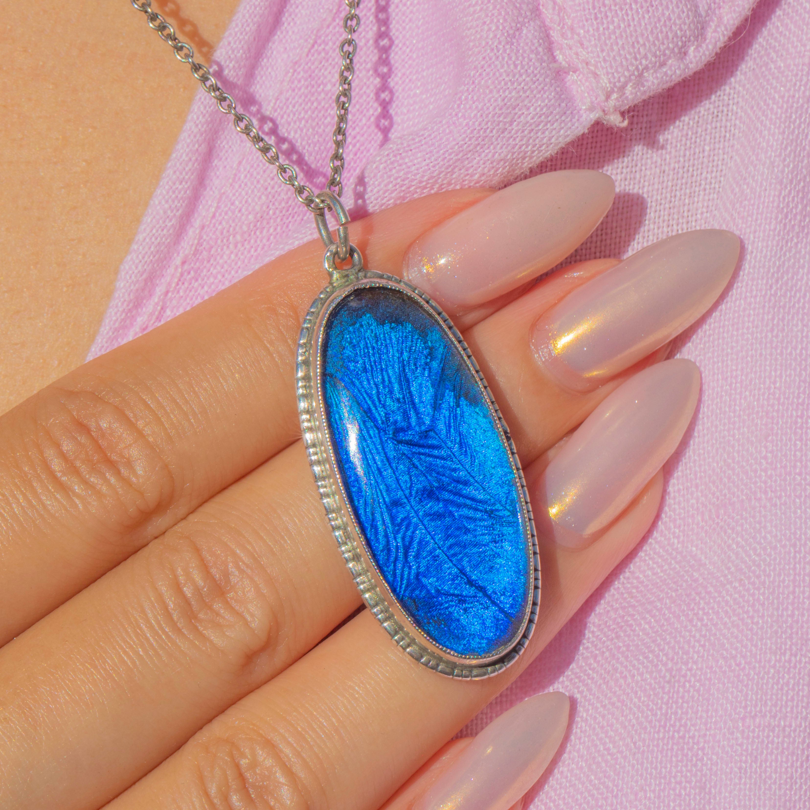 This striking Art Deco pendant captures the era’s love of colour and clean geometry, showcasing a vivid blue butterfly wing beneath a smooth oval cover. The wing’s natural iridescence shimmers from peacock teal to electric azure as it moves, framed by a crisp, beaded Silver bezel and a simple bale for everyday wear.