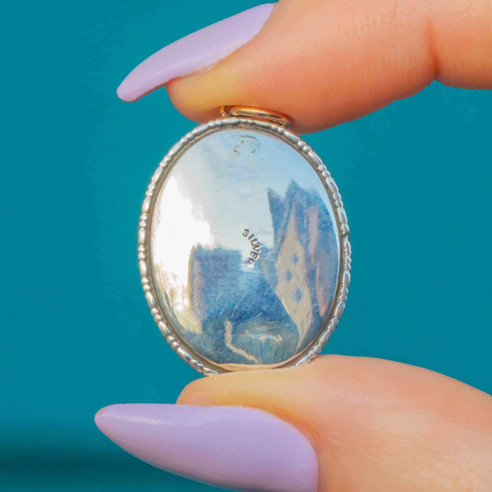 EXCELLENT. This Art Deco Silver butterfly wing pendant is in excellent condition. The butterfly wings are pristine with lovely shimmering hues and are securely set. The Silver is bright and has accrued a rich patina within the details giving a dramatic finish. The back of the pendant is smooth and feels comfortable resting against the chest allowing you to enjoy wearing this eye-catching piece of Art Deco jewellery, while making a statement wherever you go!