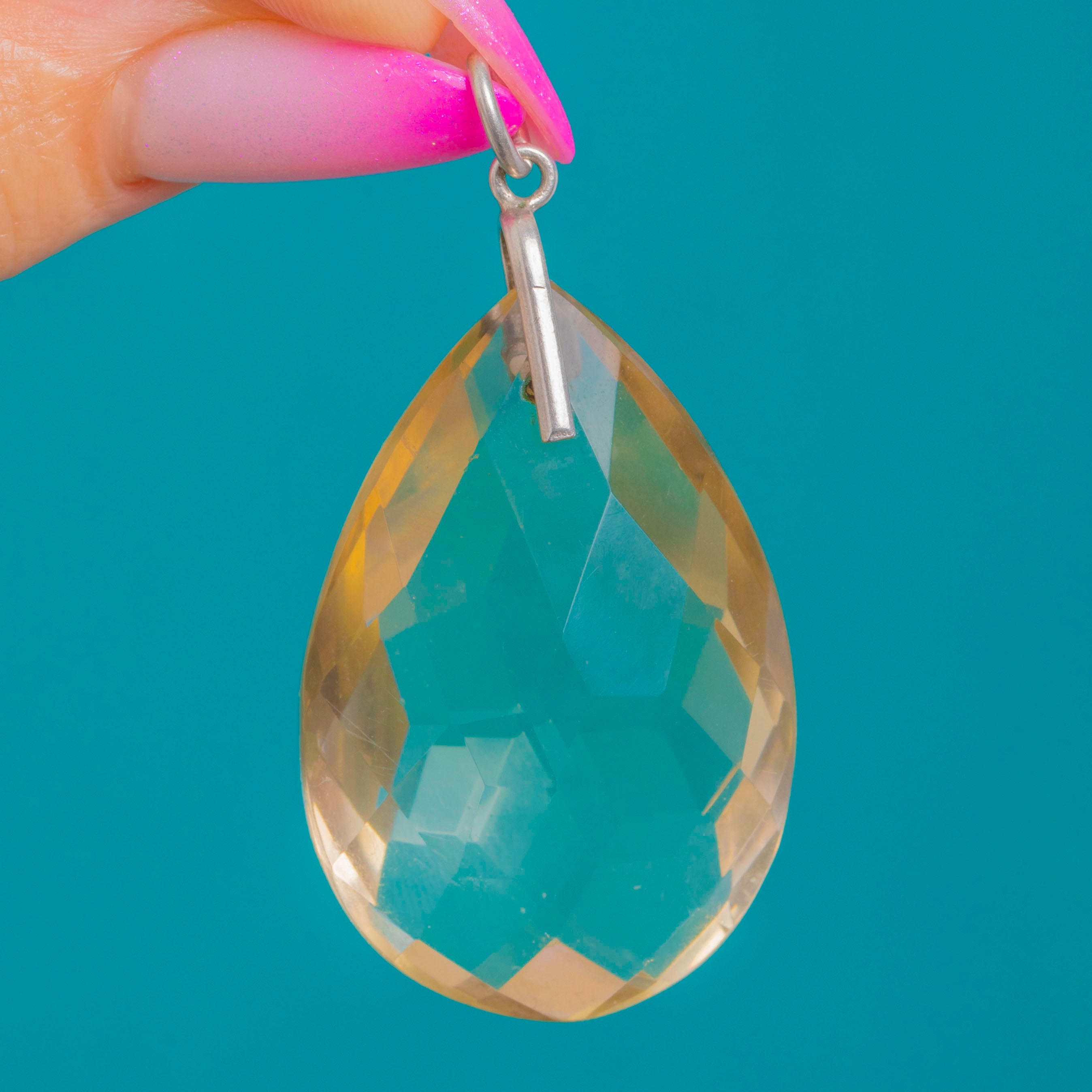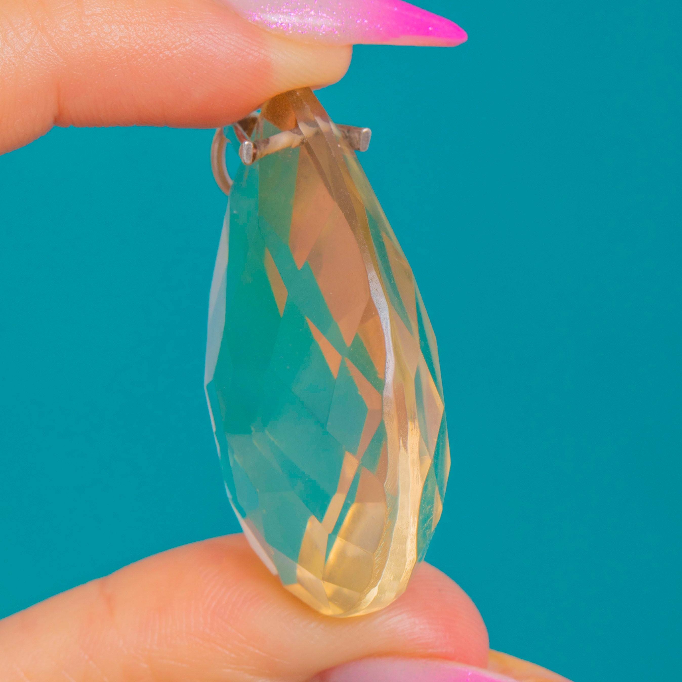 A glorious Art Deco Citrine briolette pendant, showcasing a sumptuous pear-cut gem of remarkable presence. The Citrine glows with warm golden tones, its crisp faceting catching the light with every movement. Simple Silver fittings frame the drop with elegant restraint, letting the colour and clarity take centre stage.