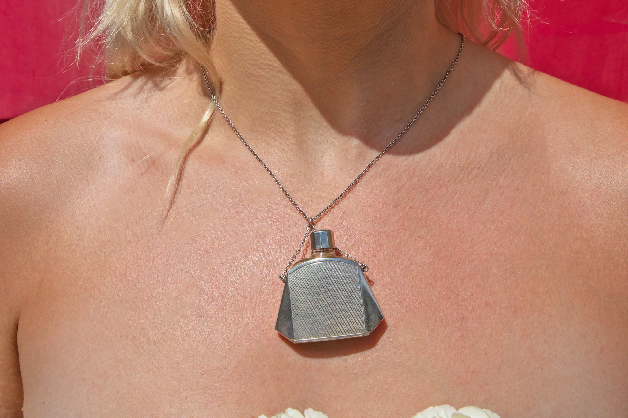 There are so many ways to enjoy this Art Deco Silver Glass perfume bottle! Wear her as a pendant or admire her as a collectible for your vanity set! Her Glass perfume bottle is safely encased in a wonderful 835 Silver sleeve.
