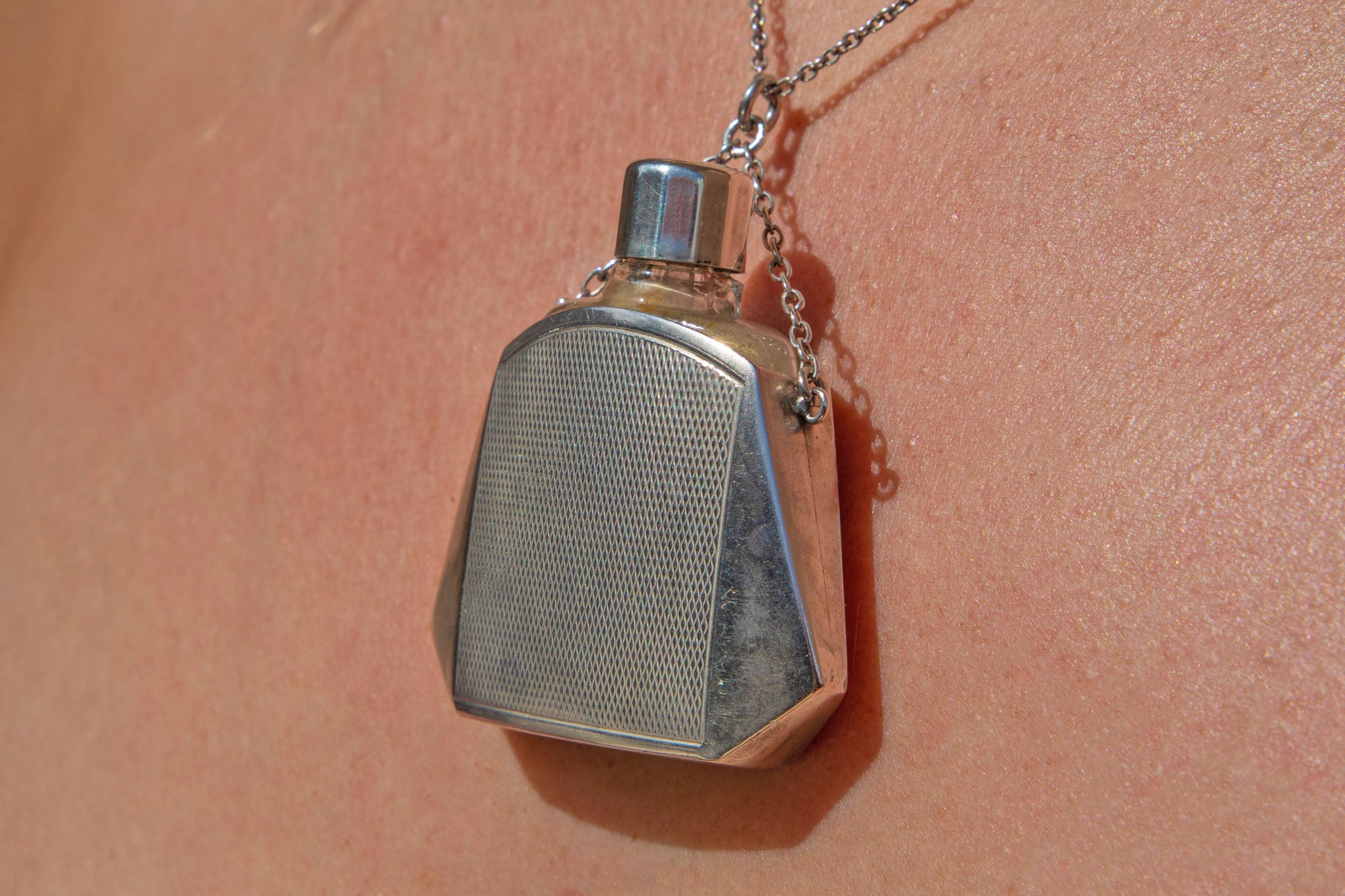 VERY GOOD: This Art Deco Silver Glass perfume bottle is in very good condition throughout. The 835 Silver has minor surface wear with a ding present on the base of the bottle, however this is not visible when worn! The bottle is fully functioning, the lid fully unscrews and stays secure so you can fill her up with your favourite perfume.