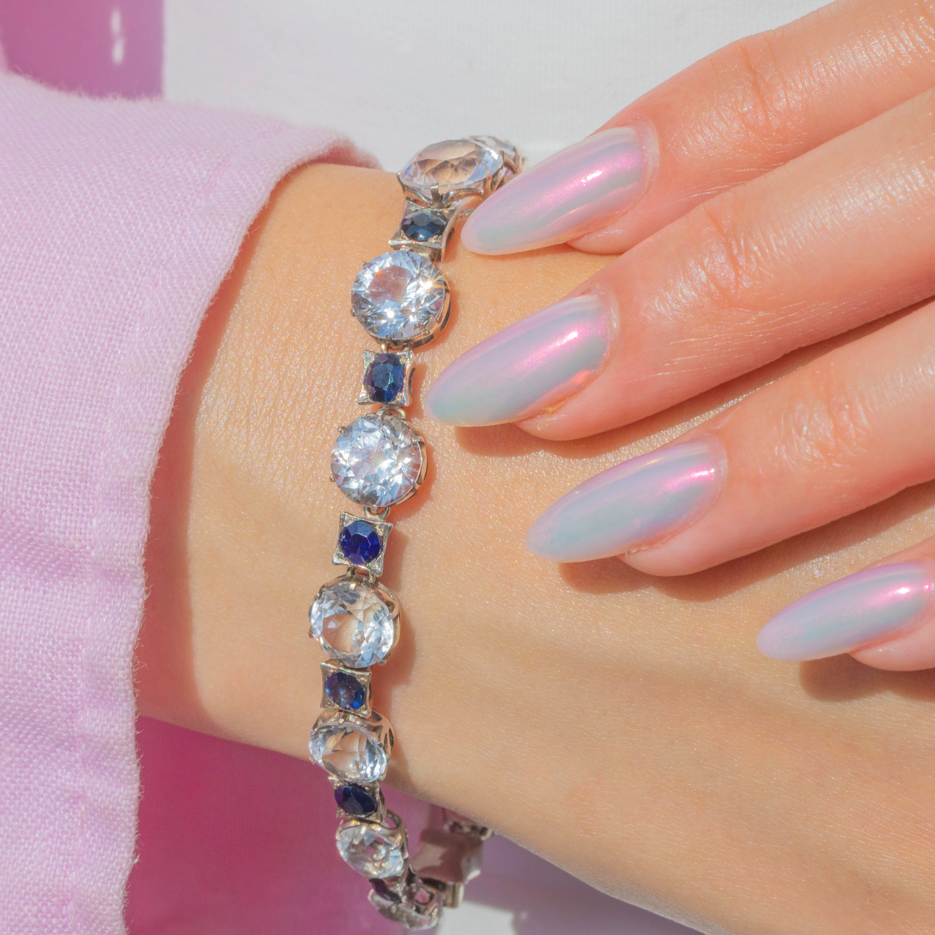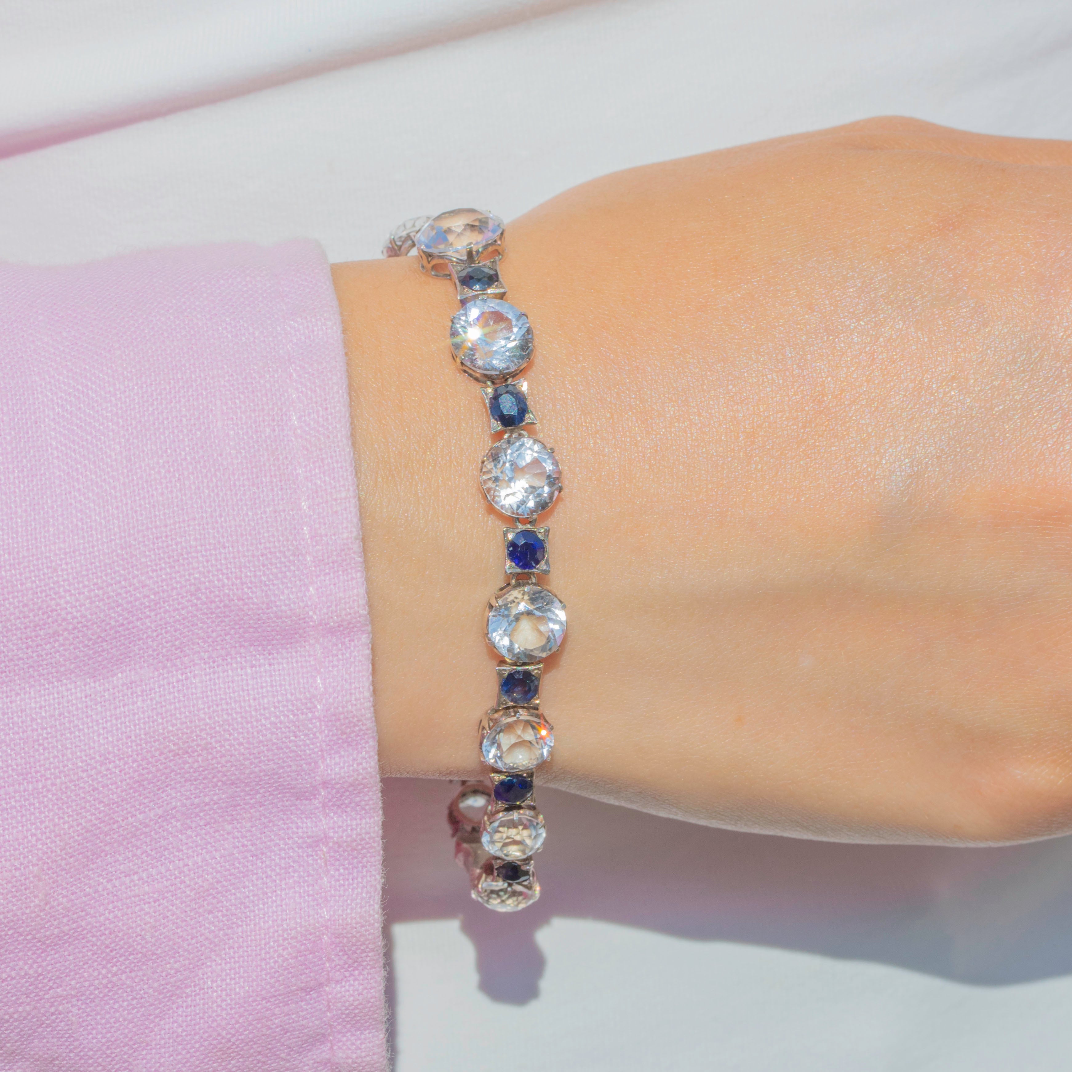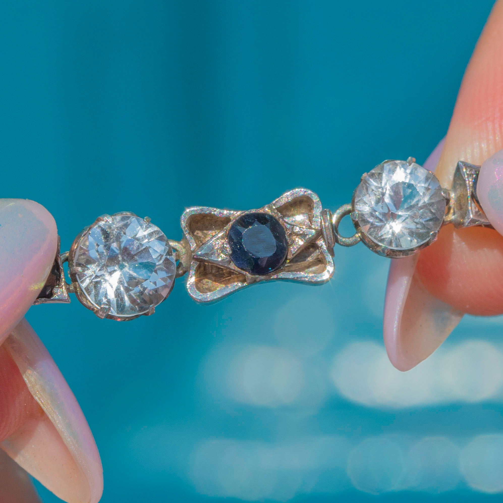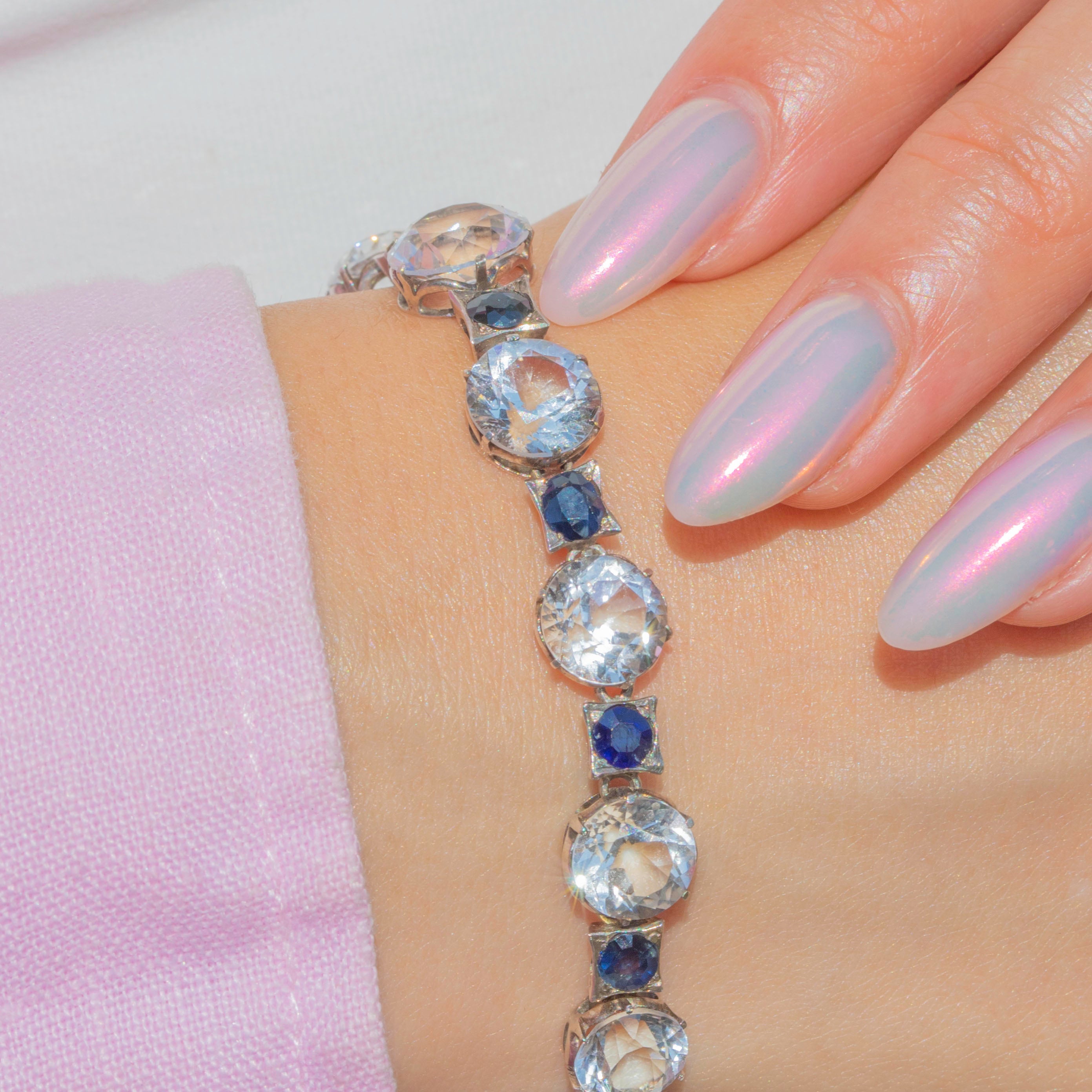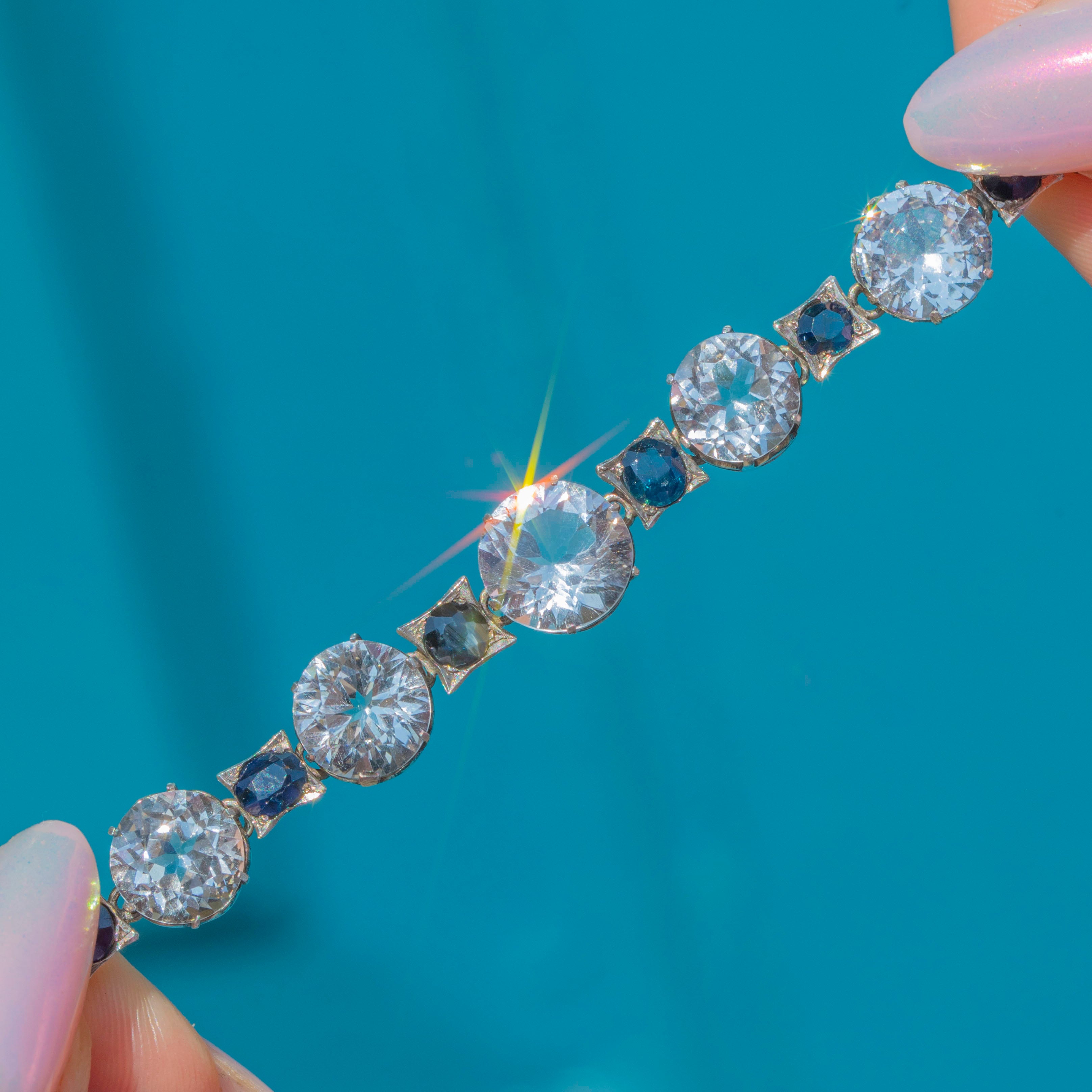 EXCELLENT: Each gemstone is radiant, with both the White Topaz and Sapphires free from any notable signs of wear and held securely in their Silver settings. The bracelet links are uniform and firmly connected, and with her clasp in perfect working order, this Art Deco bracelet can be worn with utmost confidence.