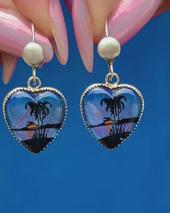 These are a special pair of Art Deco Silver tropical scene butterfly wing heart earrings! Inlaid beneath the island scene are precious Morpho butterfly wings, boasting a beautiful blue luminescence.