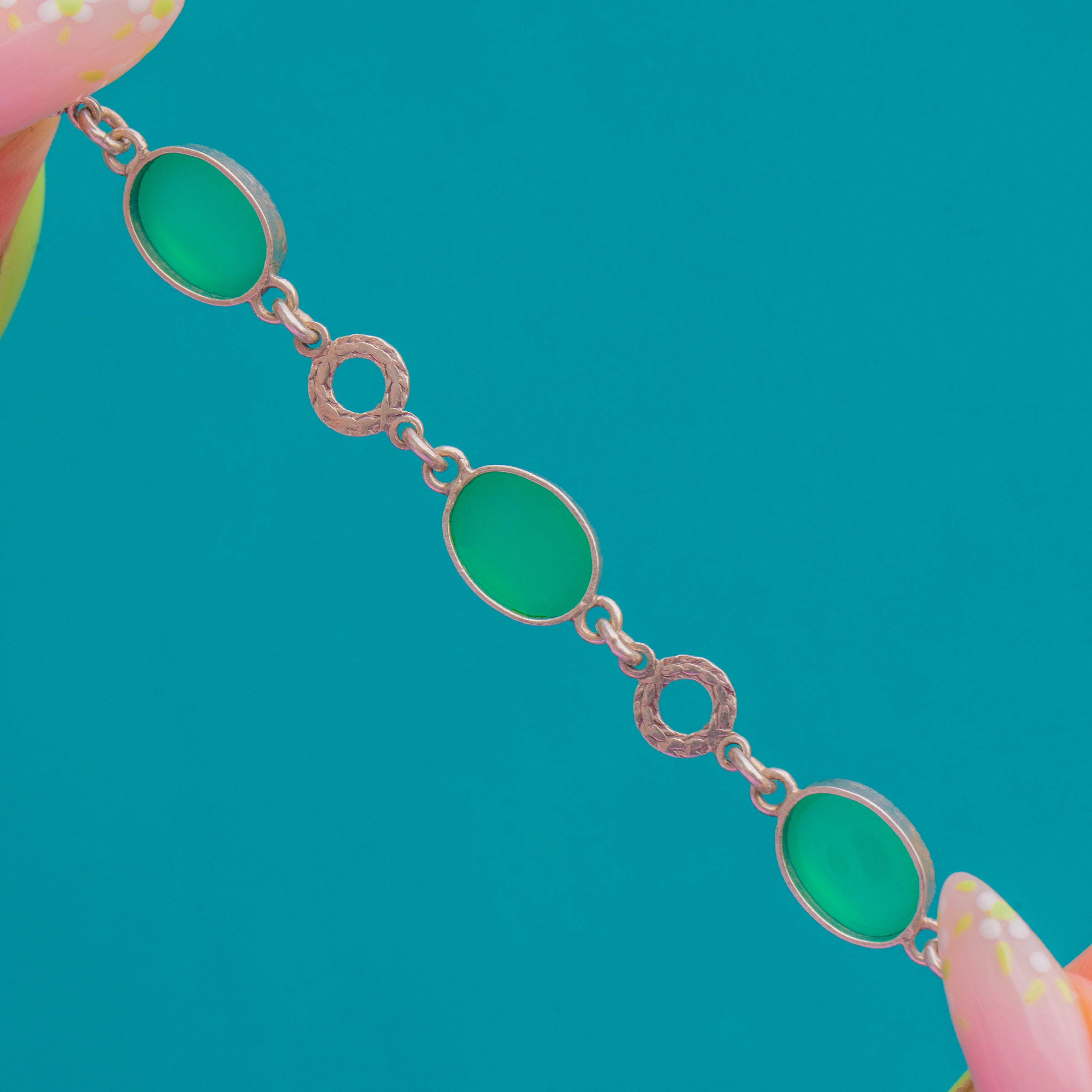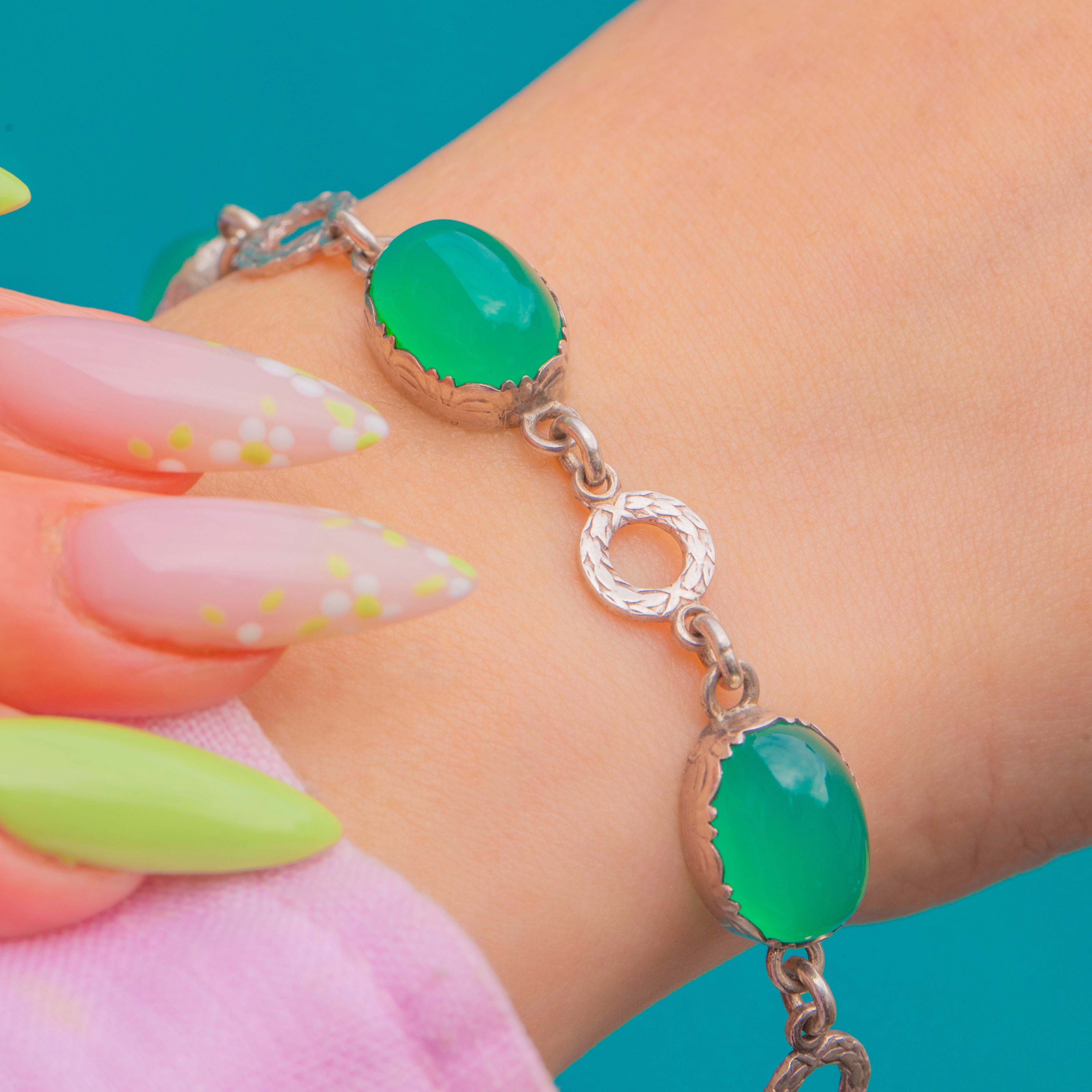 Elegant and unmistakably Art Deco, this Sterling Silver bracelet showcases a rhythmic sequence of bright green Chrysoprase cabochons. Each oval, domed gem is cradled in a scalloped bezel and spaced with engraved circular “wreath” links, creating a refined play of shape and texture as the bracelet moves on the wrist.