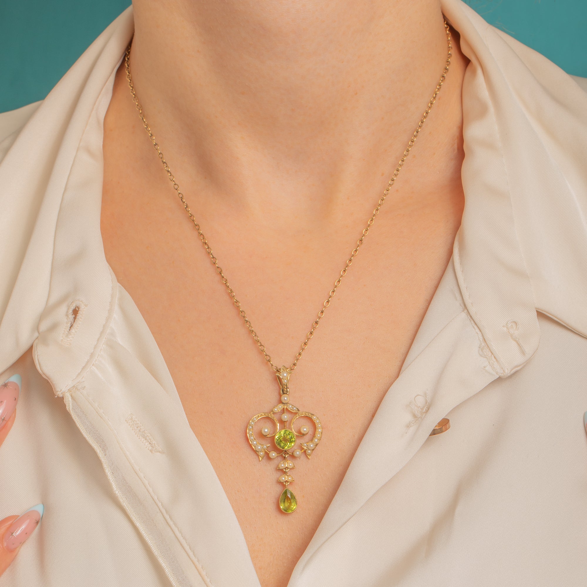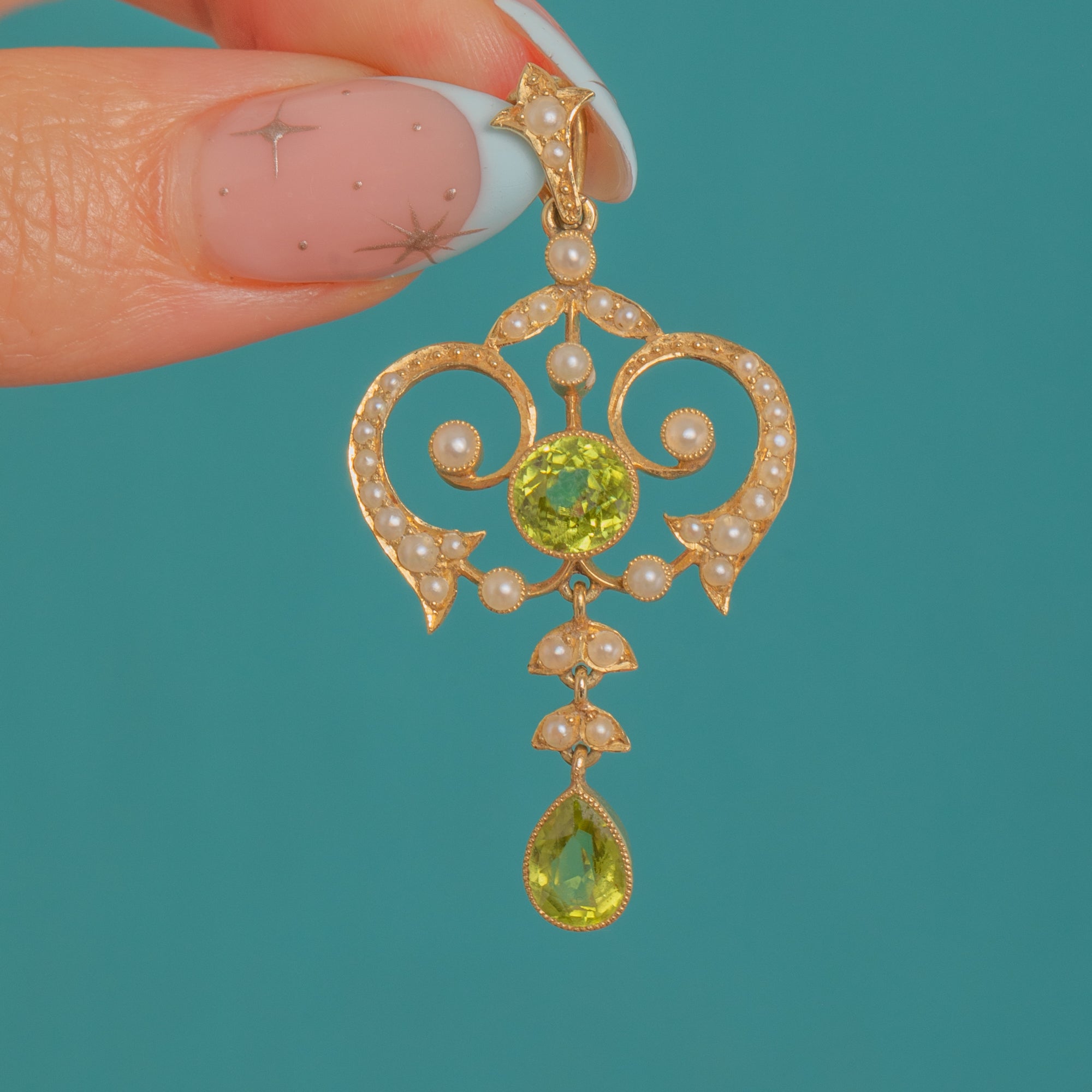 A luminous Art Nouveau pendant crafted in rich 15ct Gold, its airy openwork design swirling with romantic heart‑like scrolls and delicate milgrain beading. A vivid apple‑green Peridot crowns the centre, while a gracefully articulated pear‑shaped Peridot drop dances below, the whole framed by tiny creamy Pearls in trefoil flourishes.