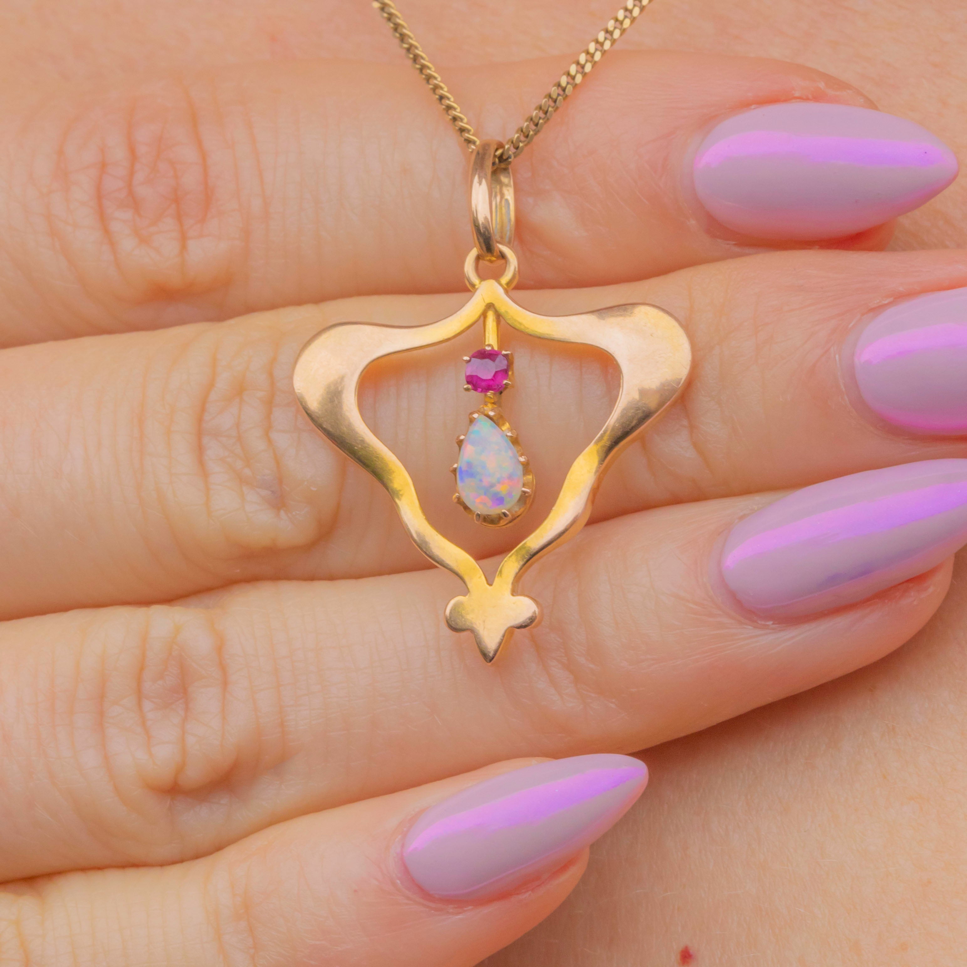 This elegant Art Nouveau pendant is crafted in 15ct Gold and set with a luminous Opal cabochon glowing with vibrant flashes of green, blue and orange. Above it sits a bright 2.5mm natural Ruby, adding a perfect touch of colour contrast and warmth.