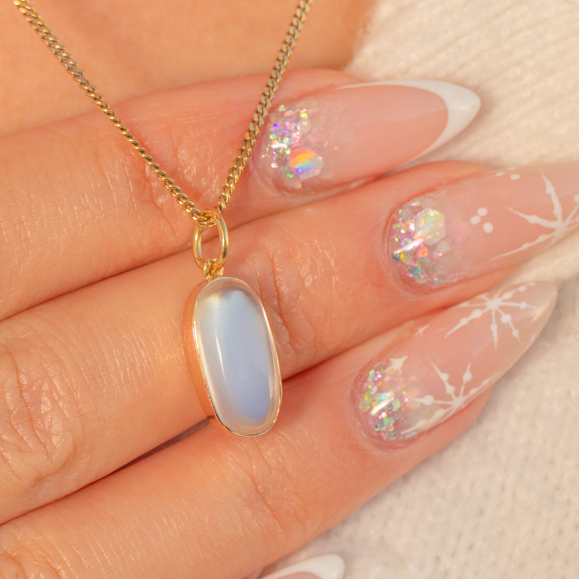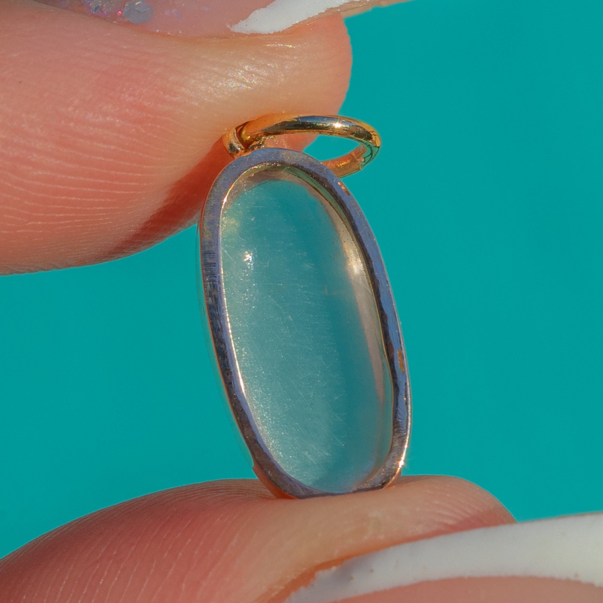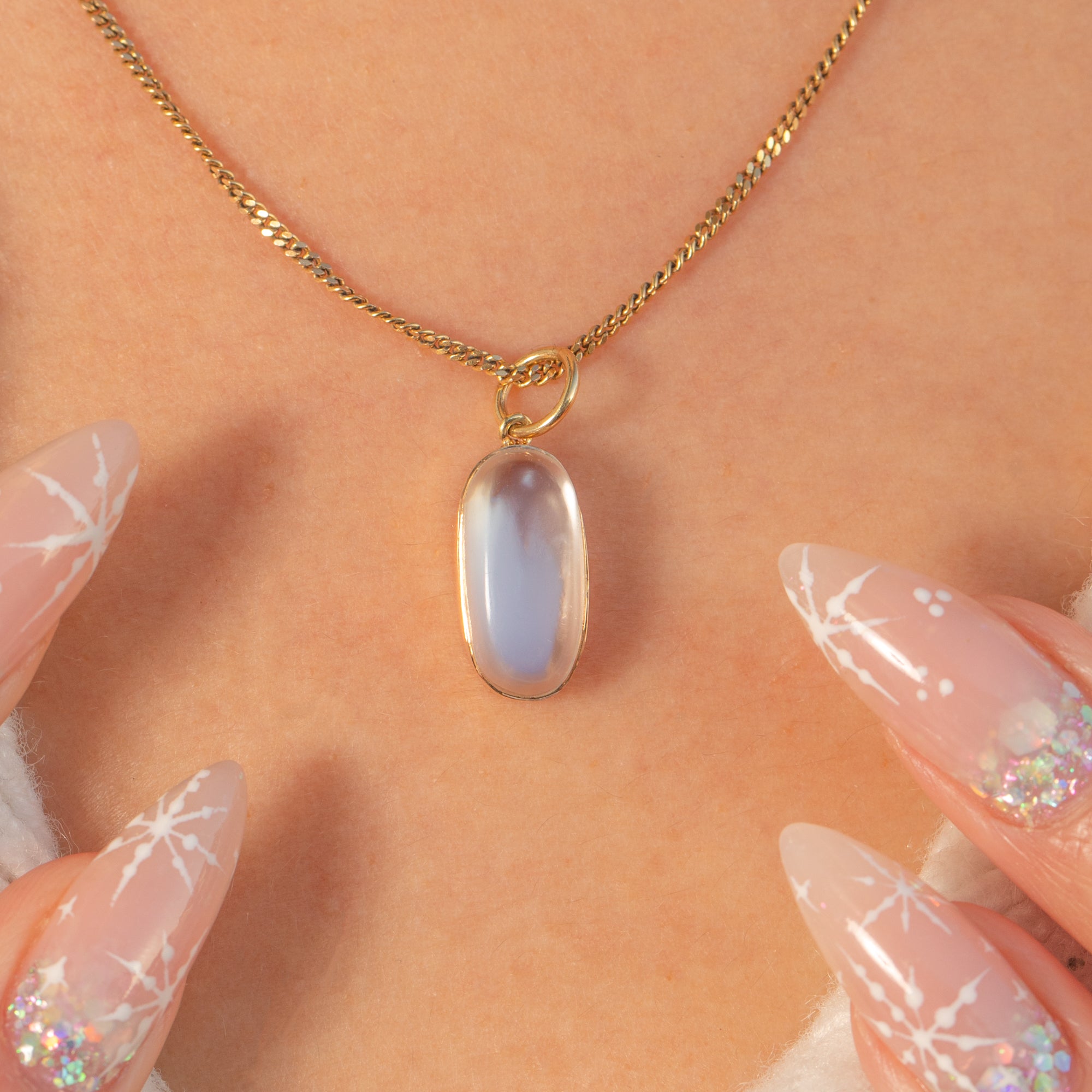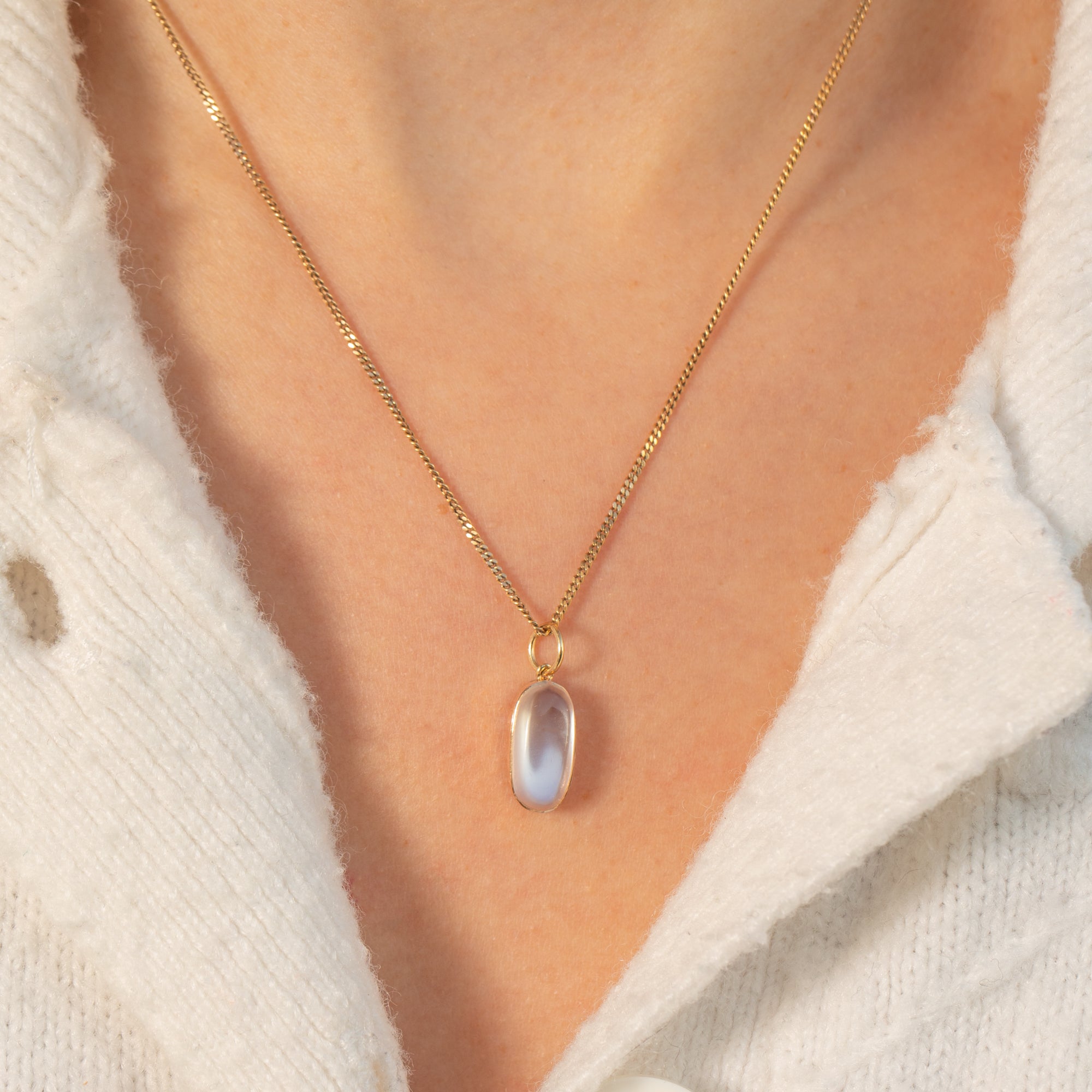 A luminous Moonstone cabochon glows with a soft, icy blue sheen in this petite Art Nouveau charm. The elongated oval stone is embraced by a smooth 18ct Gold rub-over bezel, finished with a simple hasp and jump ring for effortless styling.