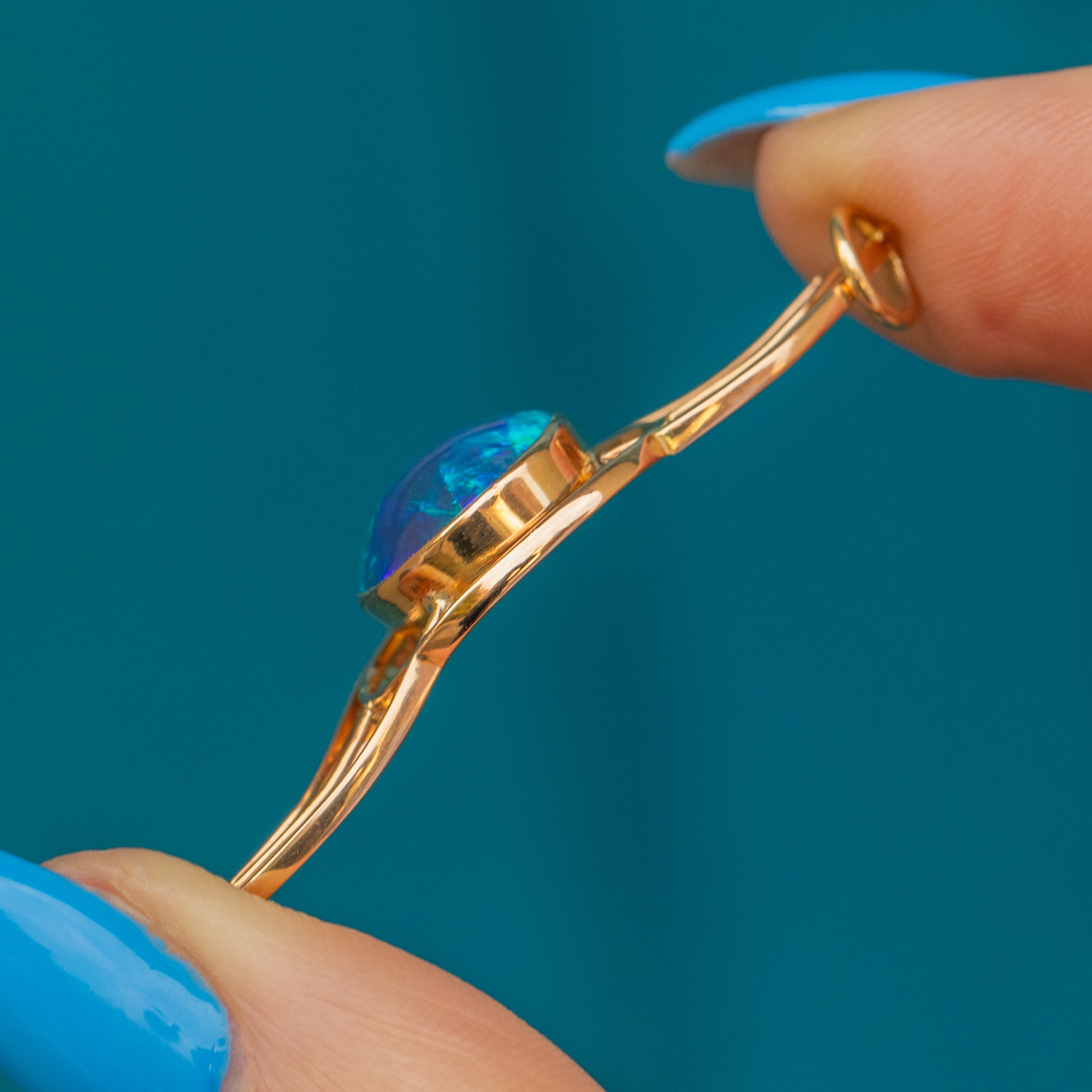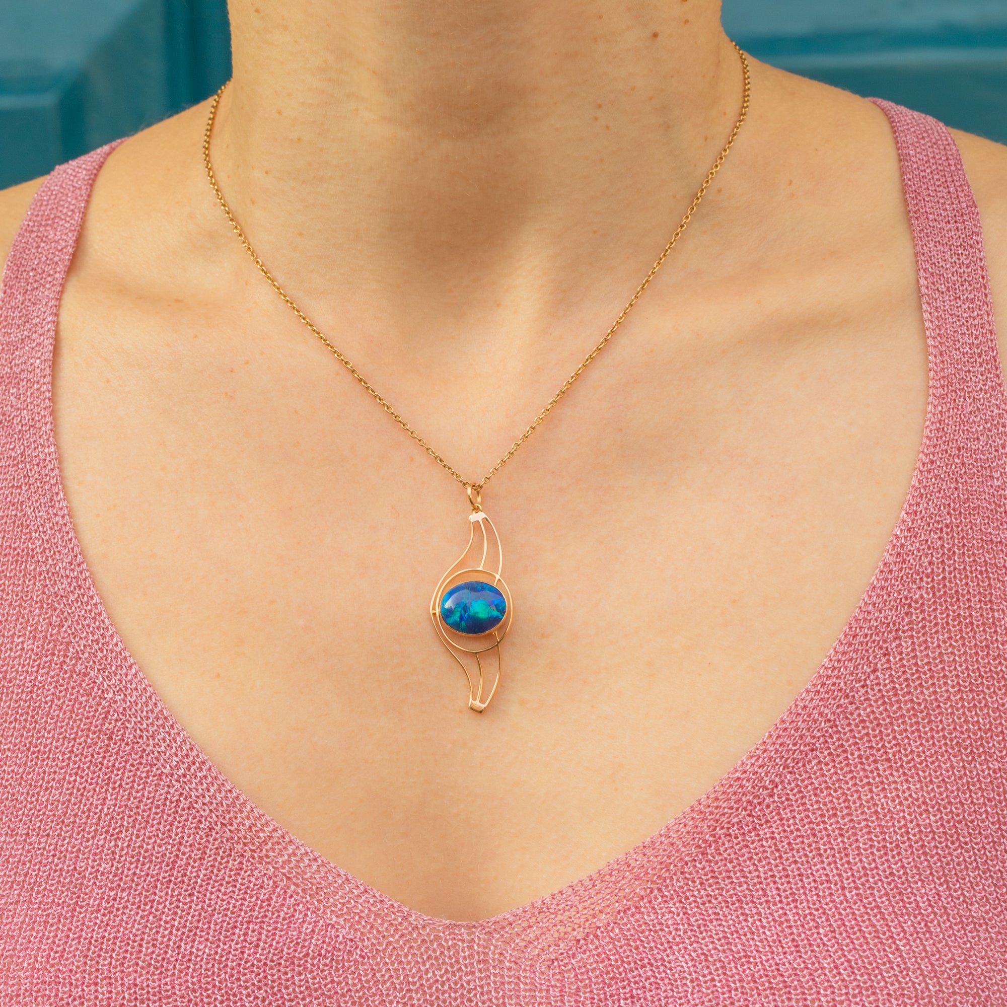 At its heart lies a stunning natural 2.21ct Black Opal, radiating enchanting hues of deep purple and rich greens, with striking flashes of cerulean as she catches the light. The Opal is cradled within a beautifully curved 18ct Gold setting, creating an organic, fluid appearance that dances with movement as she suspends from a fine Gold chain.