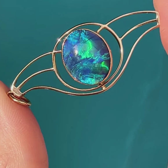EXCELLENT. We are pleased to present this Art Nouveau 18ct Gold black Opal pendant in excellent condition. Her Opal is radiant, without any scratches or nibbles and sits securely within her 9ct Gold bezel. The Gold wire details are smooth and free from dings, having stood the test of time, and promising many more years of wear and enjoyment!