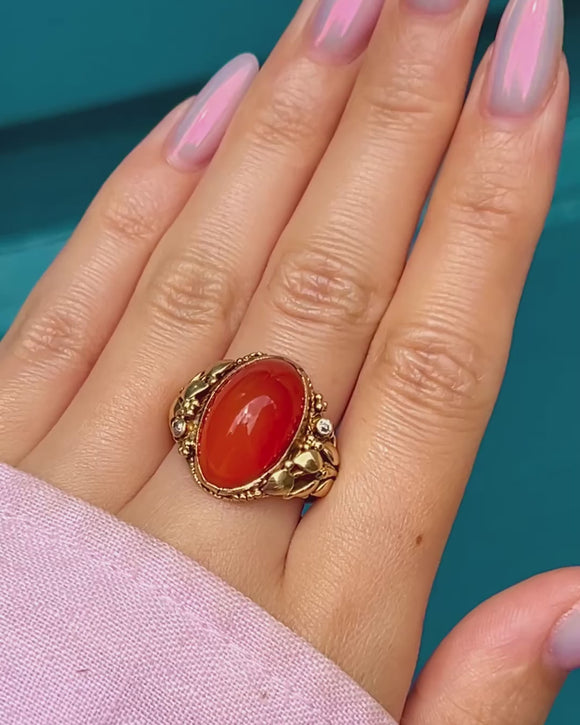 Art Nouveau 18ct Gold Fire Opal Cabochon Diamond Ring, 5.60ct Natural Solid Fire Opal Item added
