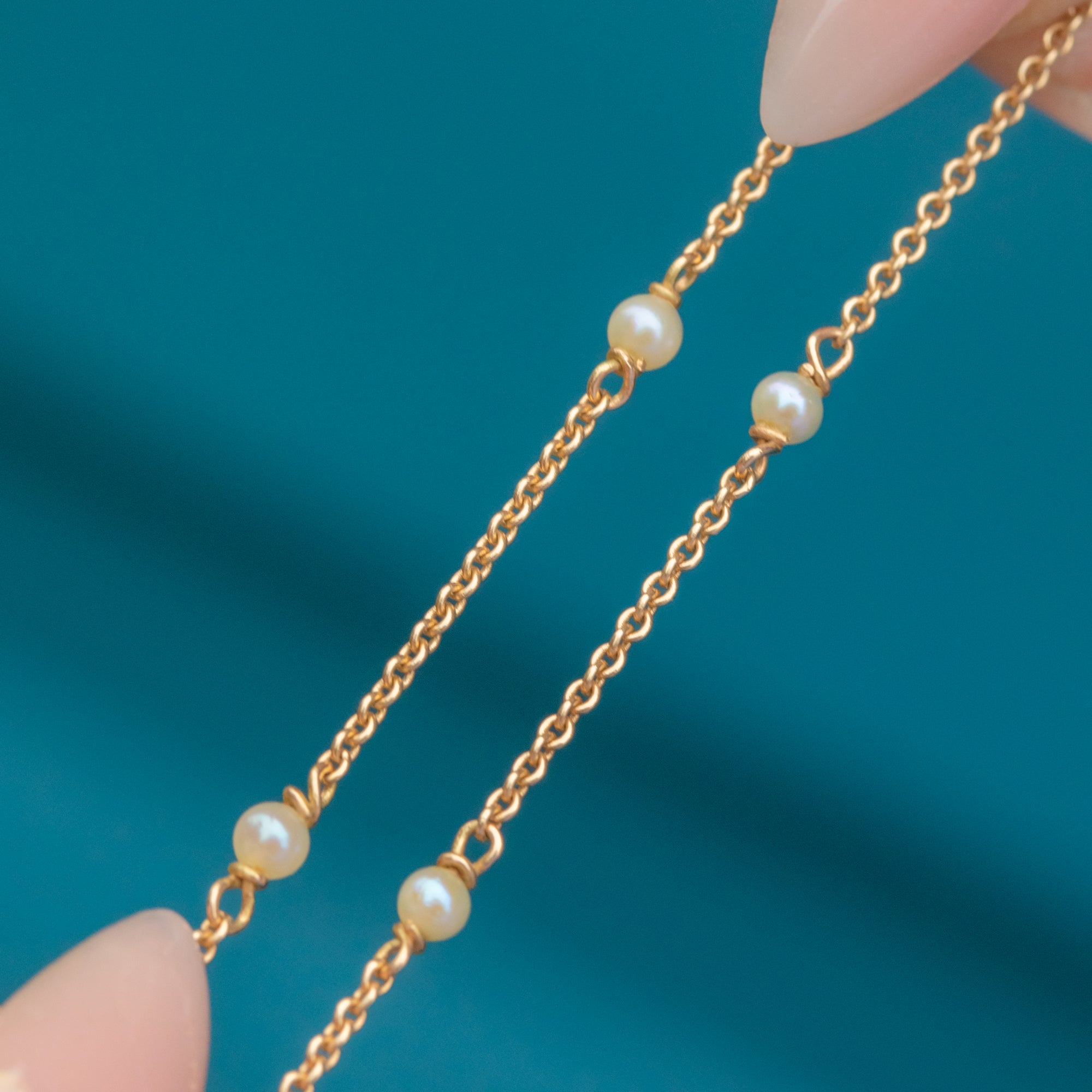 A graceful Art Nouveau necklace crafted with flowing lines and feminine detail. The openwork pendant glows with Pink Tourmalines and luminous Pearls, all set in rich 18ct Gold for a romantic, turn-of-the-century look.