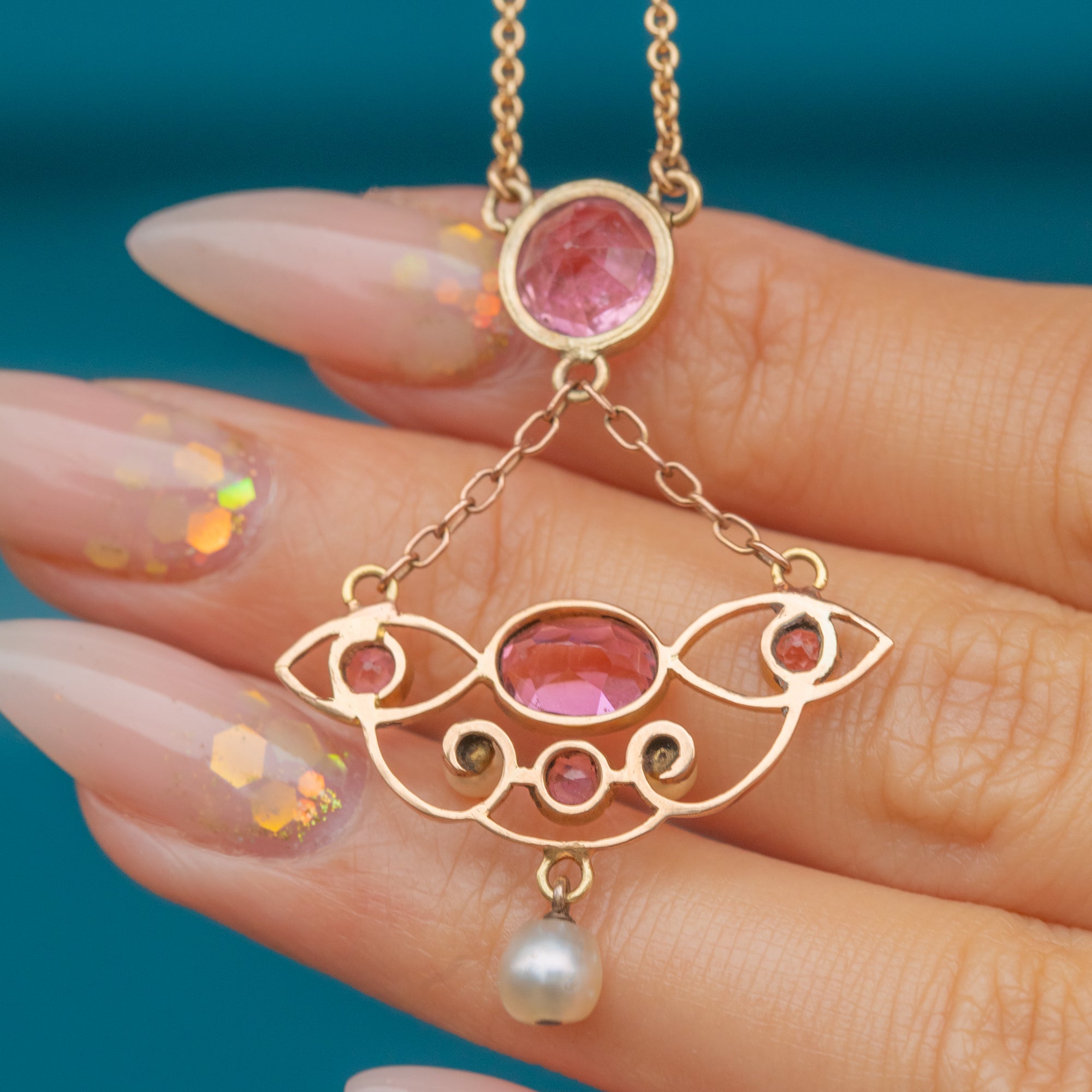 Art Nouveau 18ct Gold Pink Tourmaline Pearl Necklace