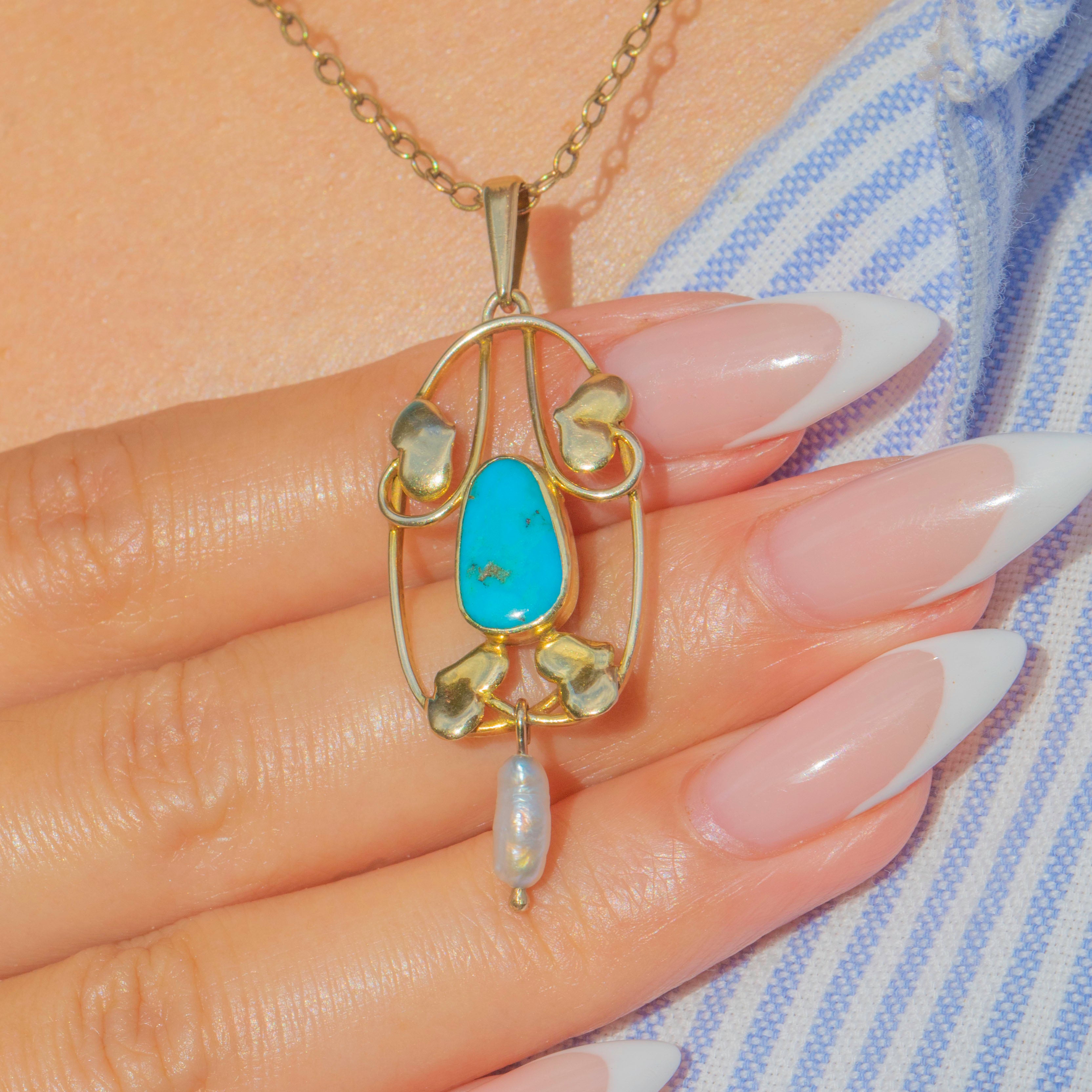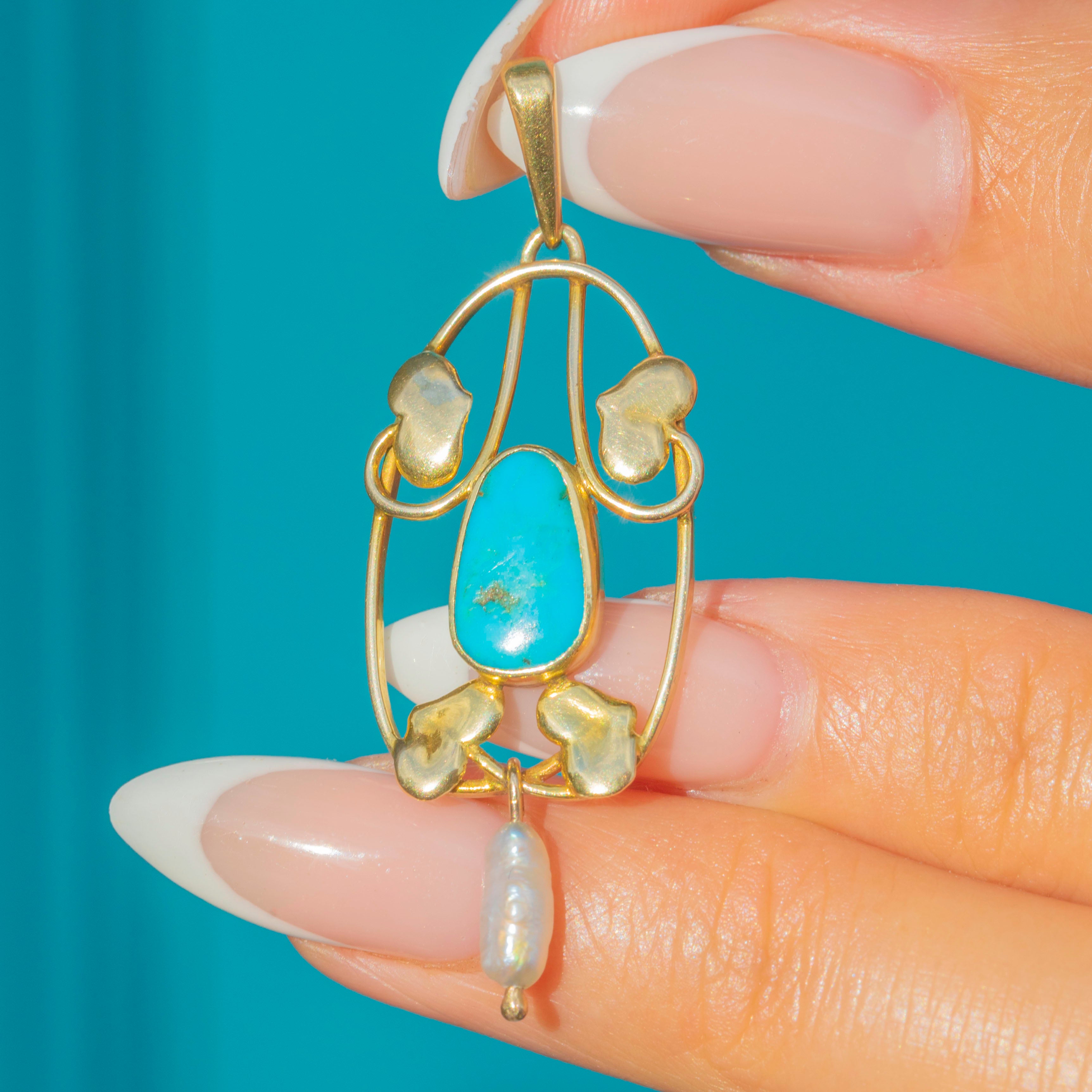 This exquisite Art Nouveau pendant is a joyful celebration of organic form and natural beauty. Crafted in glowing 18ct Gold, it showcases a vivid Turquoise cabochon framed by sweeping foliate curves, finished with a lustrous Pearl drop that sways delicately with movement. The dreamy palette of oceanic blue and creamy white perfectly captures the free-spirited elegance of the Art Nouveau era.