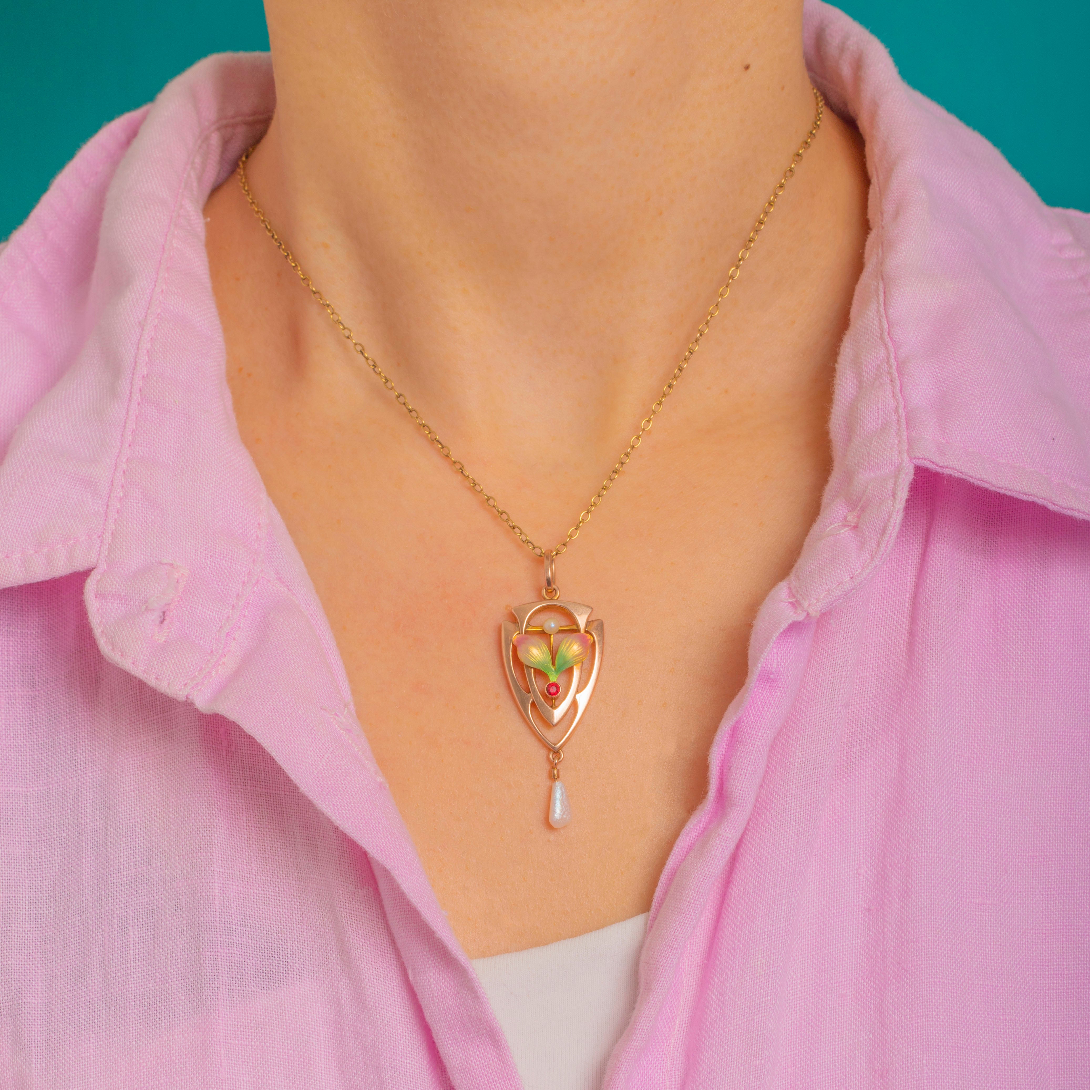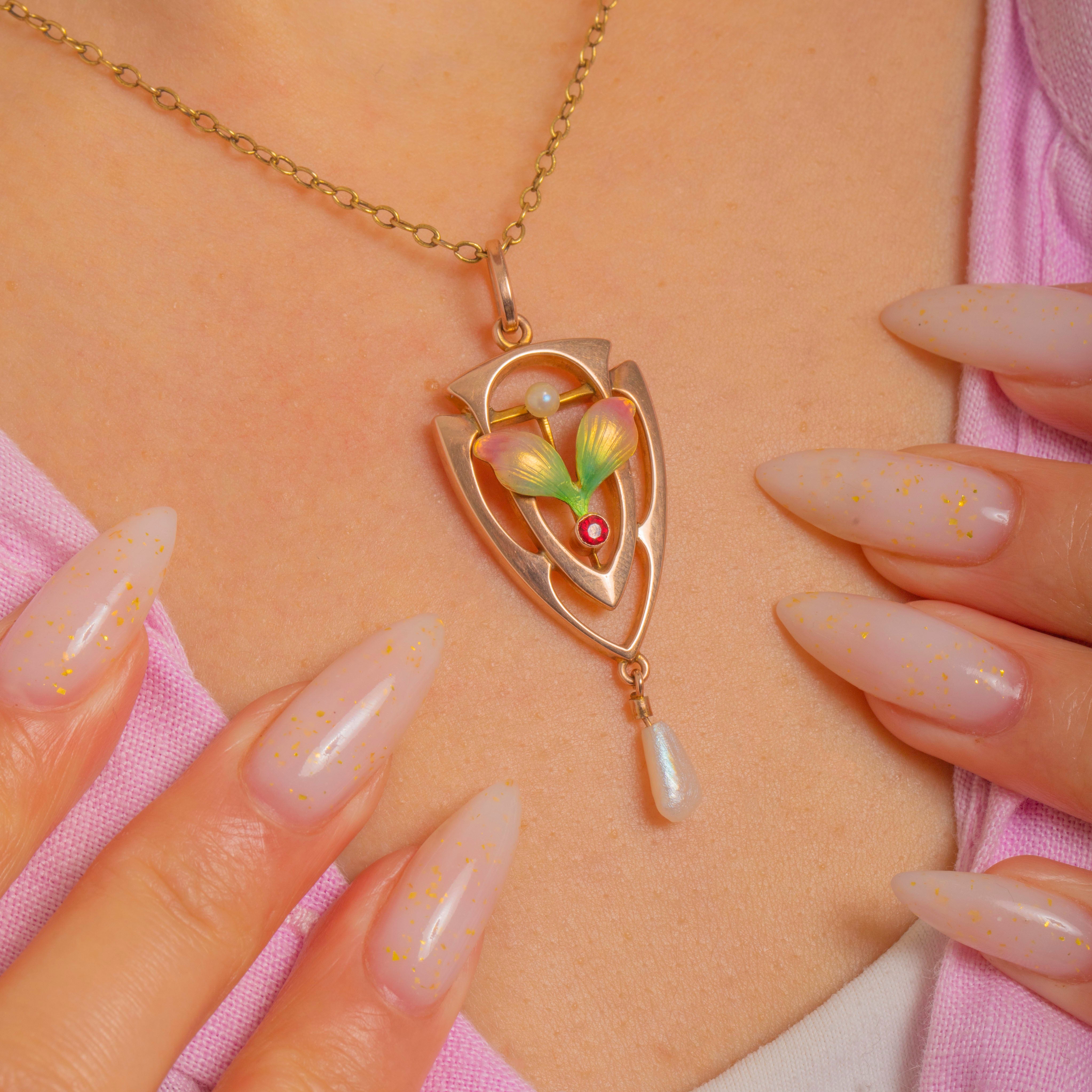 A lyrical Art Nouveau pendant in 9ct Gold, its openwork shield silhouette swept with whiplash curves around a stylised foliate motif. The petals are beautifully shaded in polychrome Enamel from fresh green to blush and sunshine tones, centred with a vivid red Garnet and crowned by a tiny Pearl, while a lustrous pear-shaped Baroque Pearl is articulated below for graceful movement.