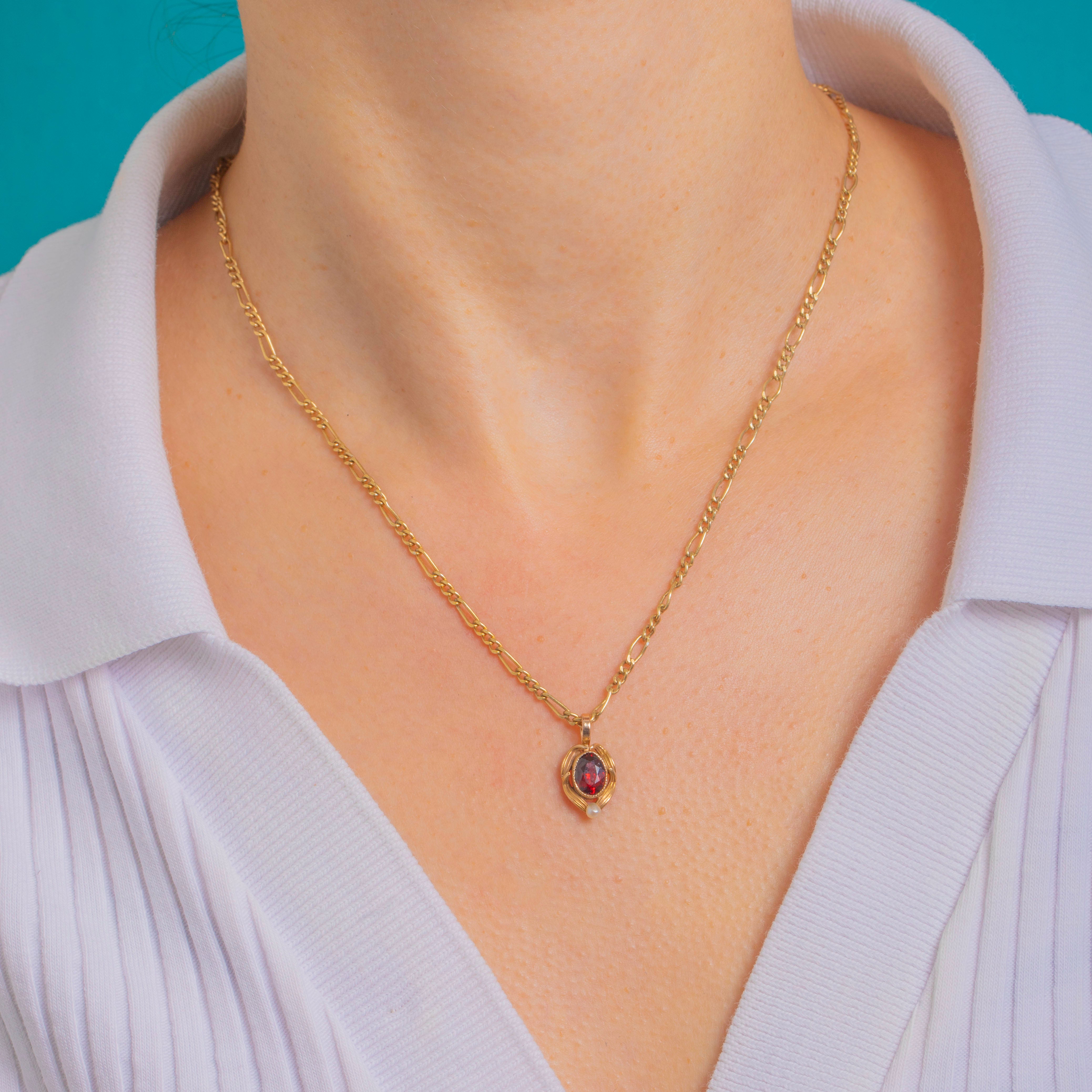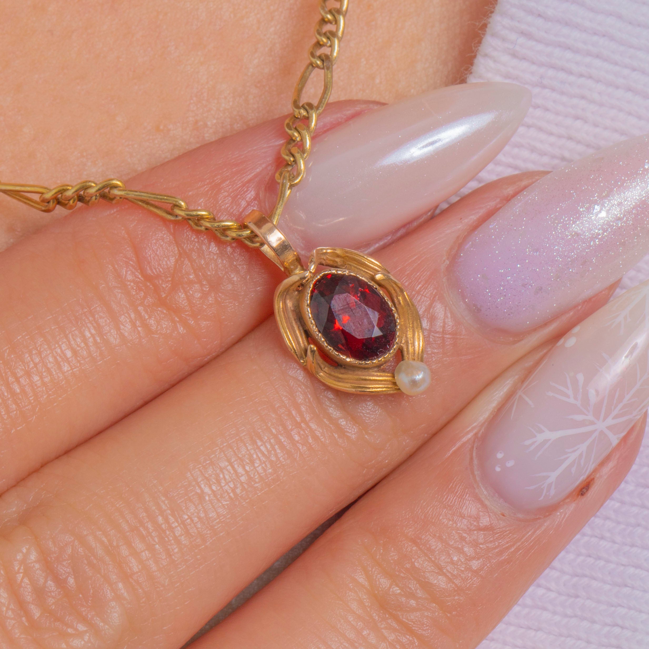 EXCELLENT: The Garnet is bright and secure in its setting with minimal wear visible under magnification; the Pearl accent is intact. The Gold framework and bail are in excellent condition with only light surface wear commensurate with age. No evidence of resizing or restoration is observed.
