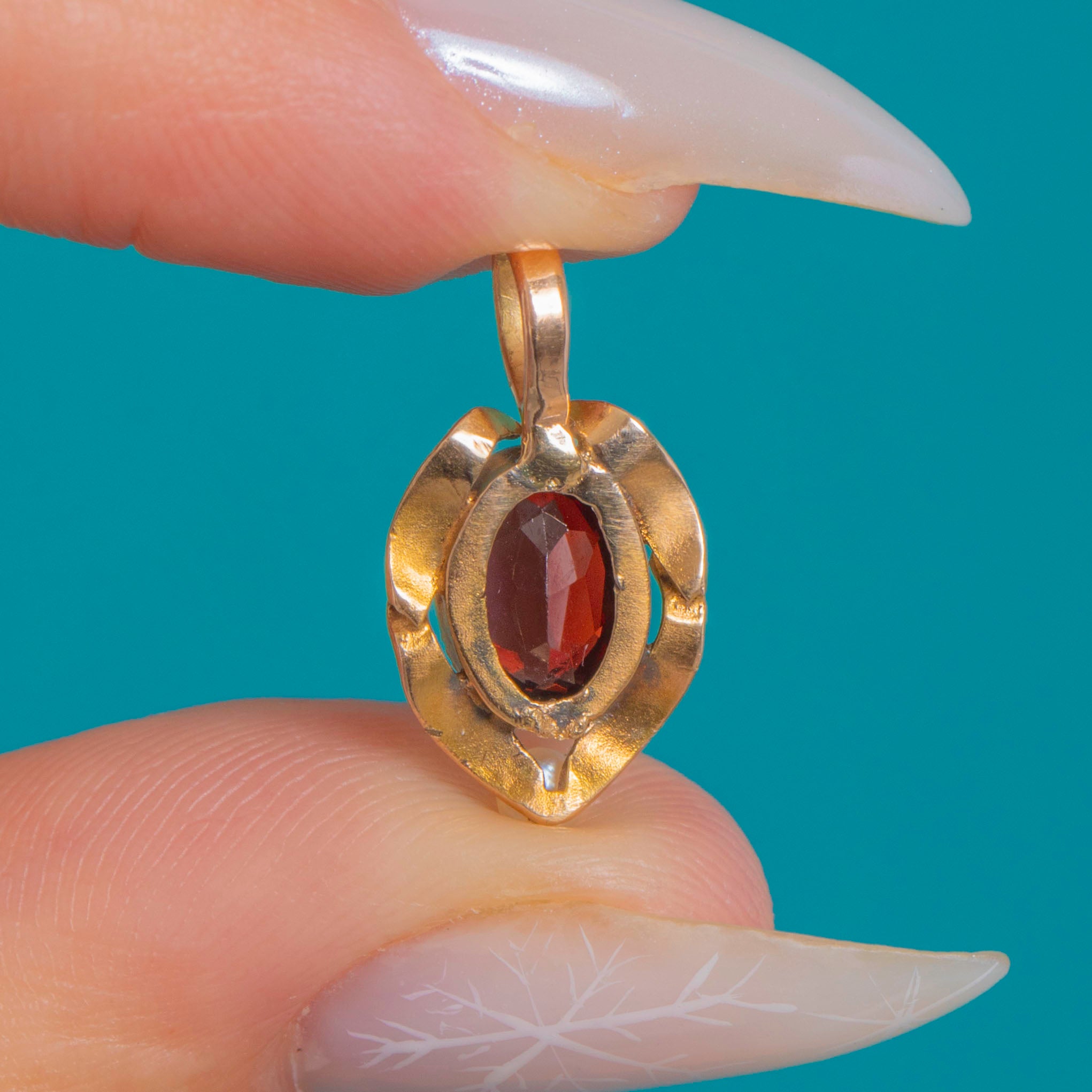 Petite and poetically Art Nouveau, this 9ct Gold charm centres a deep red oval Garnet in a high bezel, framed by flowing ribbon-like openwork. A tiny luminous Pearl punctuates the base, lending a delicate, romantic flourish.