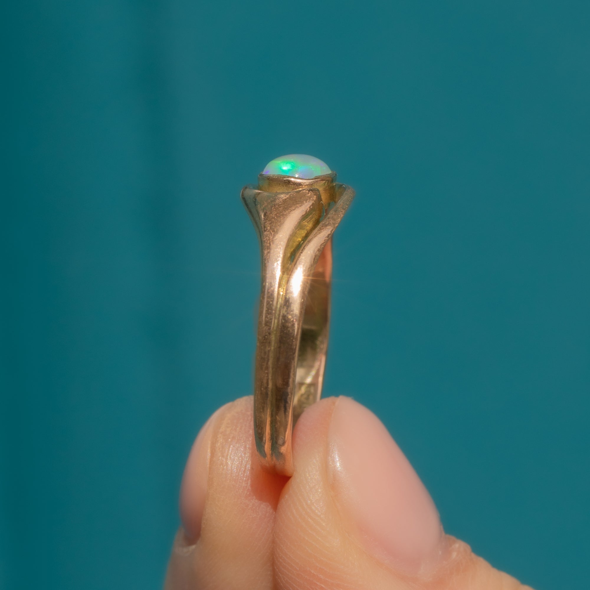 Upon the 9ct Gold throne sits an enchanting Opal with a spellbinding festival of colour, with electric greens, mesmerising blues and passionate oranges. The shapes and colours of this ring combined can be described as nothing short of ethereal!