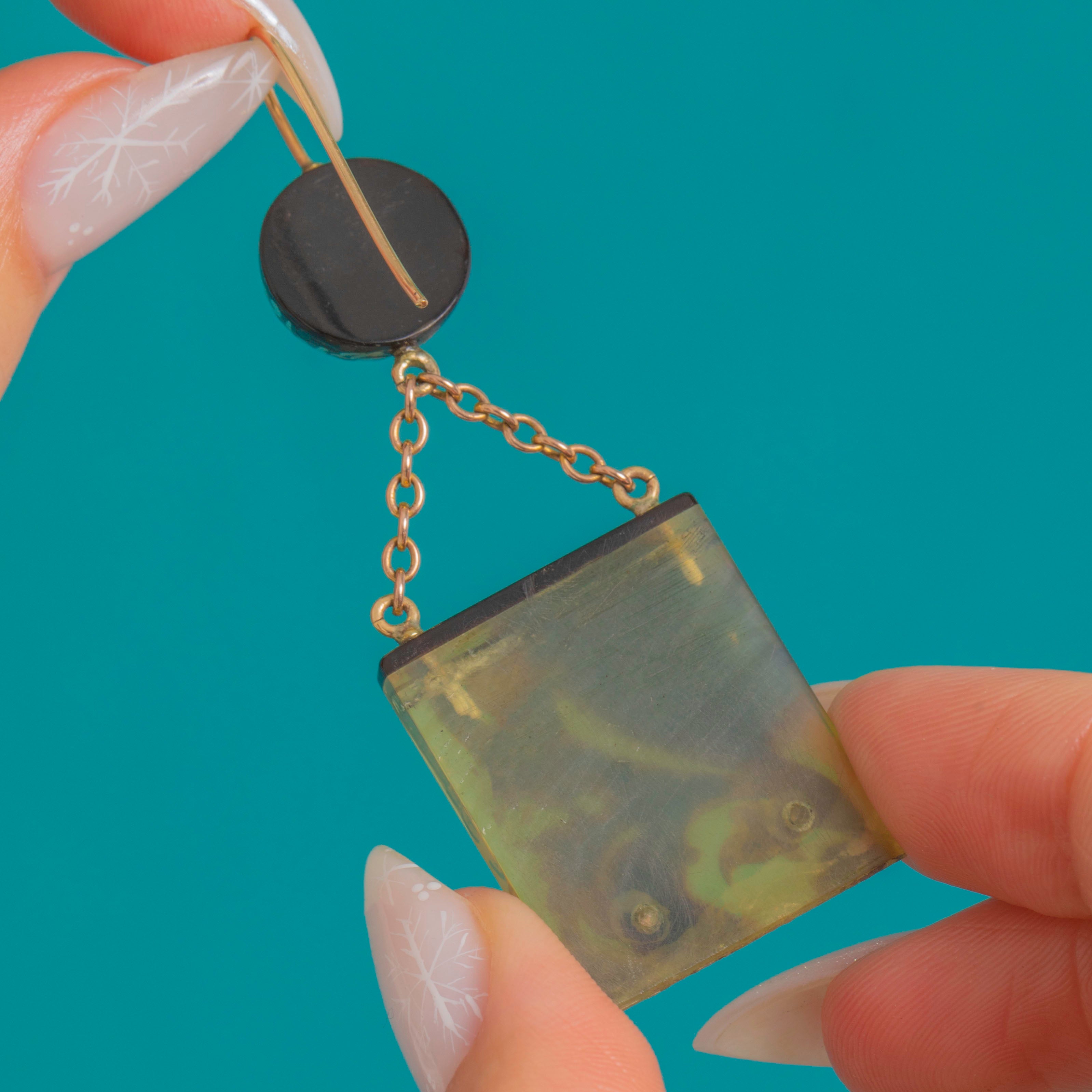 A striking pair of Art Nouveau Piqué drop earrings, alive with sinuous foliate scrolls in shimmering Gold set against a deep, glossy ground. Each earring is crowned by a decorated bead and finishes in an ornate rectangular panel, articulated by short twin chains for beautiful movement and drama on the ear.