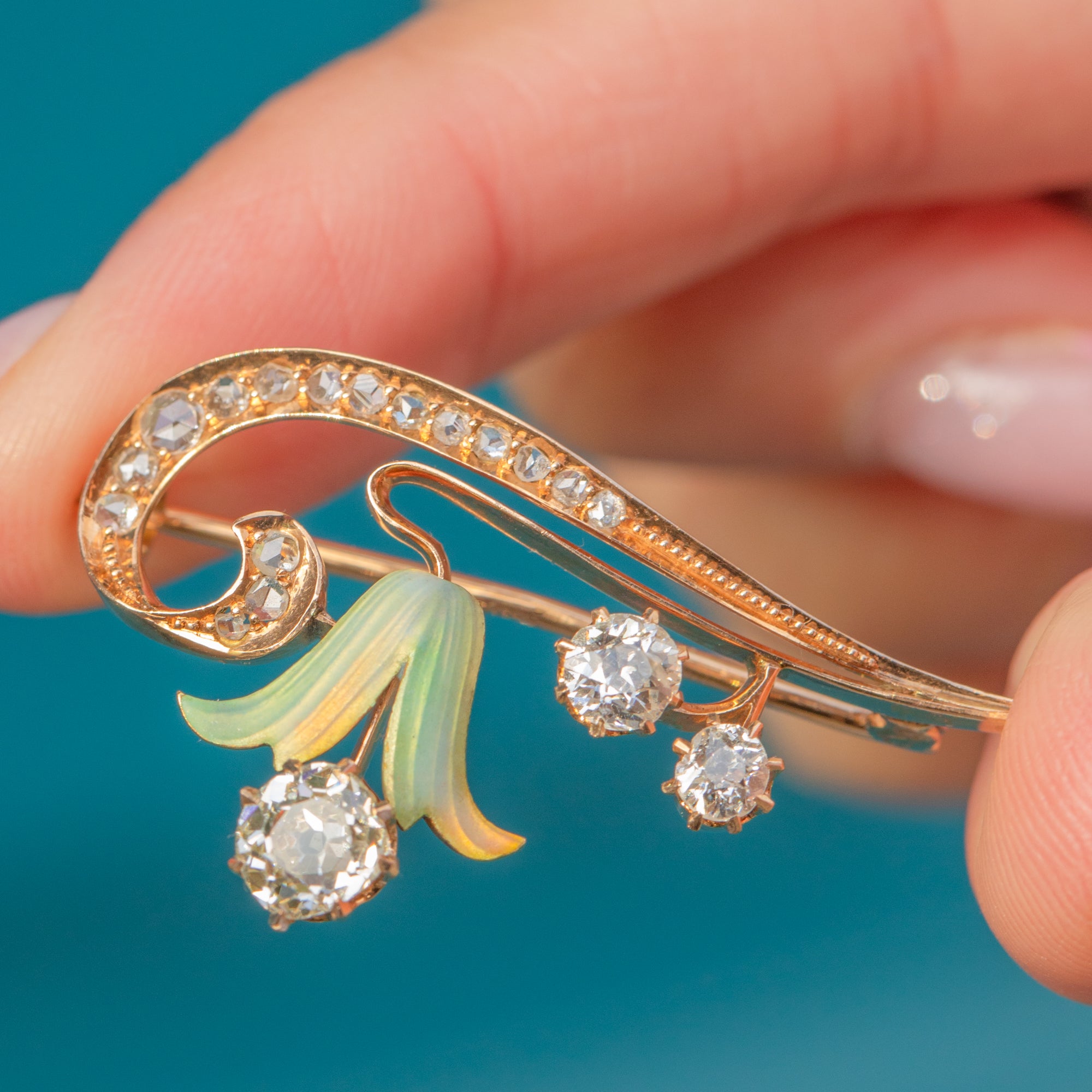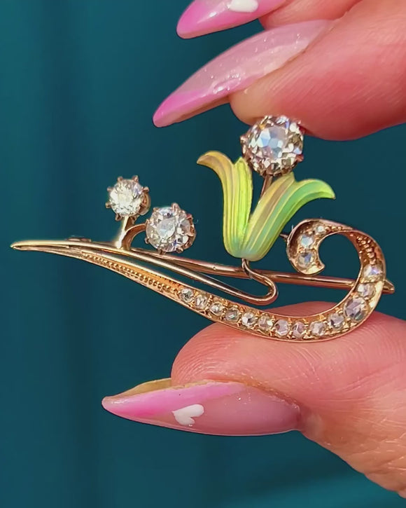 This exquisite Art Nouveau brooch captures the organic beauty and femininity of the early 20th century. Crafted in rich 15ct Gold, the brooch features delicate green enamel accents and glistening old-cut Diamonds arranged in a softly curving, floral-inspired design.