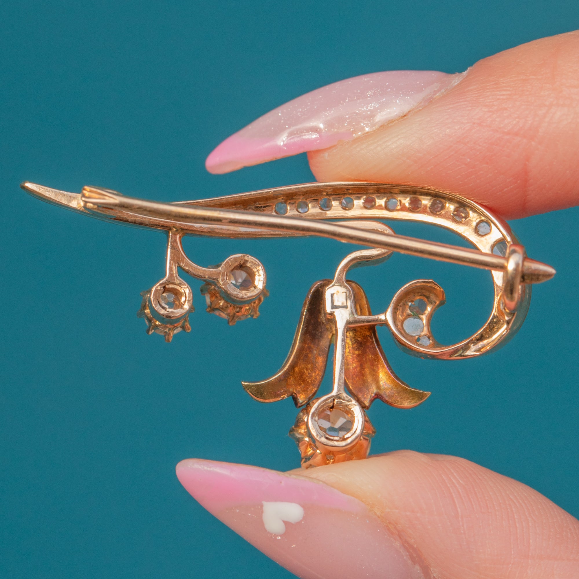The large central Diamond, approximately 0.50ct, is surrounded by a further array of smaller stones totalling around 1.10ct overall, each one carefully set to catch the light with every movement. A perfect example of the graceful artistry and romantic aesthetic that defined the Art Nouveau era.