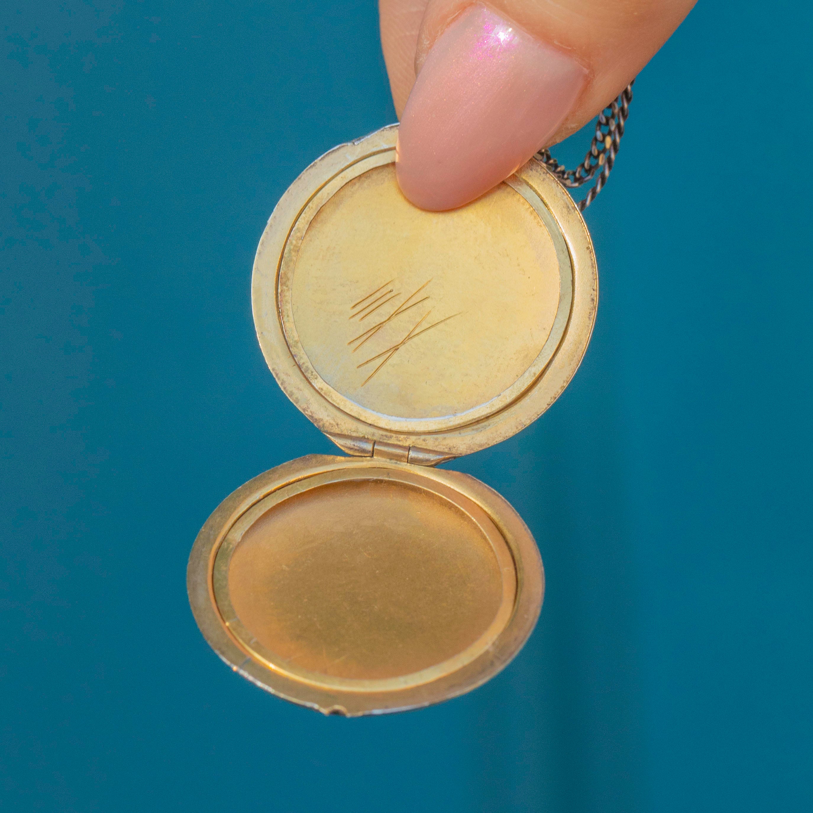 VERY GOOD. This Art Nouveau Guilloche Enamel bouquet of flowers locket is in very good condition. The Enamel is pristine, with no surface wear to note, and the details have stood the test of time. The locket is tricky to open, but will open with a strong and steady hand. There are some marks on the inside from a previous purity testing, which won't be noticeable once photos have been inserted. The locket closes securely allowing you to enjoy this striking Art Nouveau locket with utmost confidence!