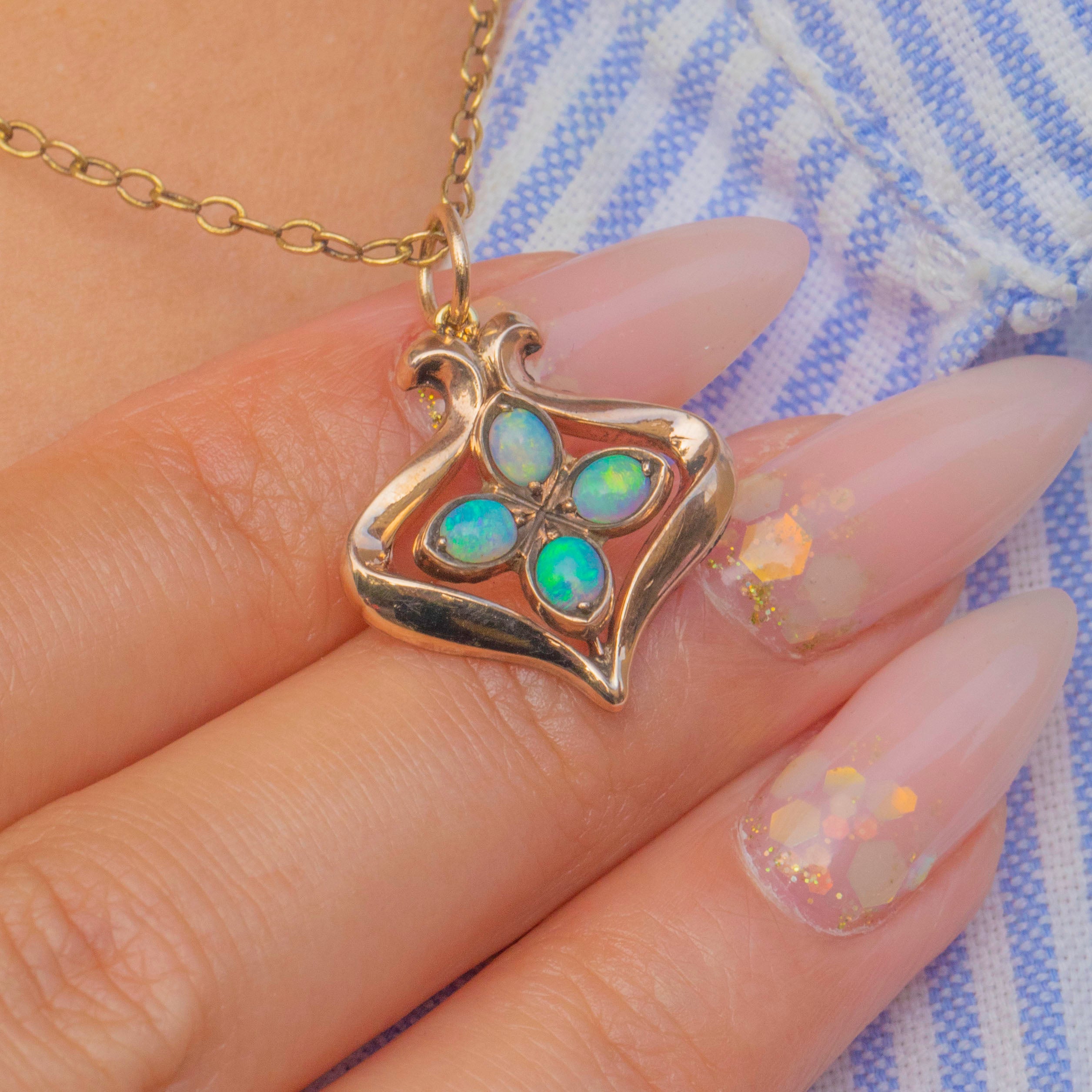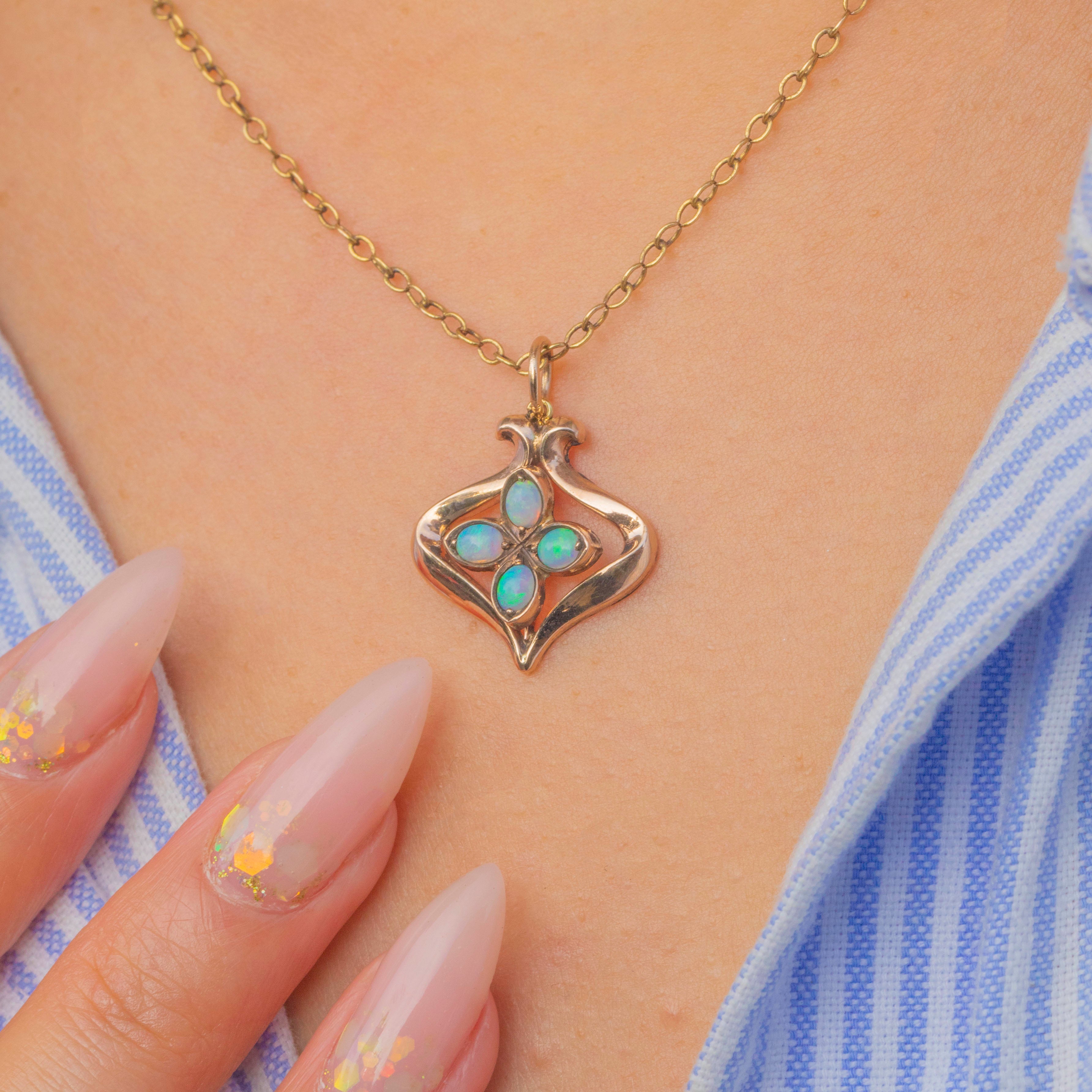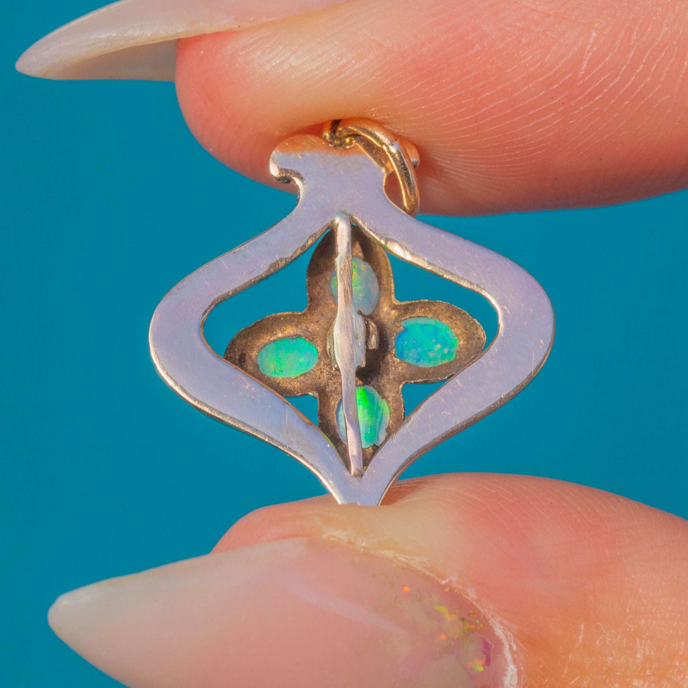 This dainty Art Nouveau charm is modelled as a flower, set with four natural solid Opal cabochons. The Opals display delicate flashes of colour within their cabochon cuts, a perfect match for the organic elegance of the period.