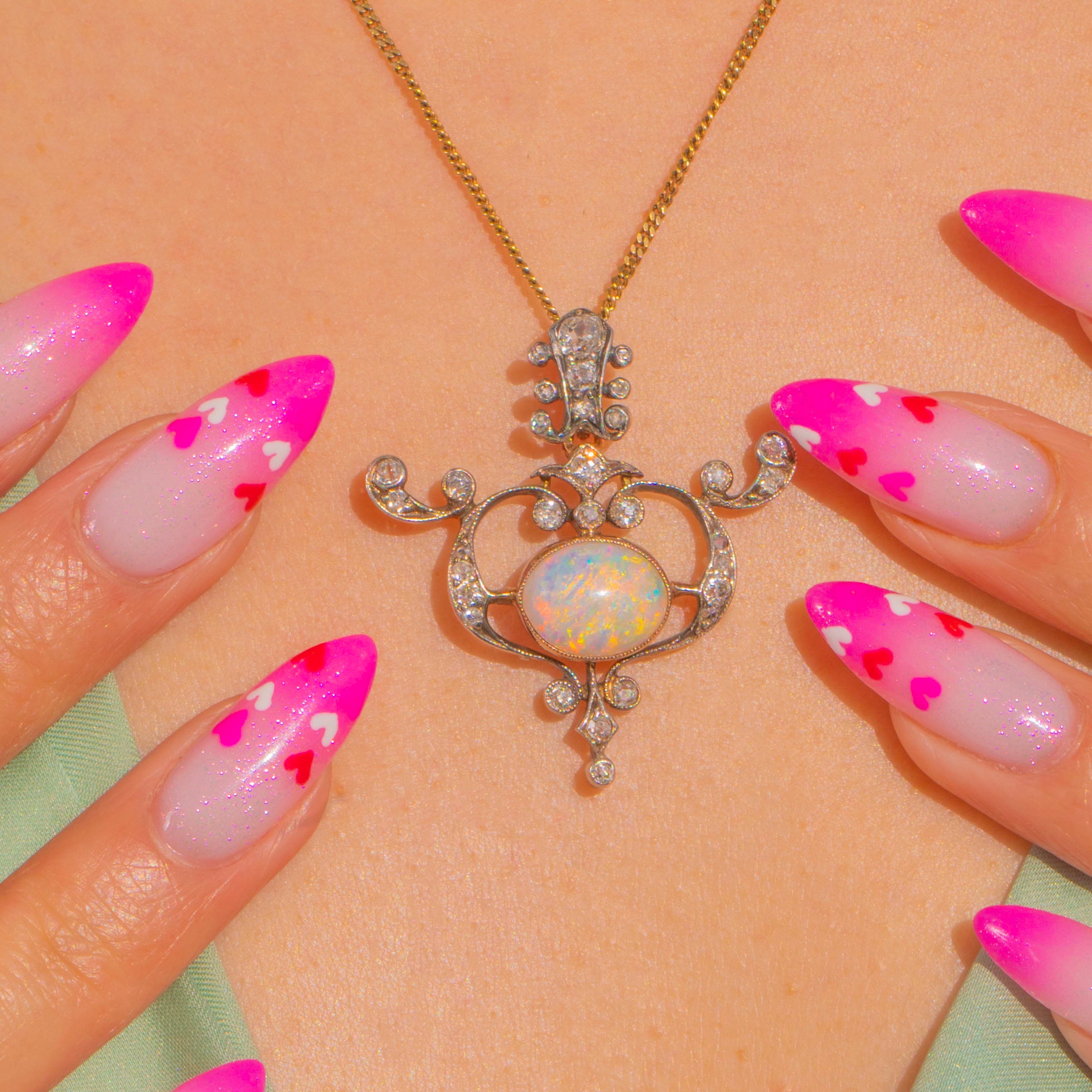 Art Nouveau Opal Diamond Pendant, 1.60ct Natural Solid Opal