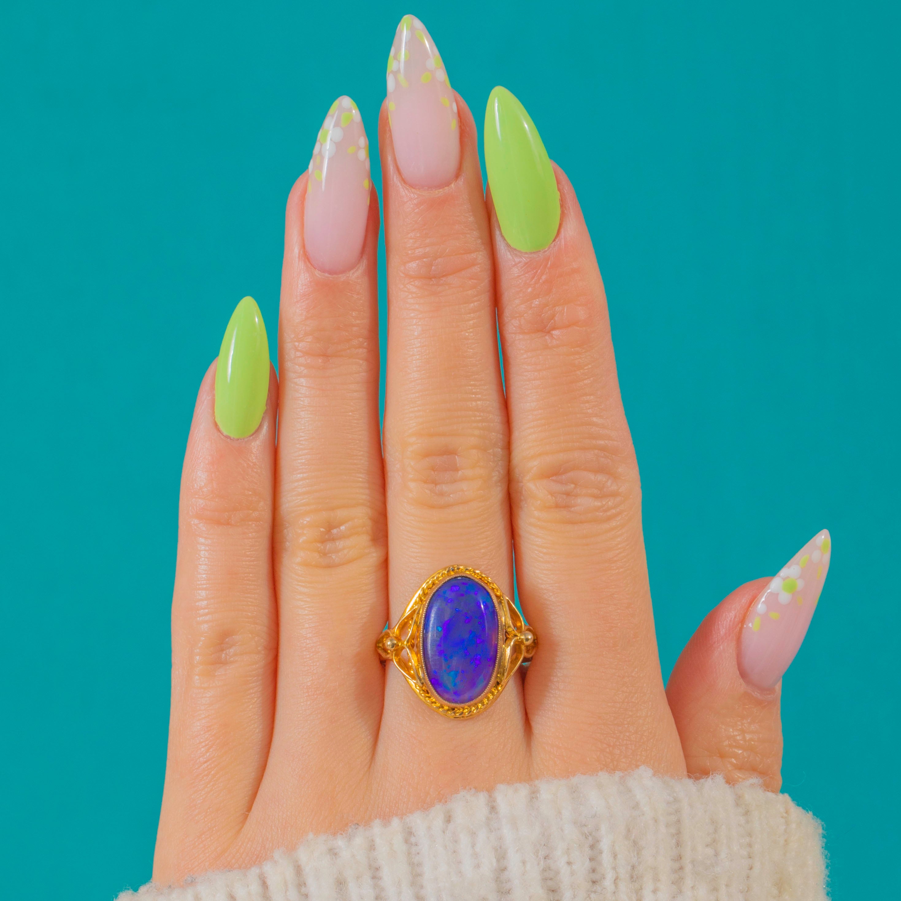 Ornate yet beautifully wearable, the craftsmanship feels unmistakably Arts and Crafts: decorative, textural, and full of movement. The Opal’s exceptional colour is complemented by the warm glow of 9ct Gold, creating a bold statement ring with timeless allure.