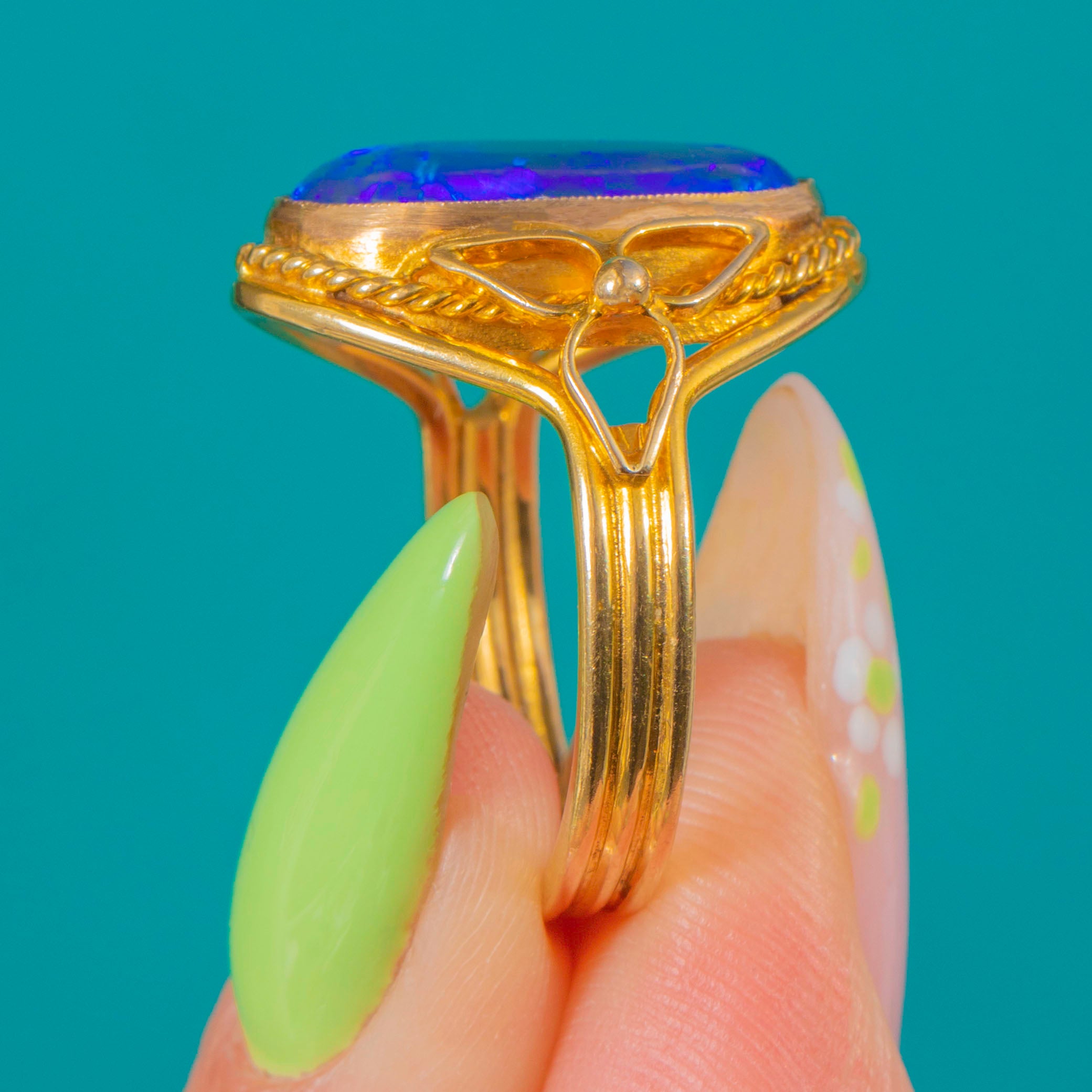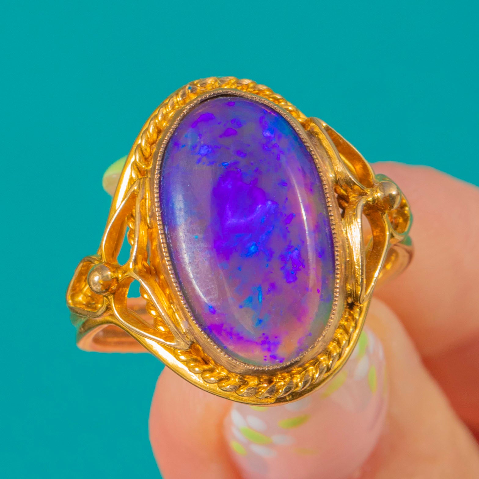 EXCELLENT: The 2.60ct Black Opal is secure with bright, lively play of colour and only minor surface abrasions visible under close inspection. The 9ct Gold bezel, rope border, and pierced shoulders are crisp with light surface wear and fine scratches commensurate with age; the split, triple-wire shank is sturdy and in round. No obvious chips, cracks, losses, repairs, or resizing marks.