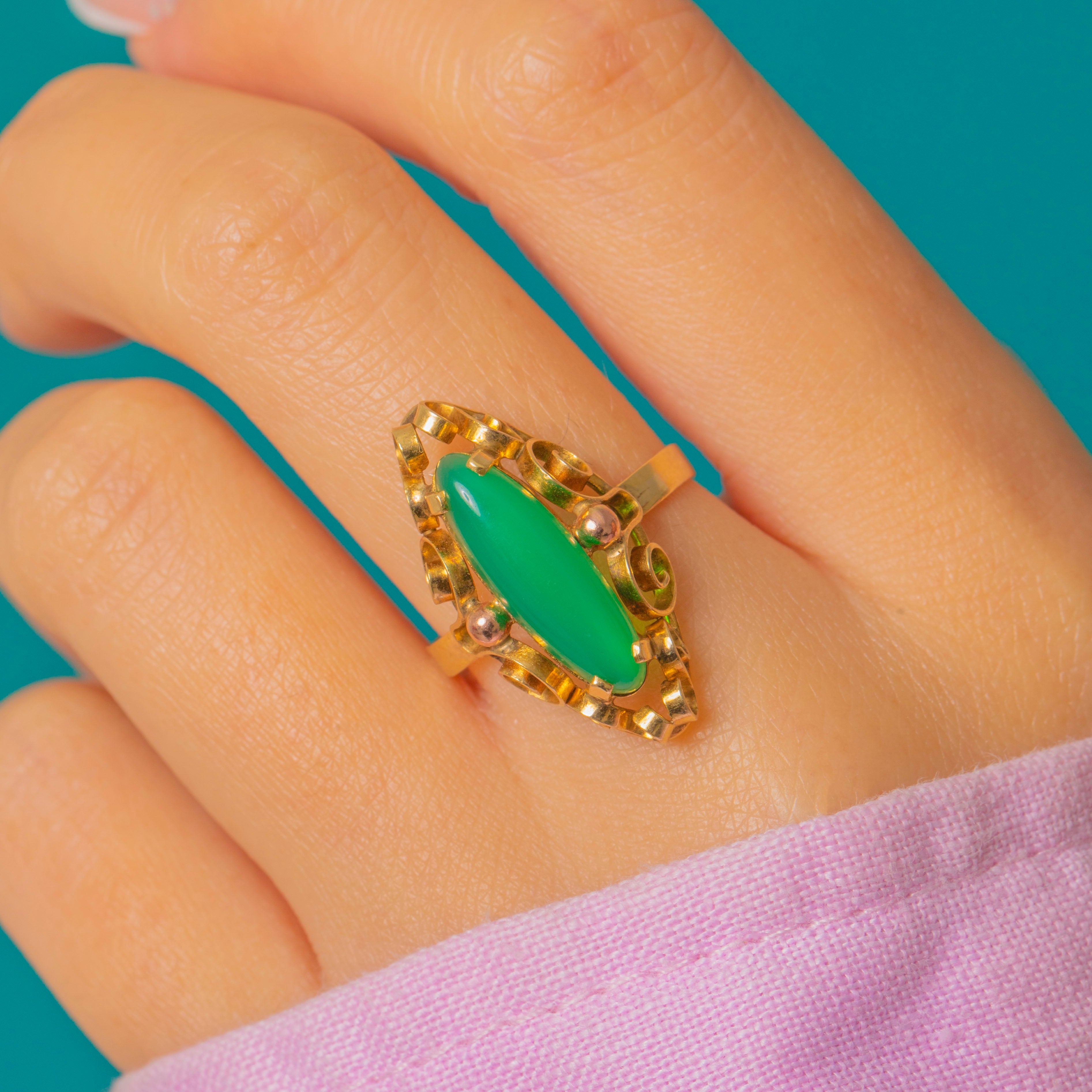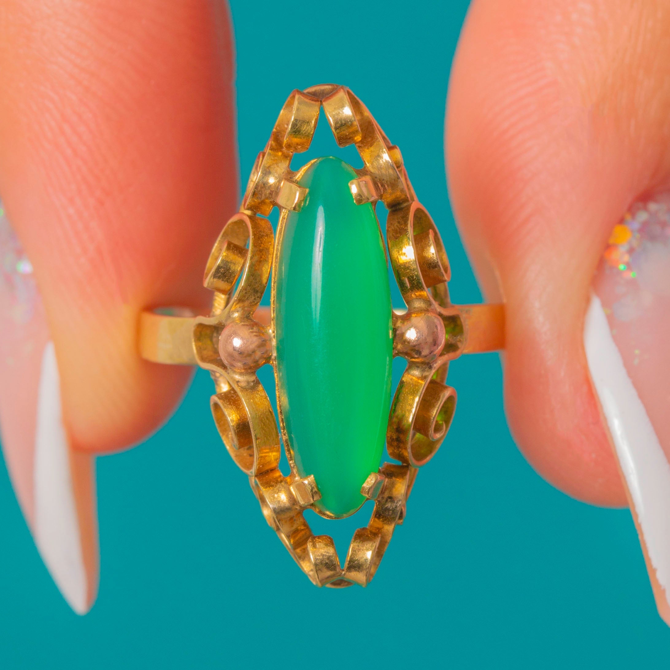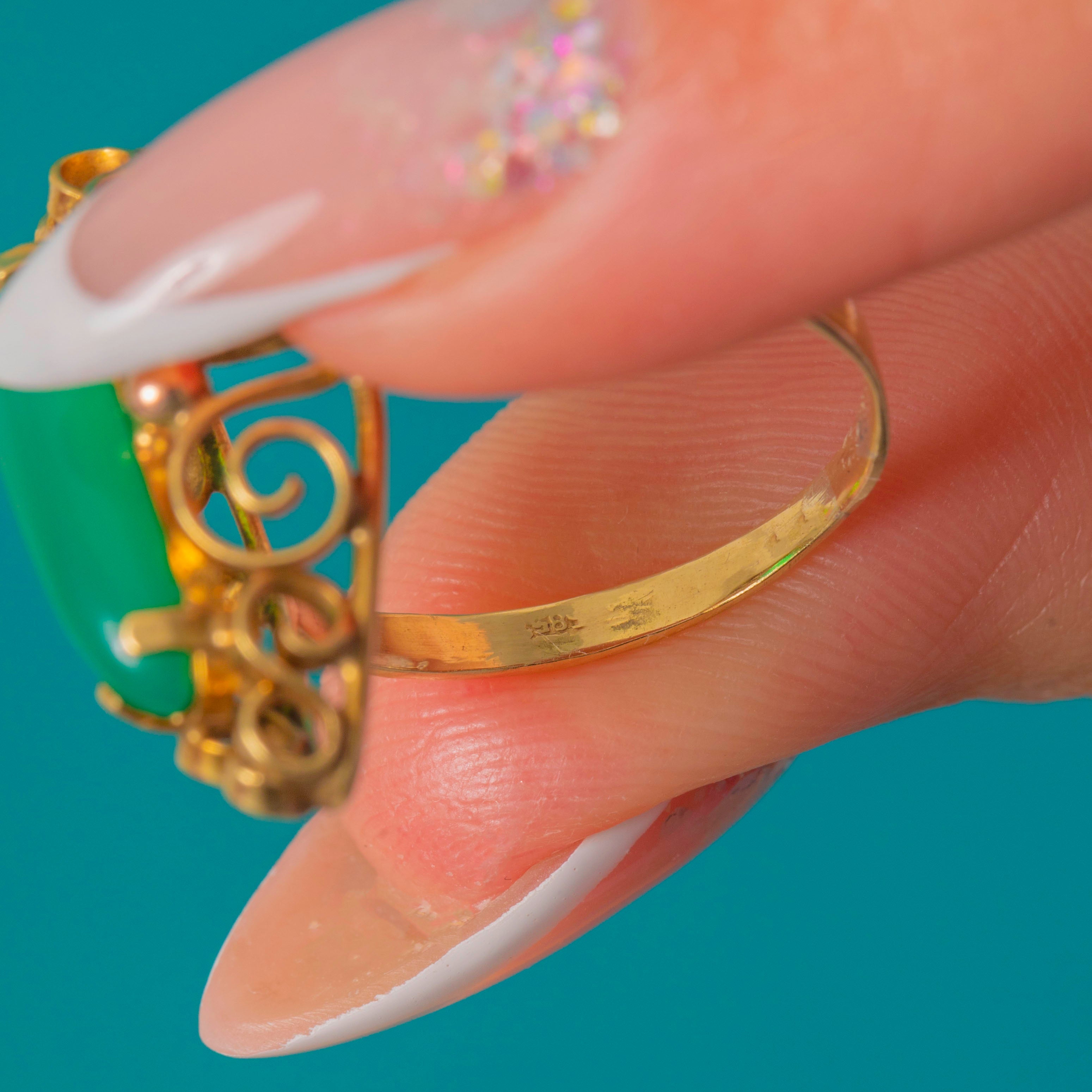 EXCELLENT: The green Chalcedony is smooth, glossy and free from damage and glowing bright! The solid 14ct Gold band is well-shaped and polished well with a gorgeous buttery yellow hue and no re-size marks or thinning to the band.