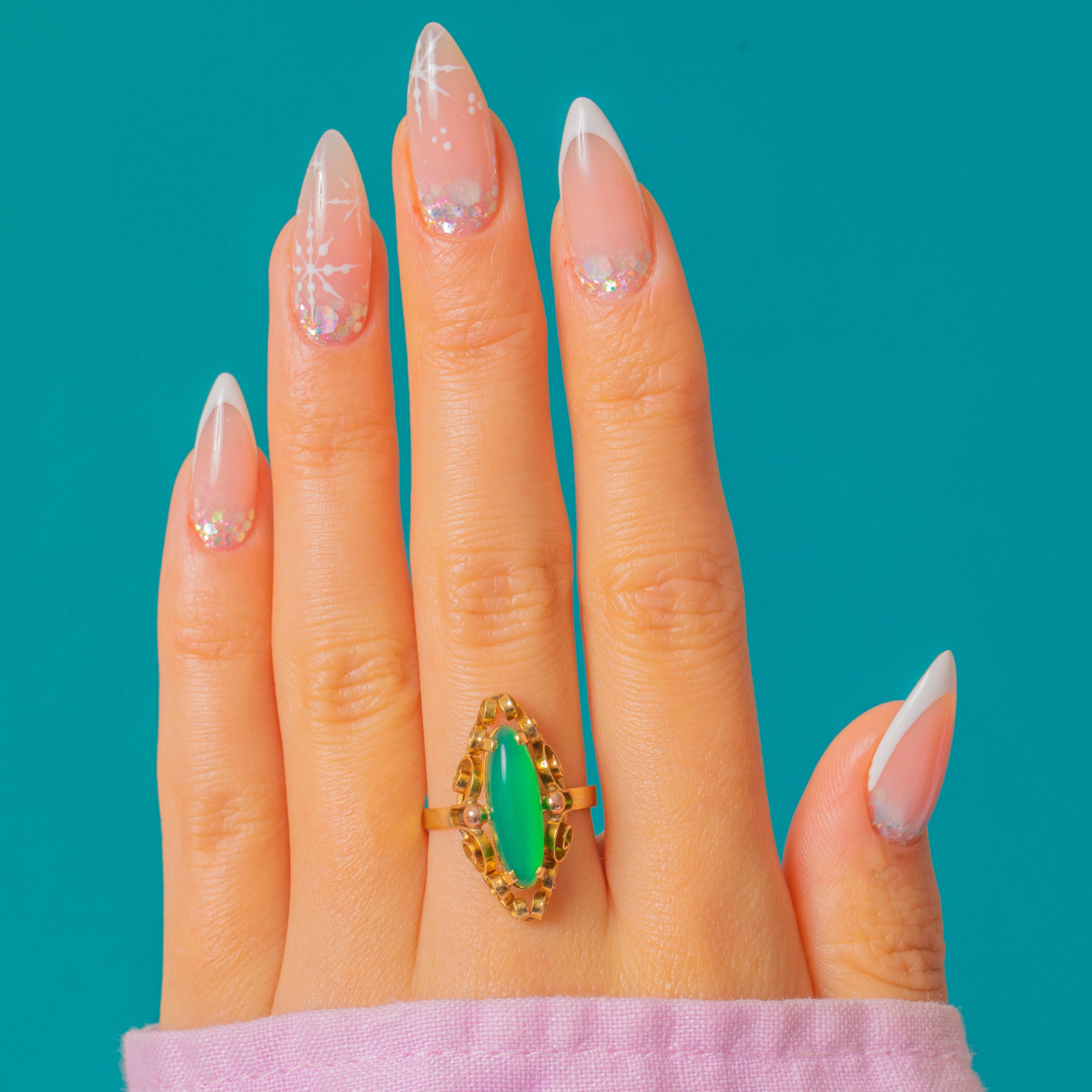 This elegant early 20th-century ring is crafted in 14ct Gold and set with a striking elongated Green Chalcedony. The smooth, polished stone displays a soft, luminous glow, typical of fine Austrian craftsmanship from the Arts & Crafts era. Its sleek silhouette and refined proportions give it a timeless, modern feel despite its antique origins.