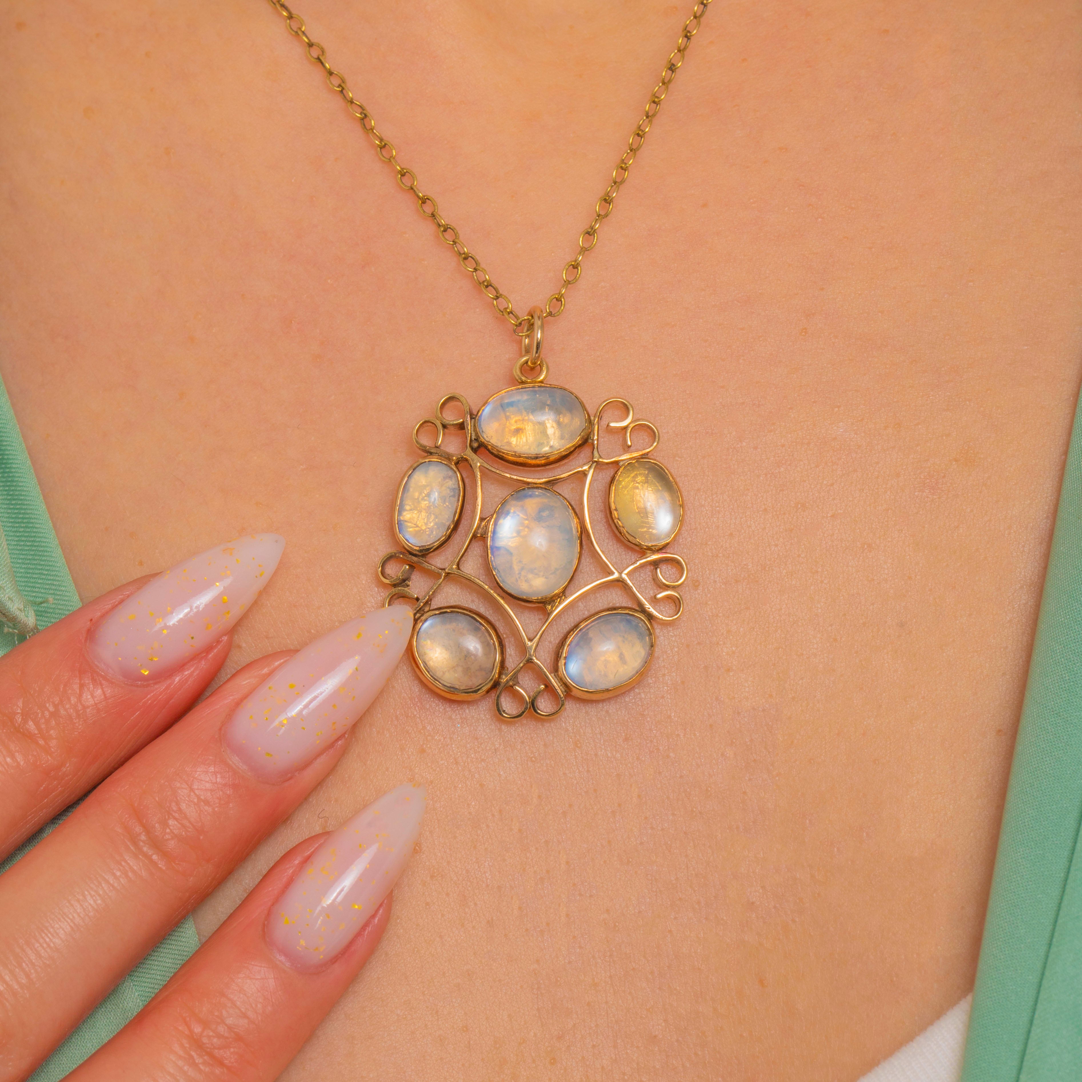 Hand-wrought in the Arts & Crafts tradition, this romantic pendant is a lacework of sinuous scrolls and tender heart-like curls, all crafted in warm 9ct Gold. Five luminous Moonstone cabochons nestle in rubbed-over bezels, their translucent bodies coming alive with soft bluish-white glow as they move.