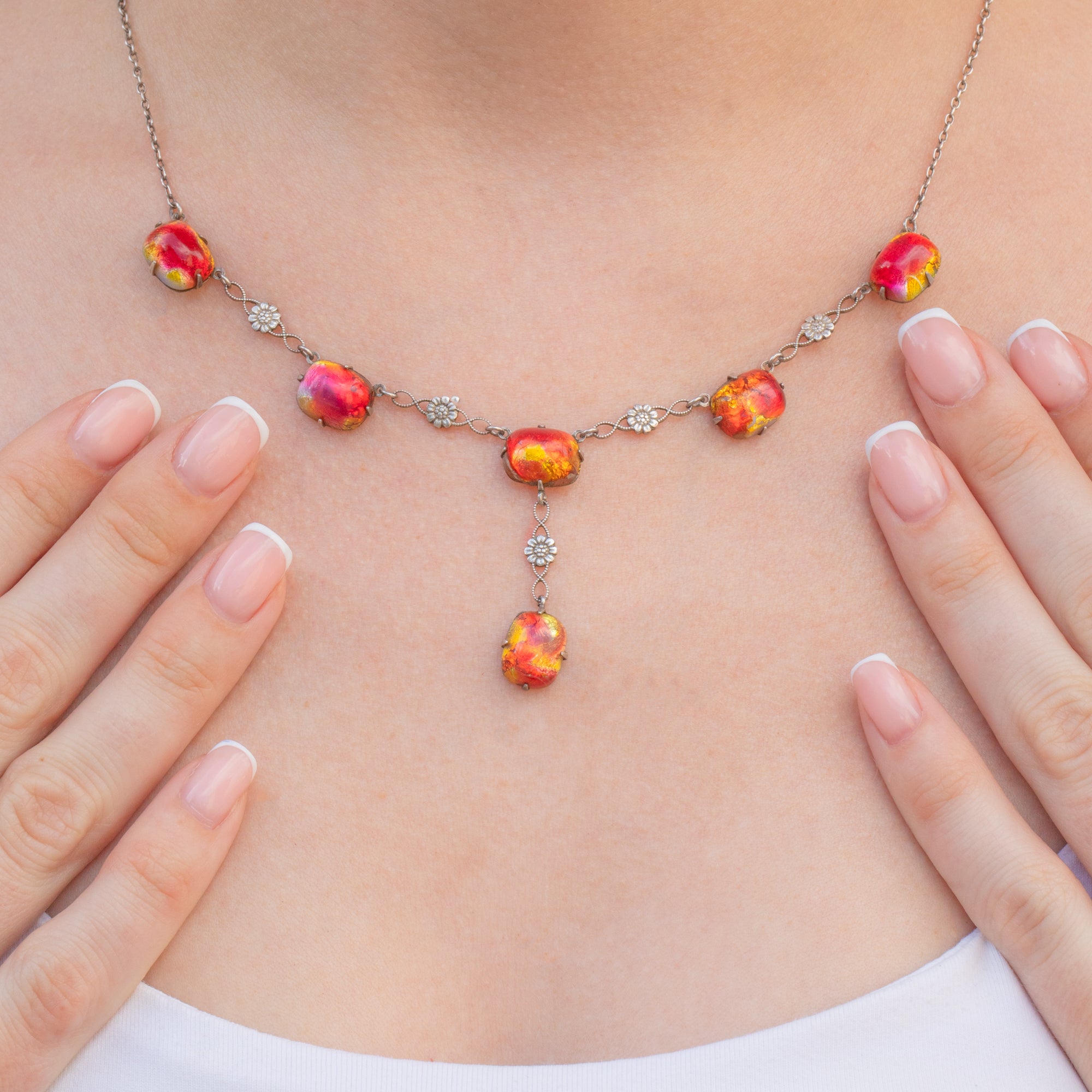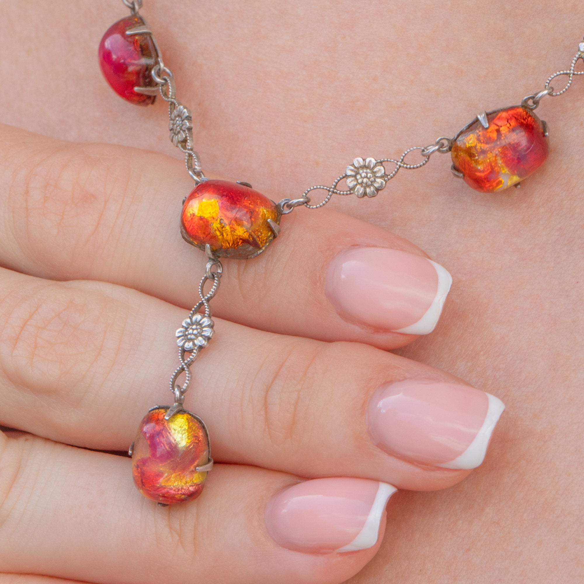 Made using Sterling Silver, this Arts and Crafts necklace hosts six handmade blazing cabochon 'Dragons Breath' stones, forged by mixing glass with molten metals. Interlinking each fiery 'Dragons Breath' stone are delicate links adorning engraved flower motifs, striking the perfect balance between delicate femininity and ferocious vitality.