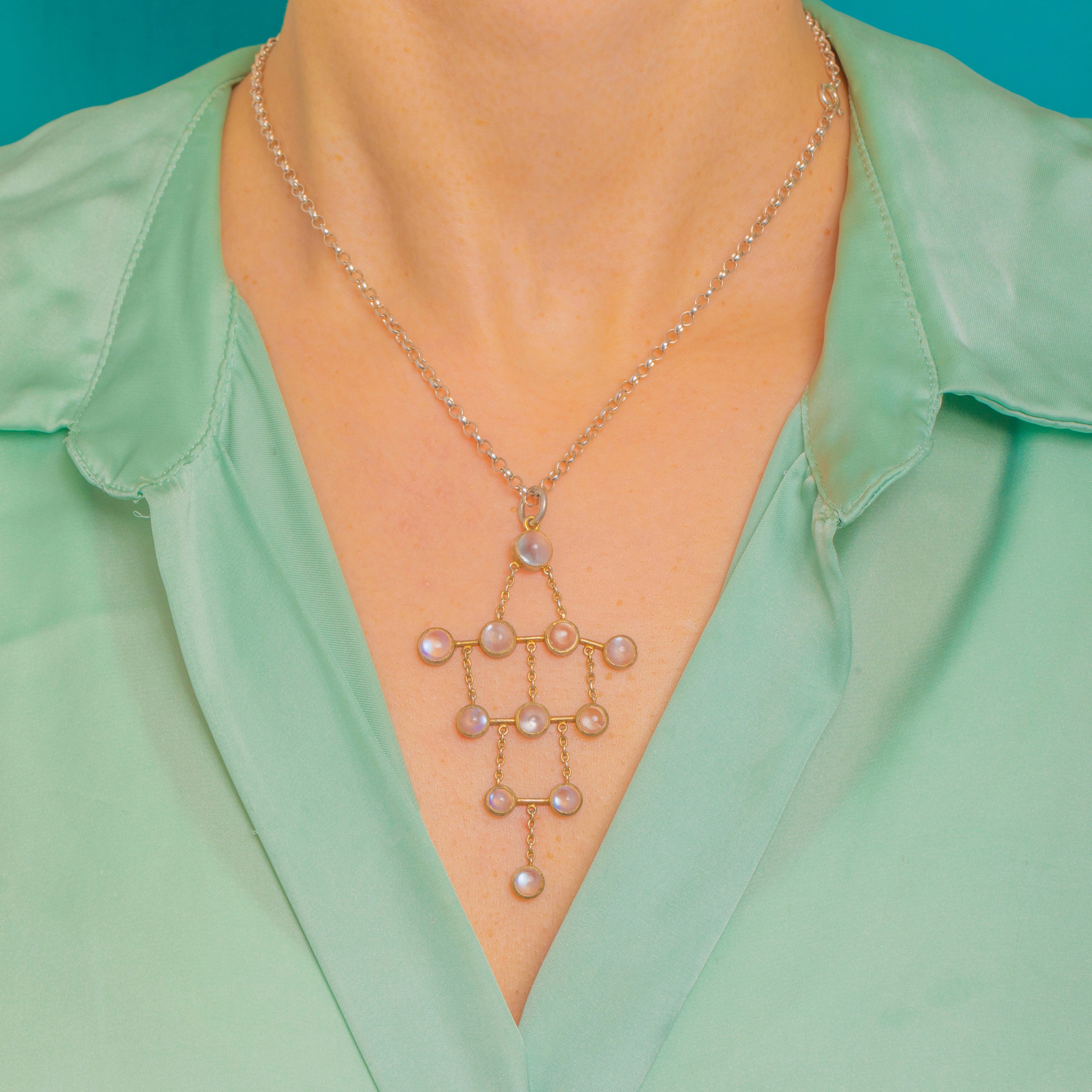 A beautifully balanced Arts & Crafts era pendant, crafted in Gold-gilded Silver and set with a constellation of glowing Moonstones. The design is all about rhythm and movement: bezel-set cabochons linked in a geometric drop that sways softly as you wear it.