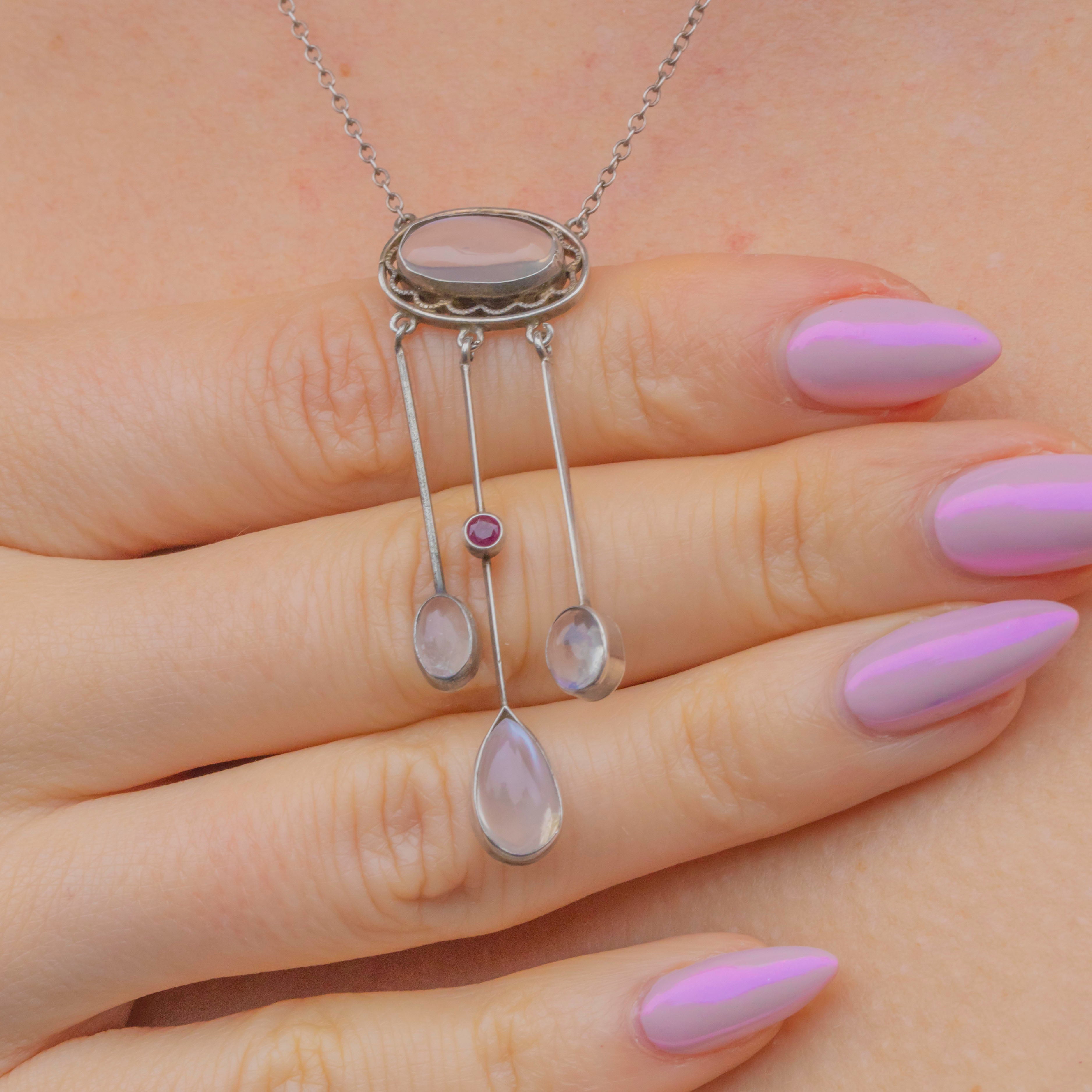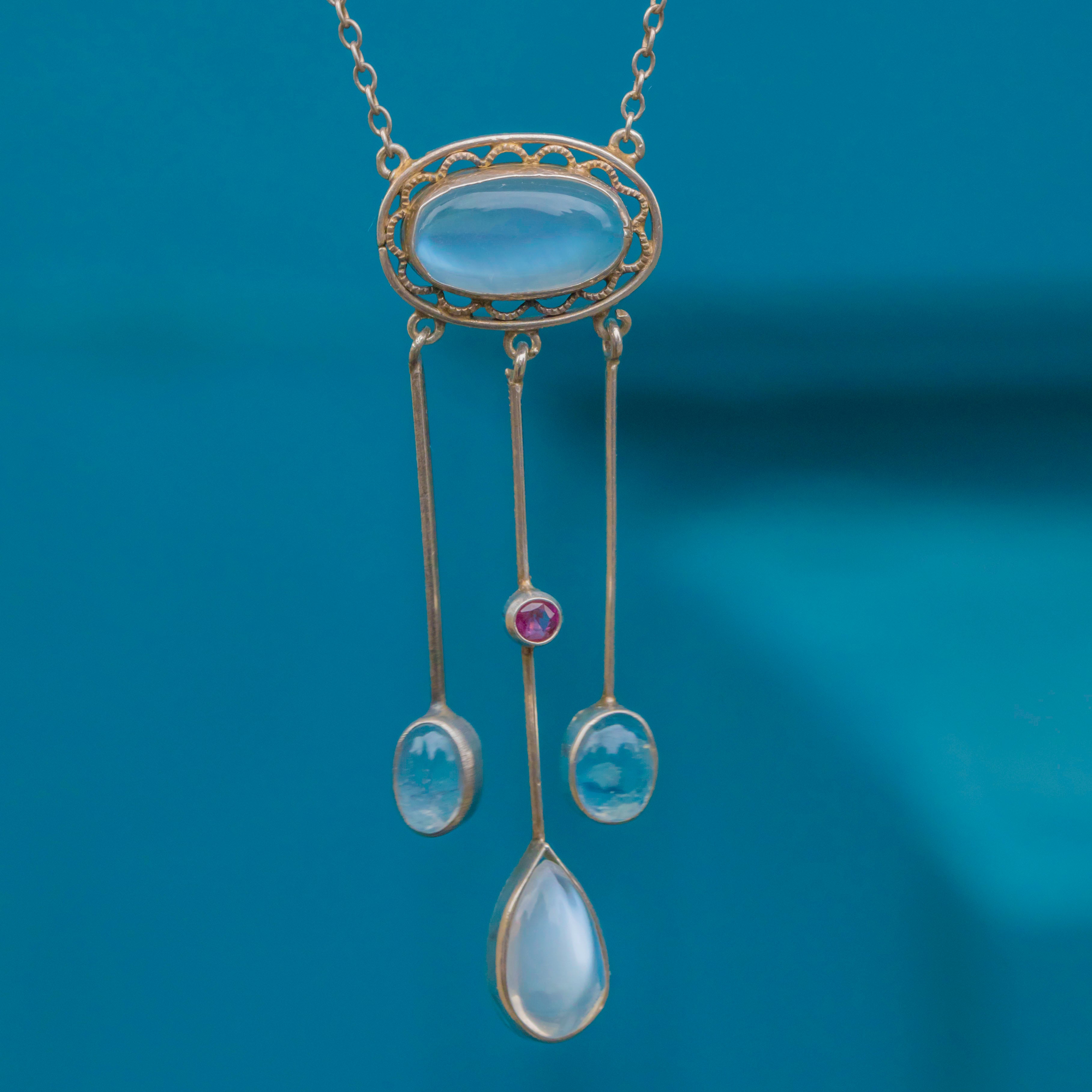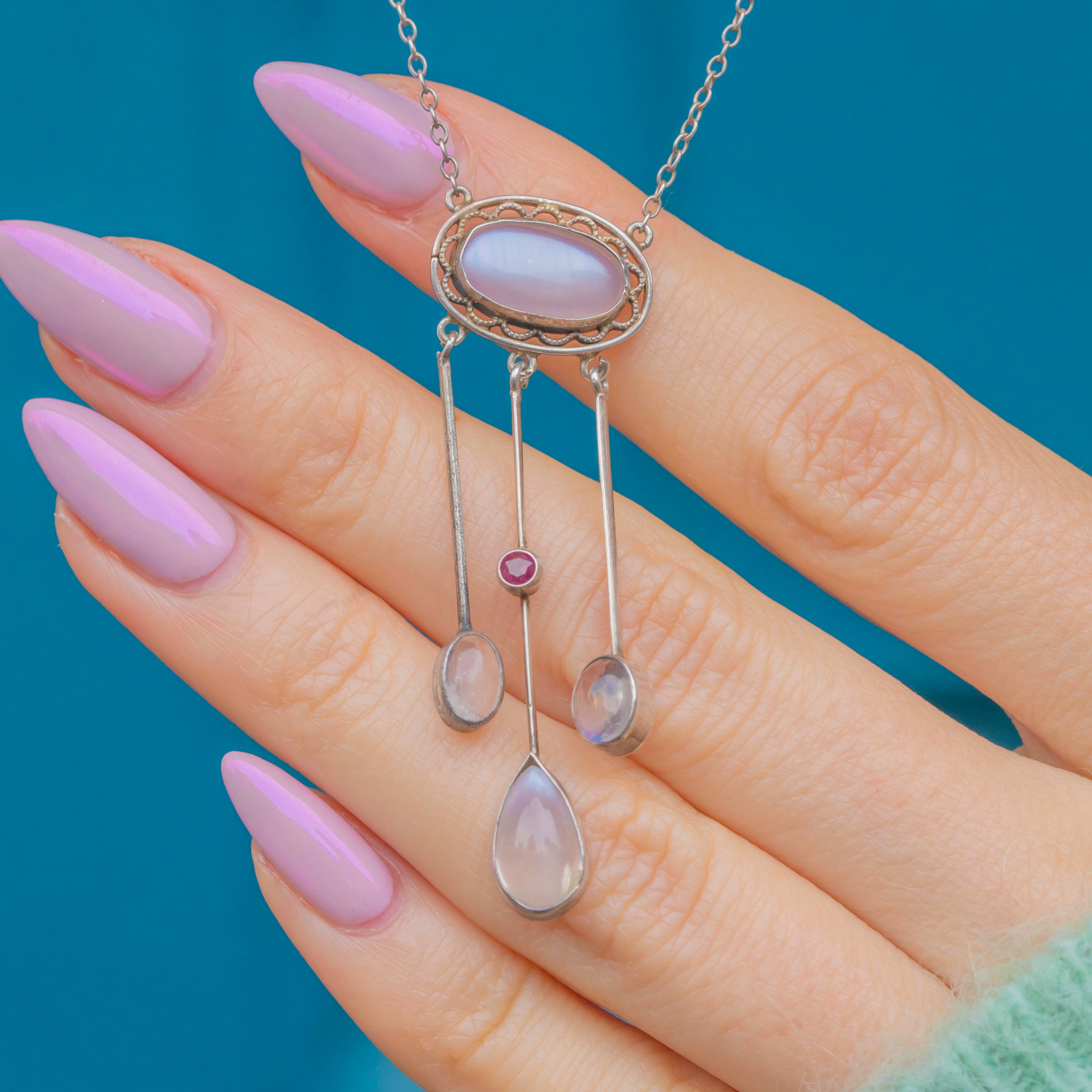 This ethereal Arts & Crafts necklace is crafted in Sterling Silver and set with glowing Moonstones that shimmer with a soft blue adularescence. The stones graduate beautifully through the pendant, leading to a delicate 2mm Ruby accent that adds a perfect touch of warmth and contrast.