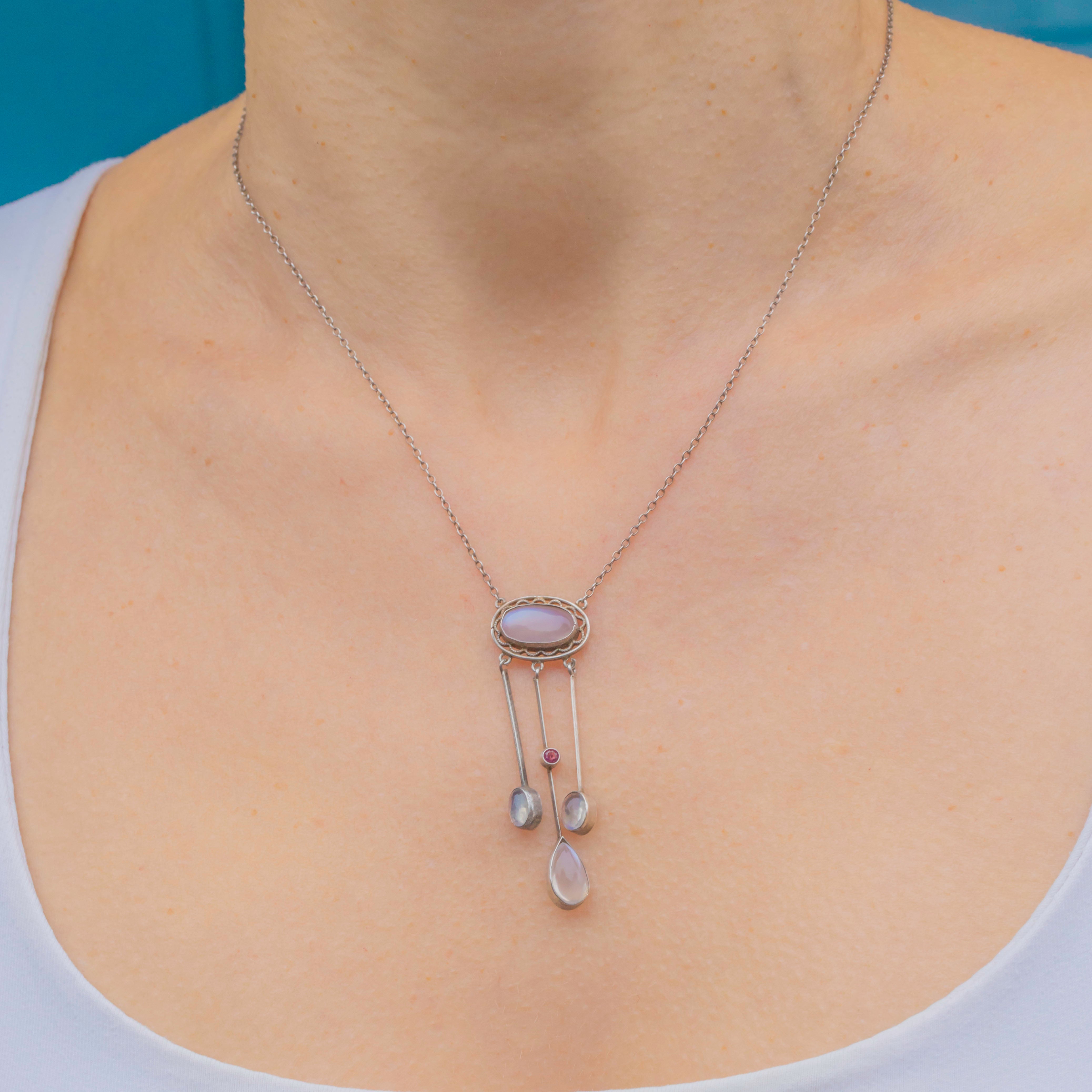 Arts & Crafts Silver Moonstone & Ruby Necklace