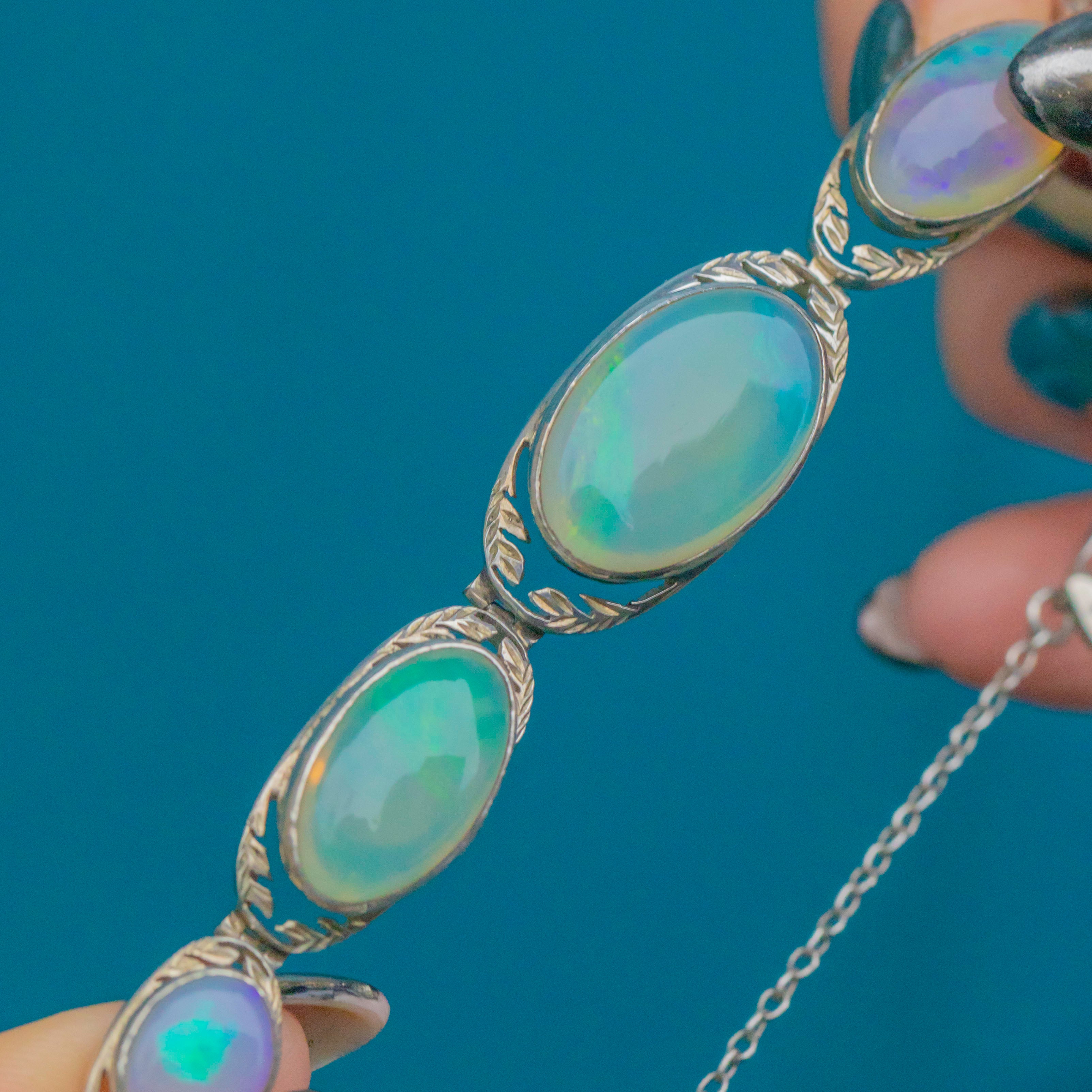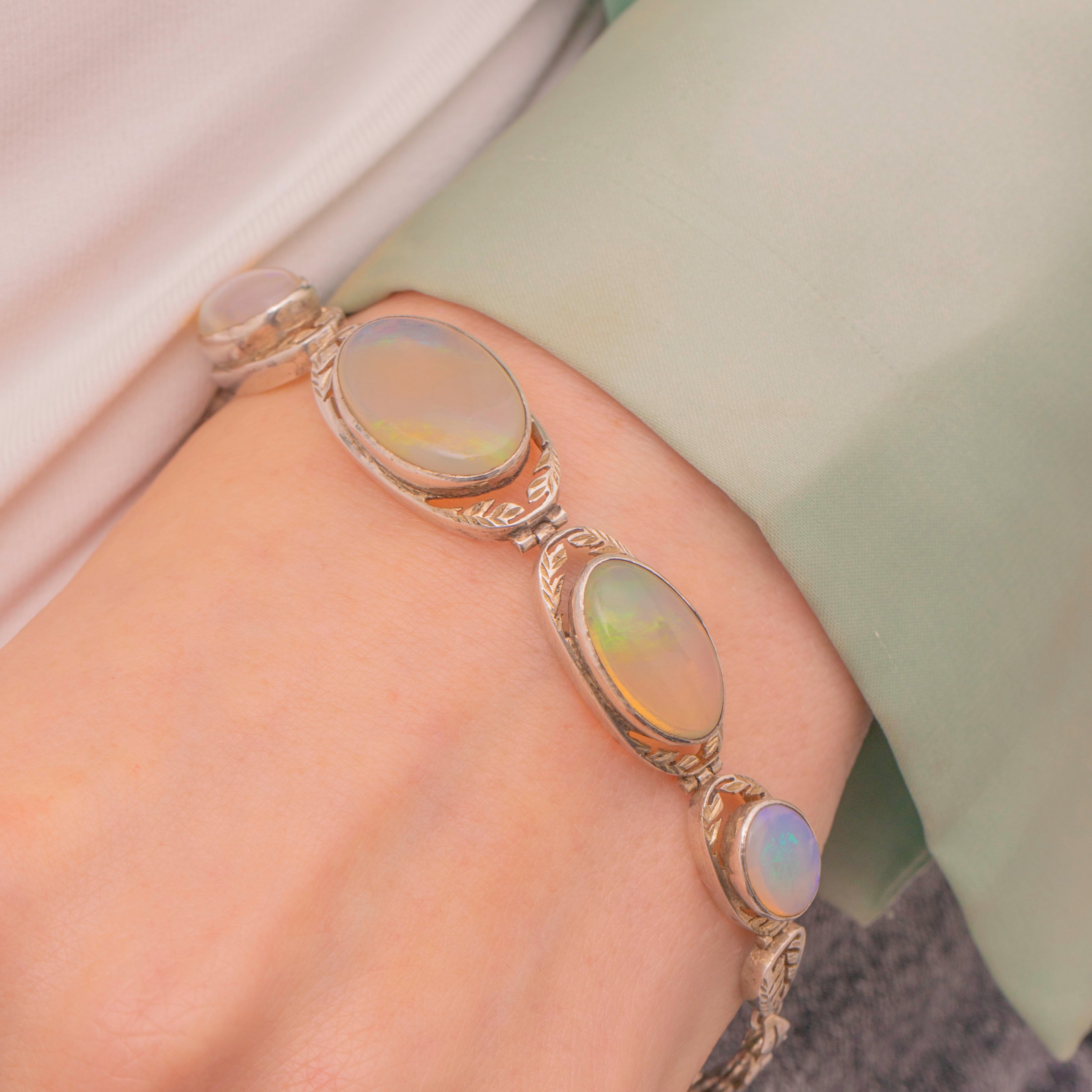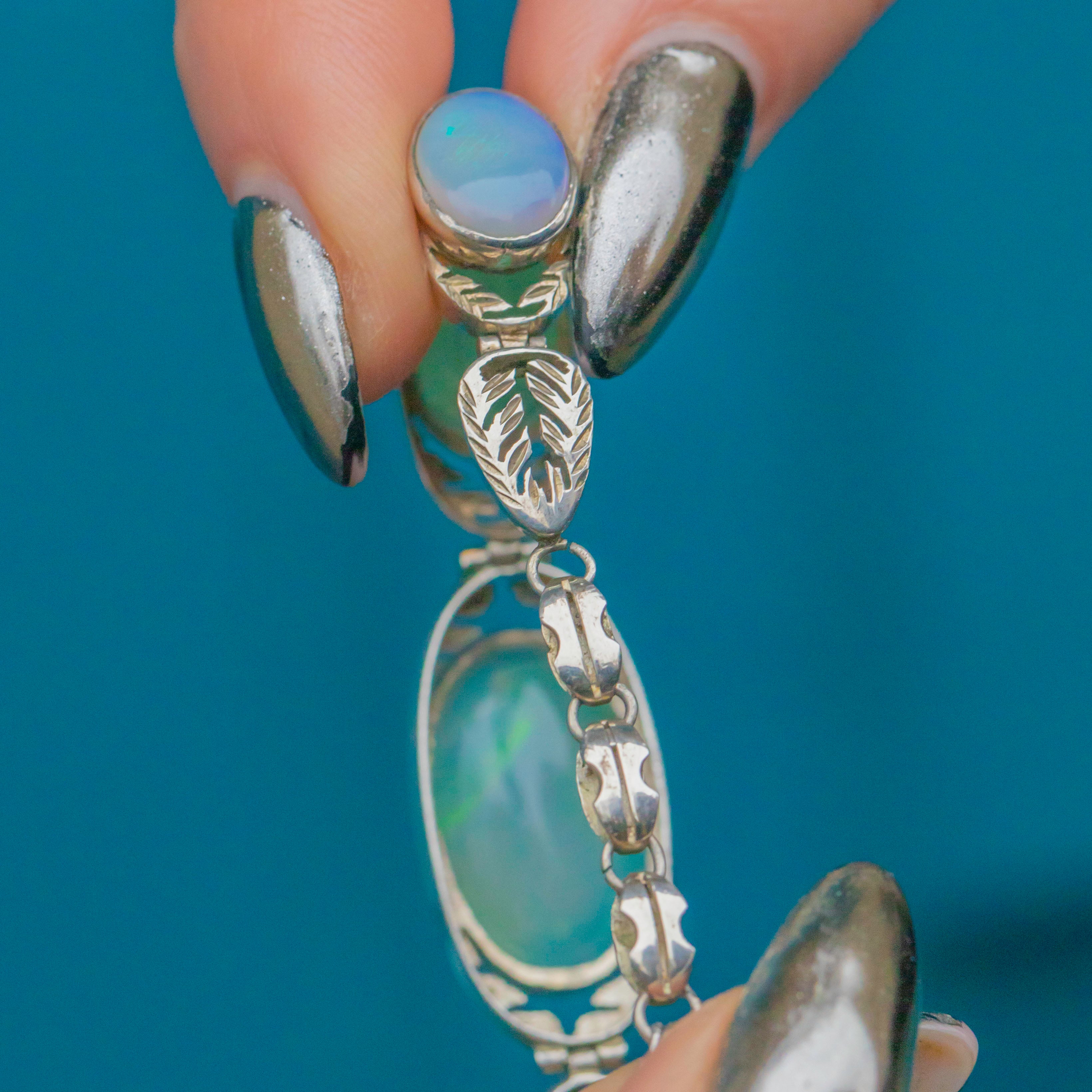 EXCELLENT. This Arts & Crafts Silver Opal cabochon bracelet is in excellent condition. The Silver links are robust and securely connected, having accrued a lovely patina with the details making them pop. The Opals are smooth and secure within their settings. Closing securely, you can wear this outstanding antique Opal bracelet with absolute confidence!