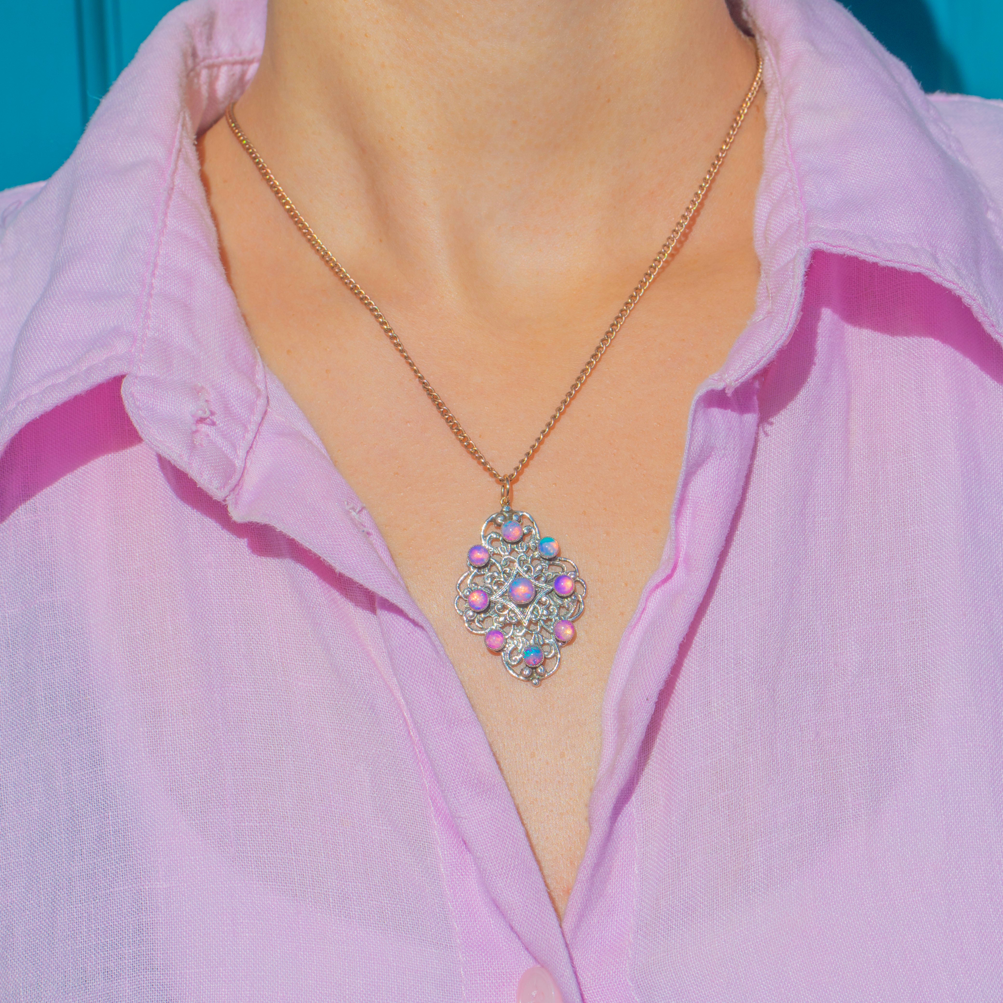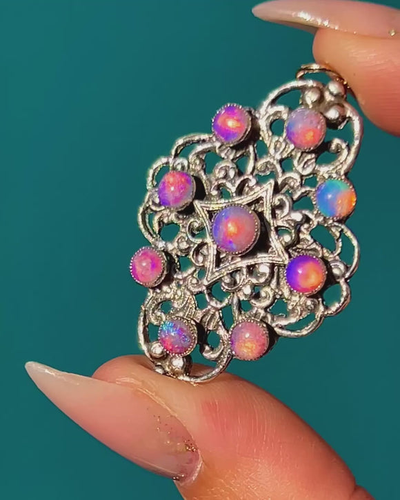 This charming Austro-Hungarian pendant is crafted in charming Silver filigree with a 9ct Gold jump ring, and set with glowing Pink "Dragon's Breath" Opaline glass! The stones display a delicate blush tone that shifts in the light, creating a soft and ethereal appearance. They are arranged in an ornate Silver frame, showcasing the decorative craftsmanship for which Austro-Hungarian jewels are celebrated.