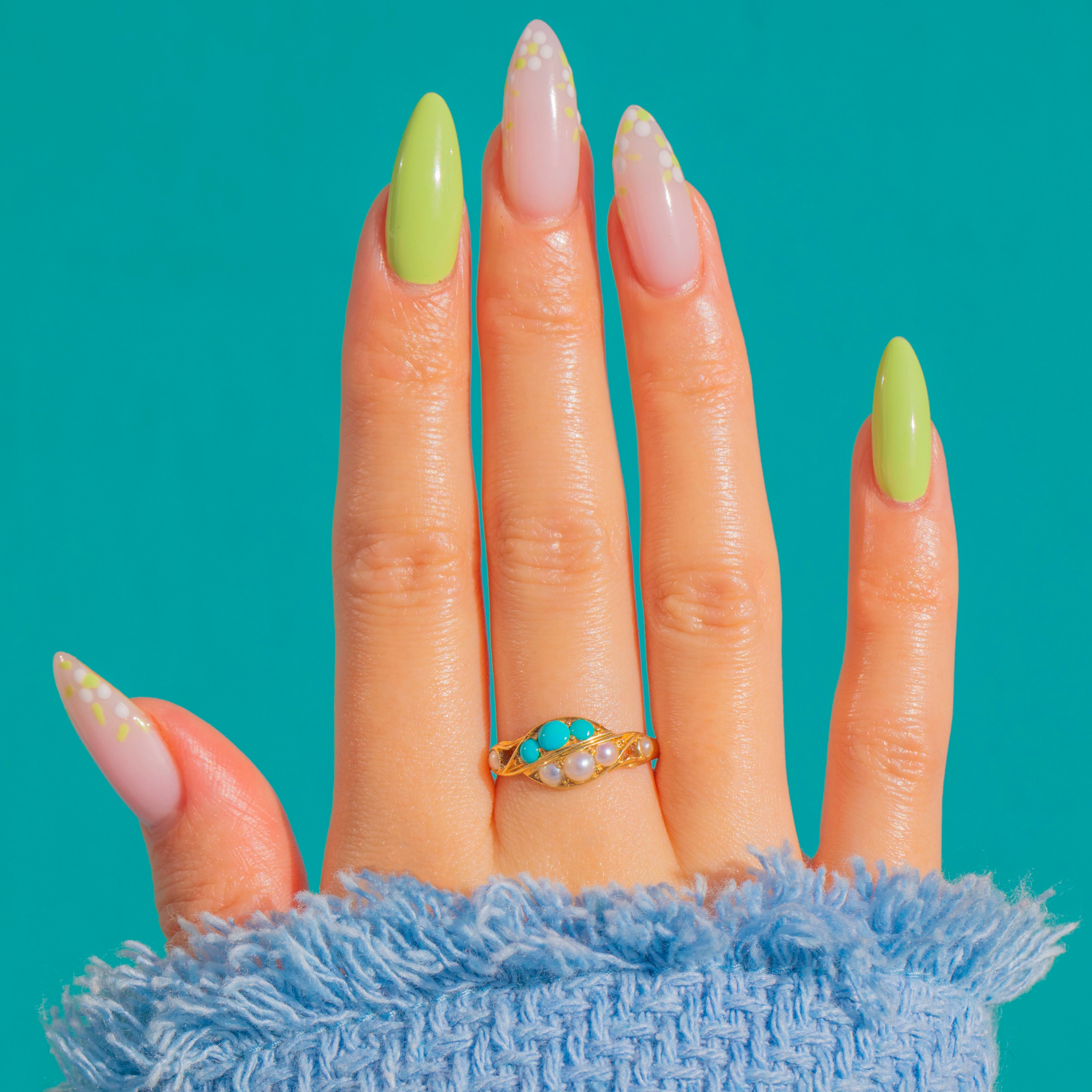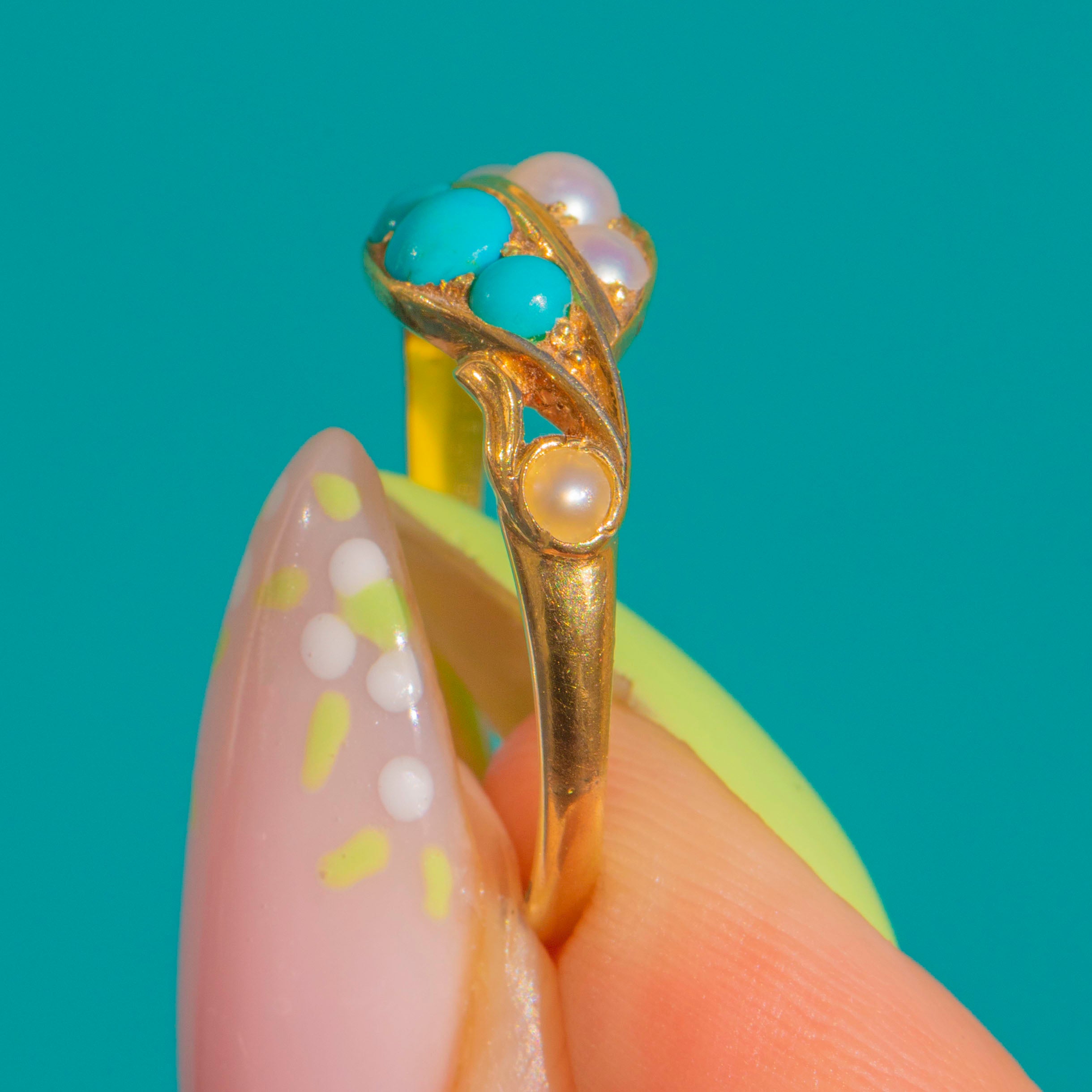 EXCELLENT: Stones are bright and secure with lovely lustre to the Pearls; under magnification, one Turquoise shows a minute abrasion that does not detract from wear. The 18ct Gold settings and slim shank show light, age-appropriate surface wear only, with crisp pierced and foliate detail. No obvious signs of resizing or restoration; a trace of old residue is visible inside one closed-back cup, noted for completeness.