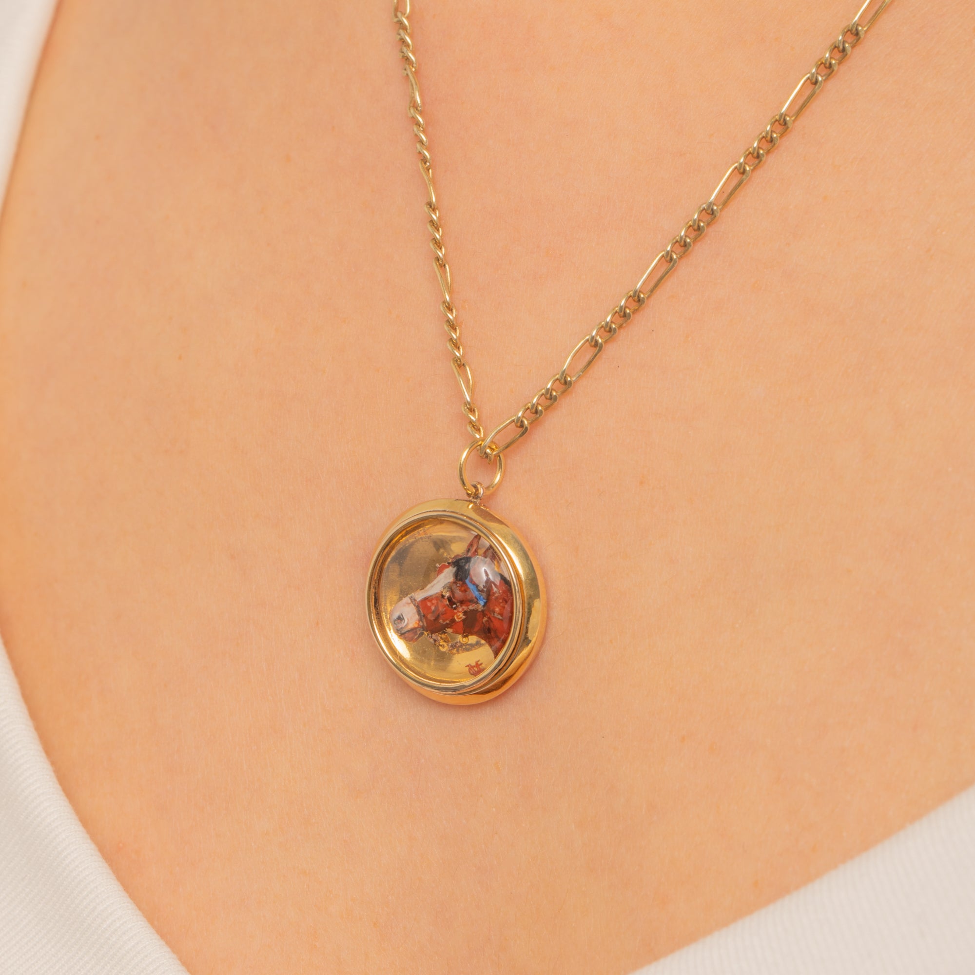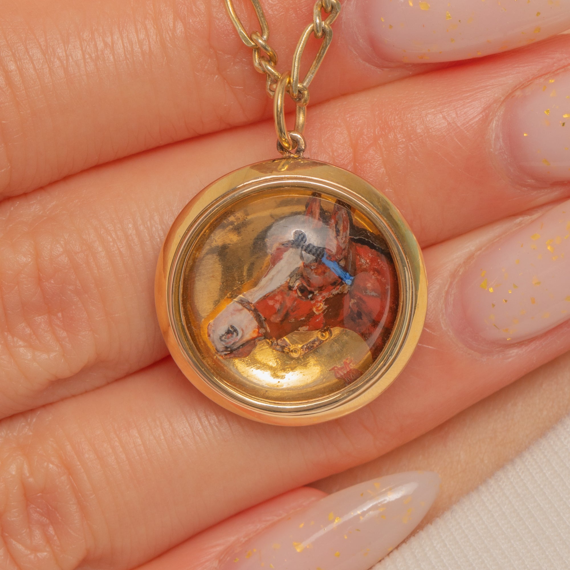 EXCELLENT: The Essex Crystal dome is bright with only light surface scratches and natural age-related abrasions; no chips or cracks observed. The painted equestrian miniature remains crisp with minimal wear, with a small area of age-related softening near the muzzle. The 15ct Gold bezel and jump ring are secure with gentle surface wear; solder at the bail is visible and stable. Overall, well cared for and beautifully preserved.