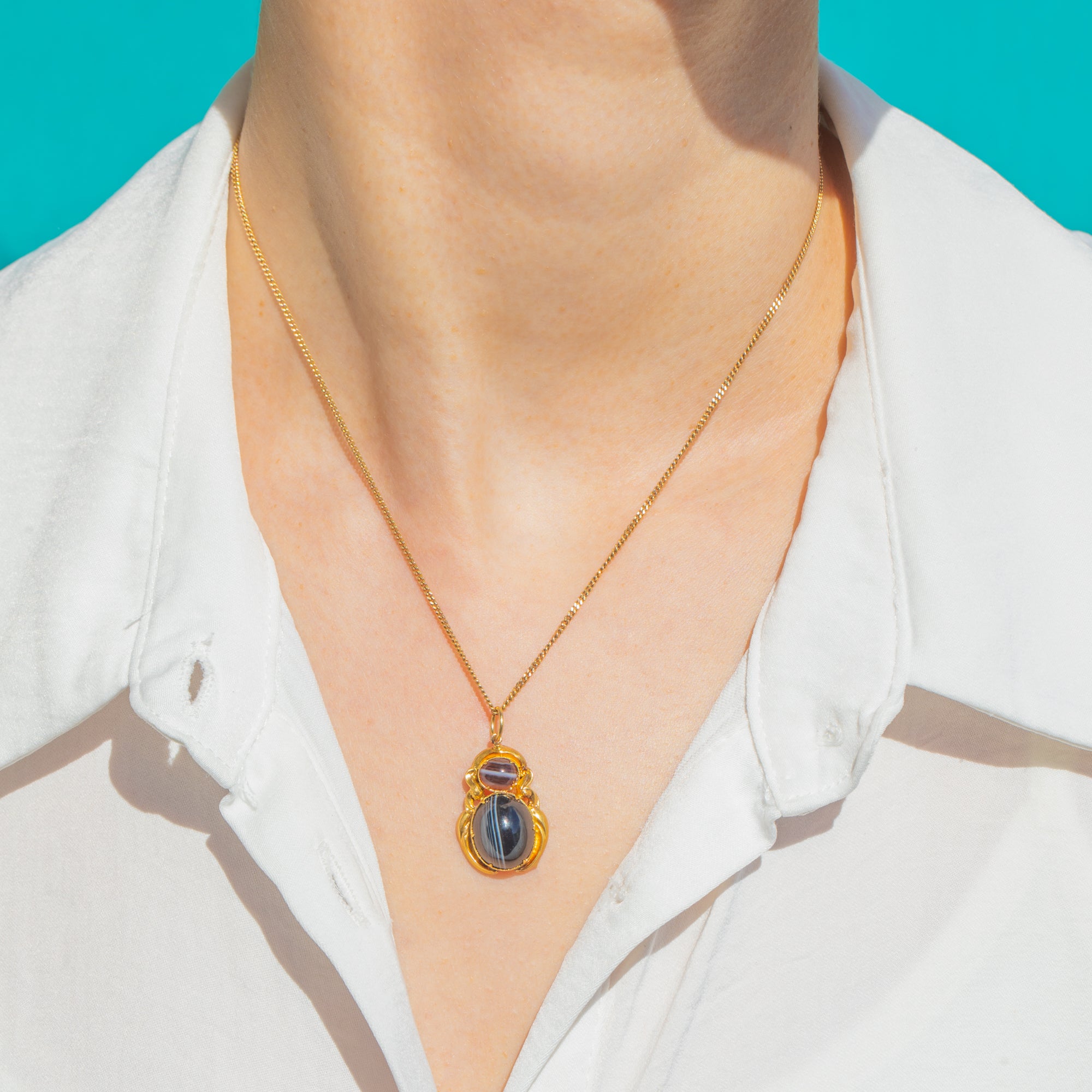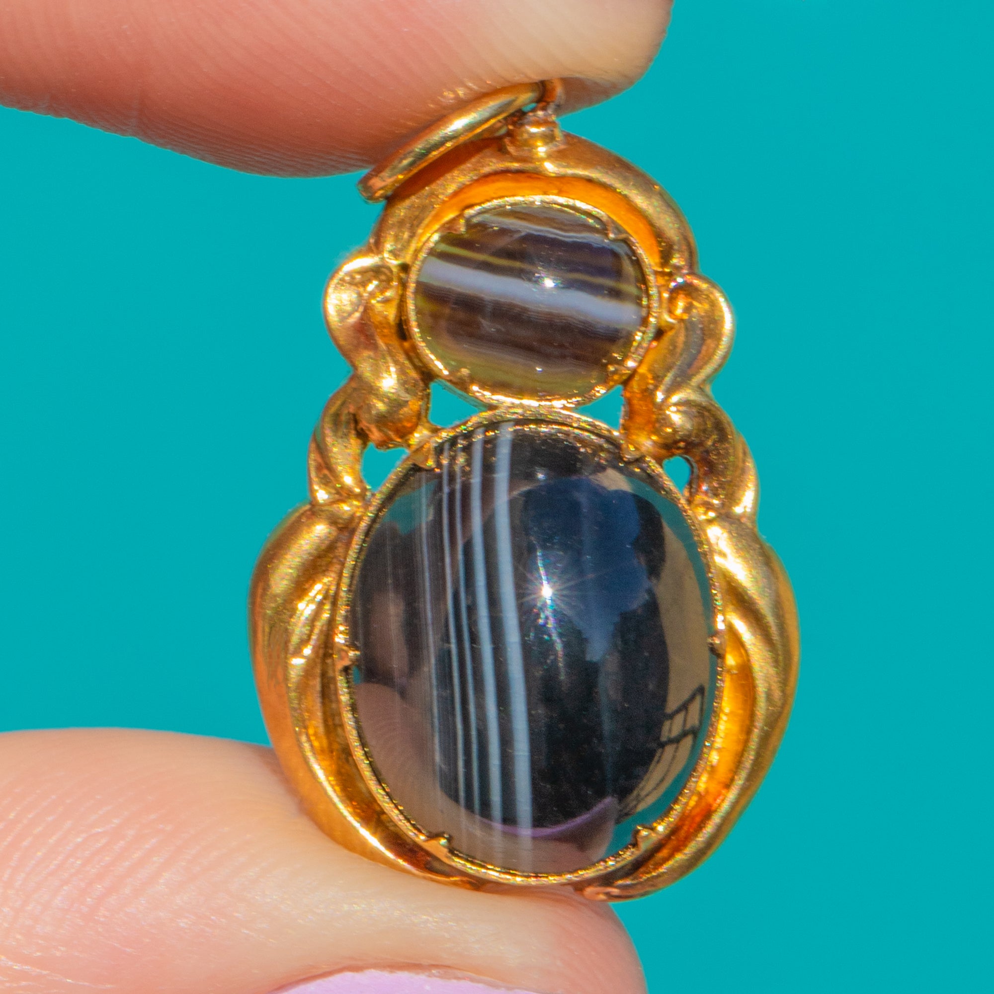 A chic Georgian treasure in rich 18ct Gold, this elegant pendant showcases a vertical duet of polished Agate cabochons. The larger, banded oval below contrasts beautifully with the smaller domed cabochon above, their natural striations and translucency adding depth and drama.