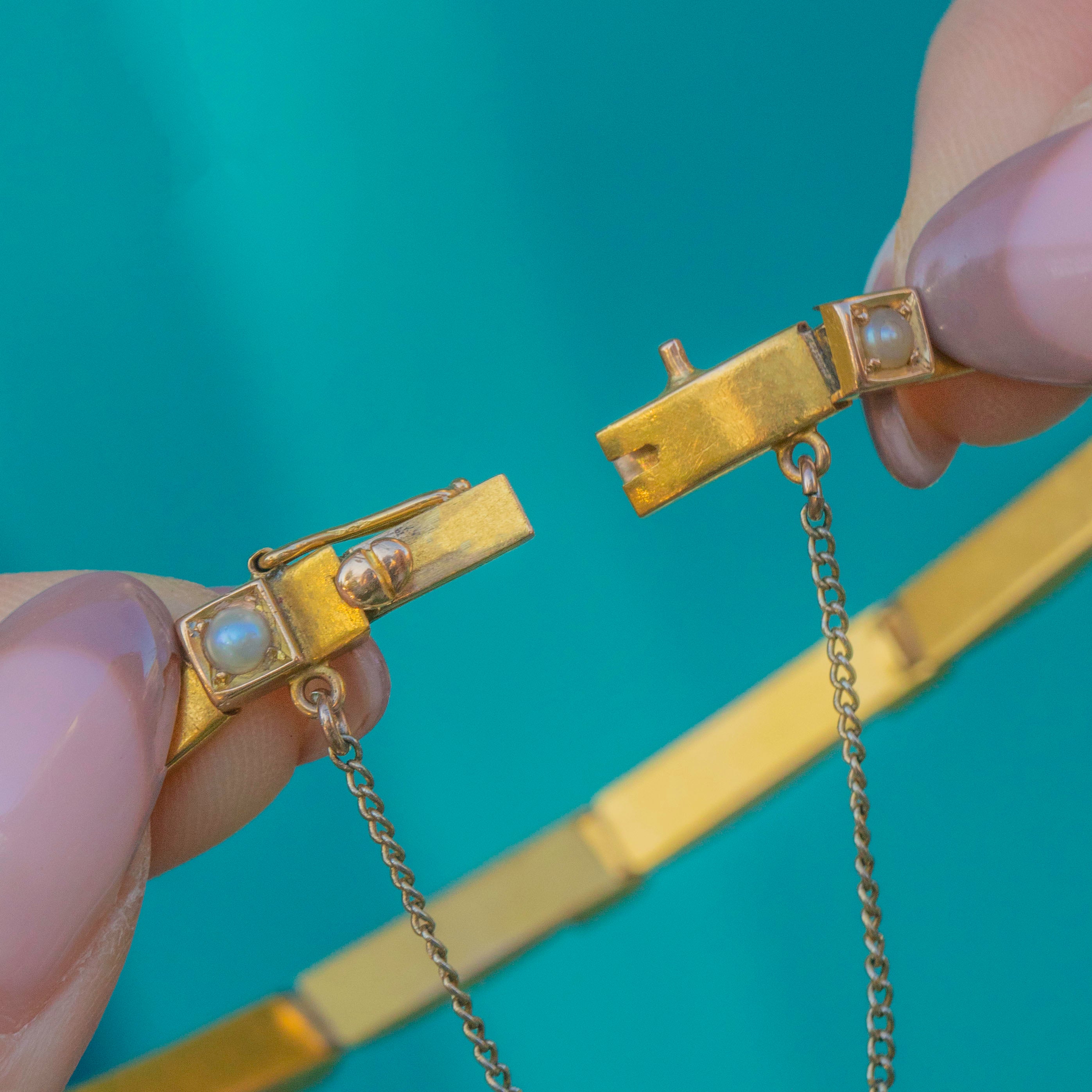 This chic antique 18ct Gold Pearl bracelet captures the elegance of a bygone era with her finely crafted design of alternating Pearls and 18ct Gold bar links. Her 18ct Gold has a luxurious, saturated tone, you could easily see her placed delicately around the wrist of a regal queen.