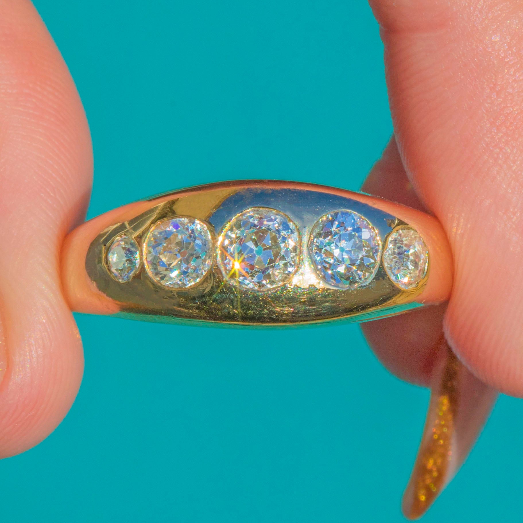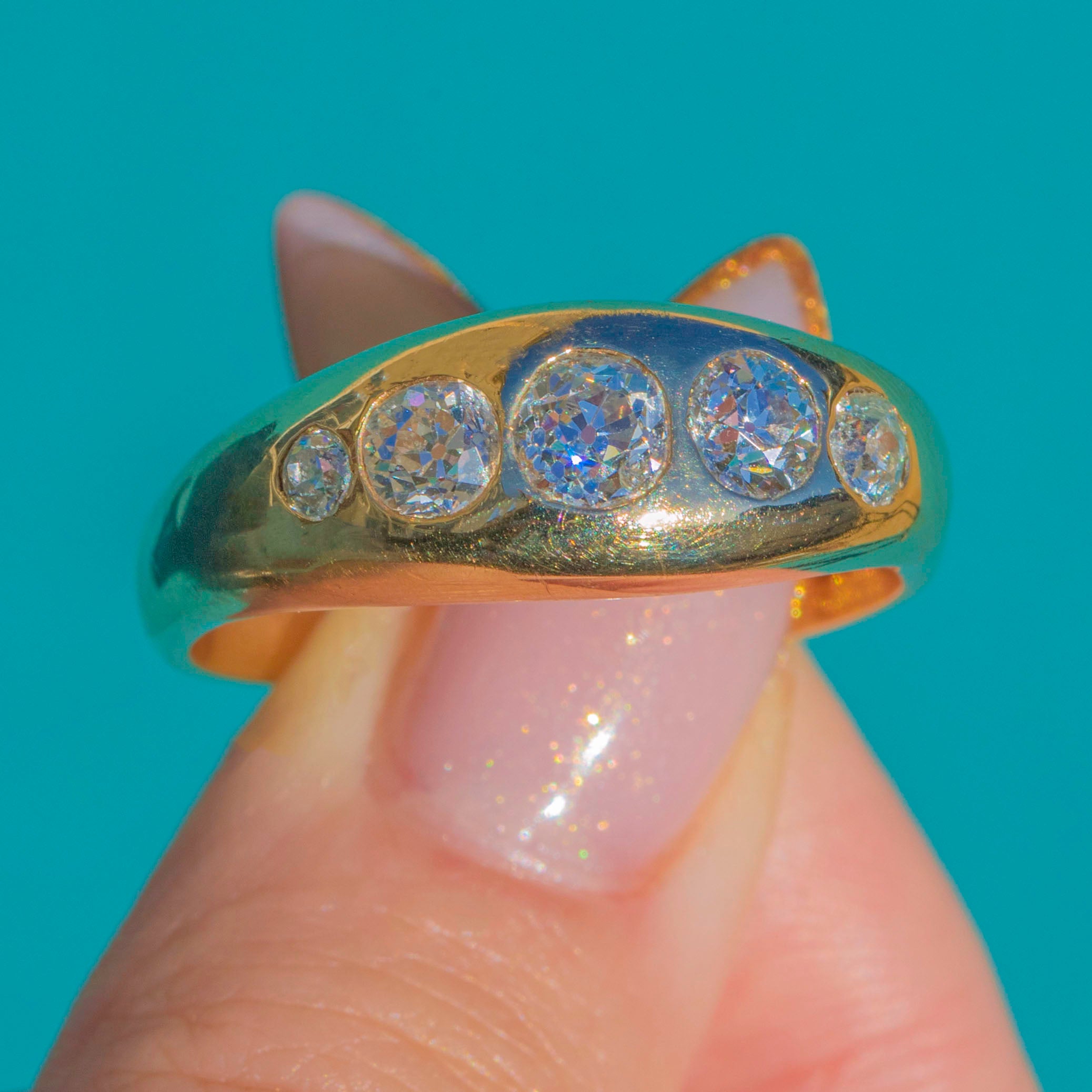 The graduated arrangement of stones gives the ring a strong, sculptural presence, with a central Diamond of approximately 0.45ct framed by a pair of 0.30ct stones and two outer accent Diamonds. The smooth, weighty Gold enhances their sparkle, creating a sleek and luxurious everyday statement piece.